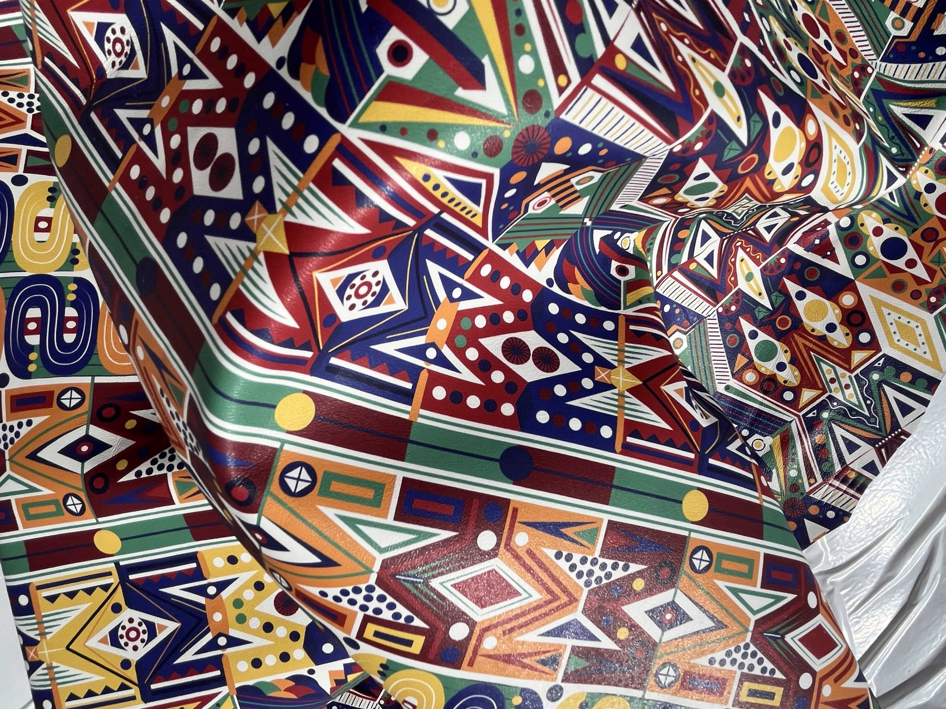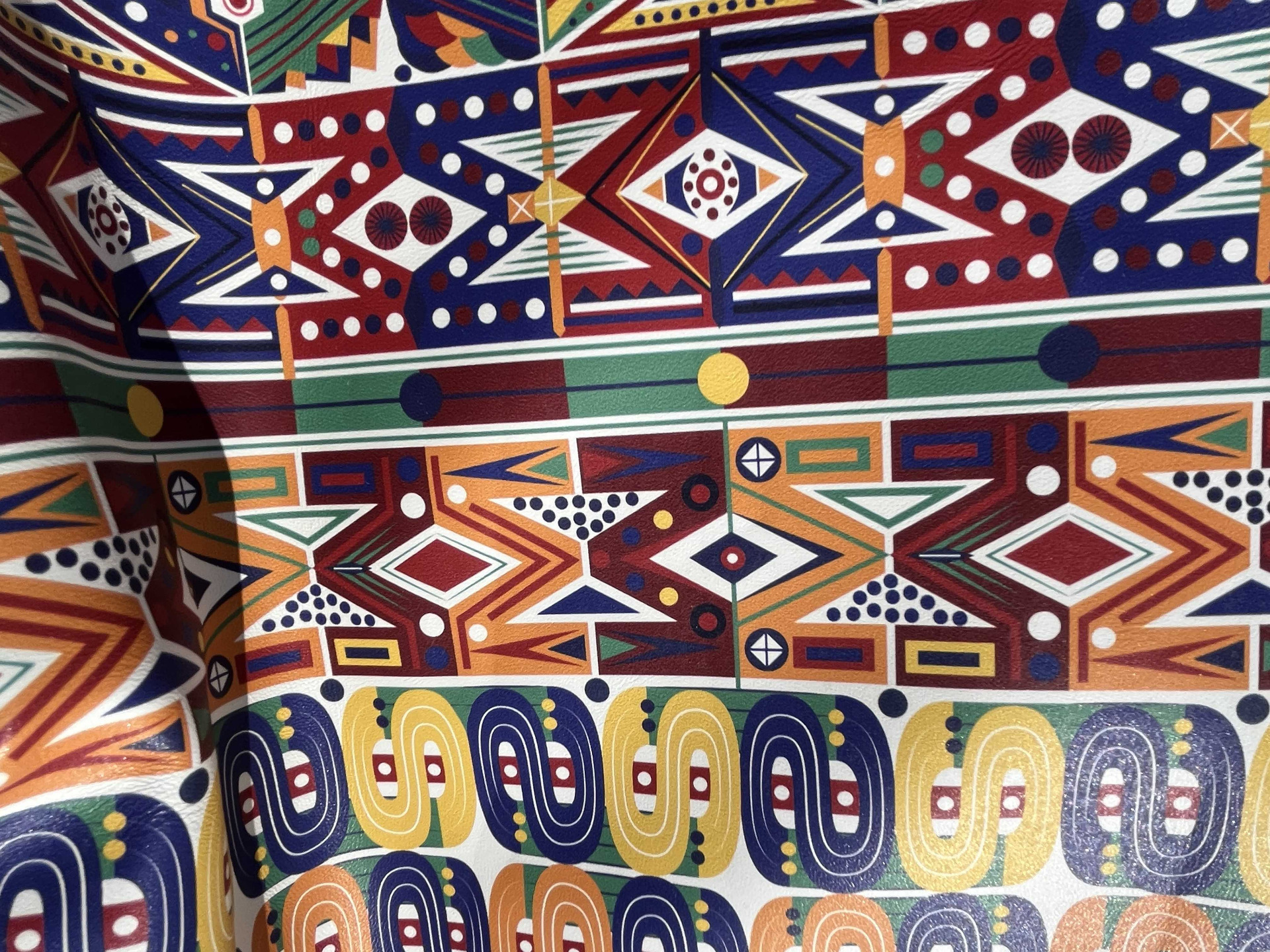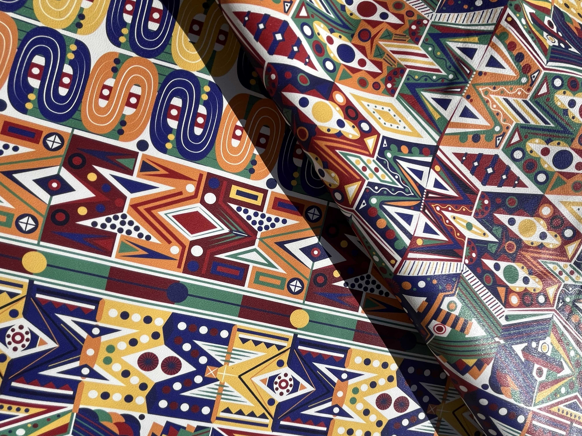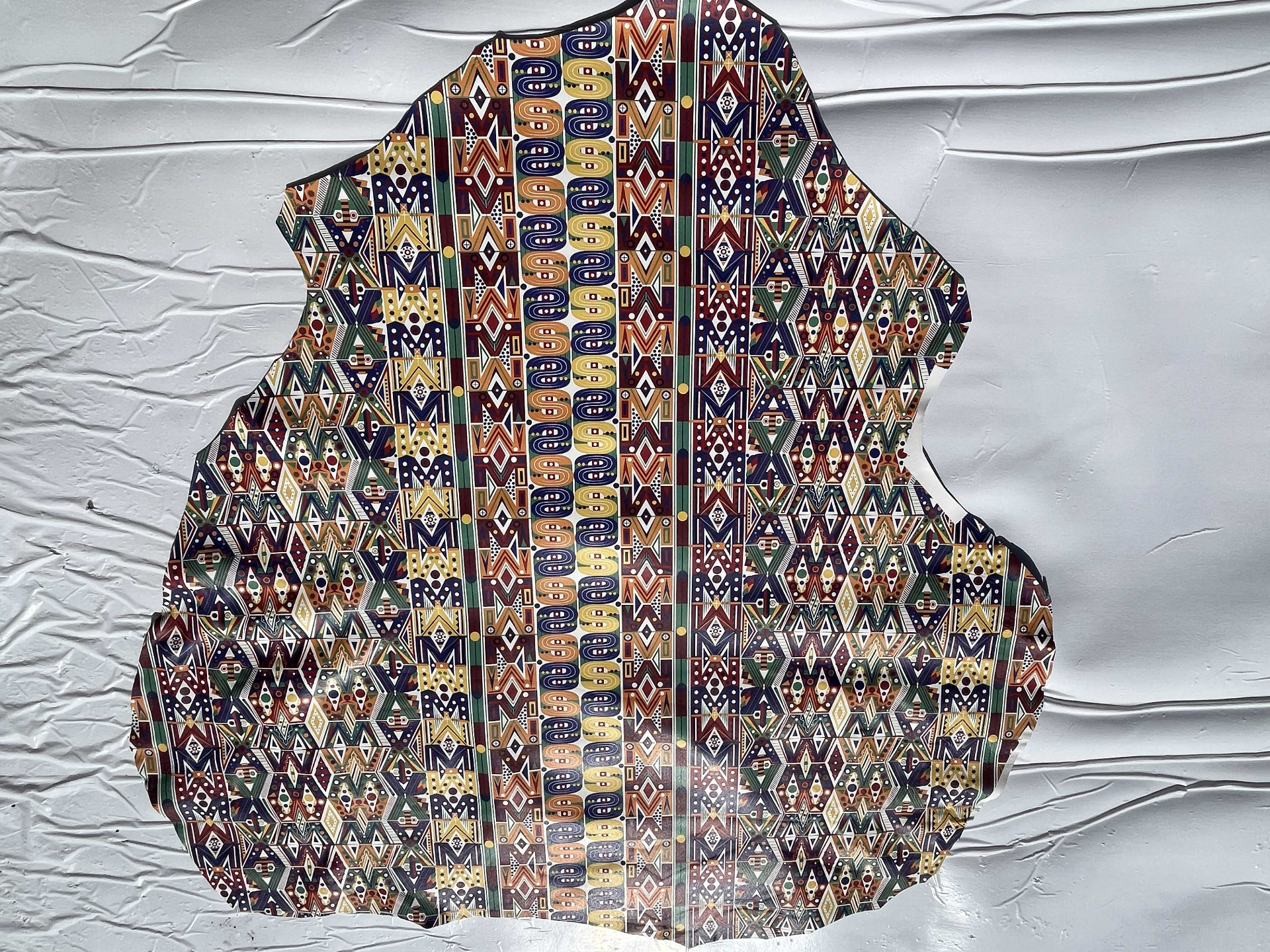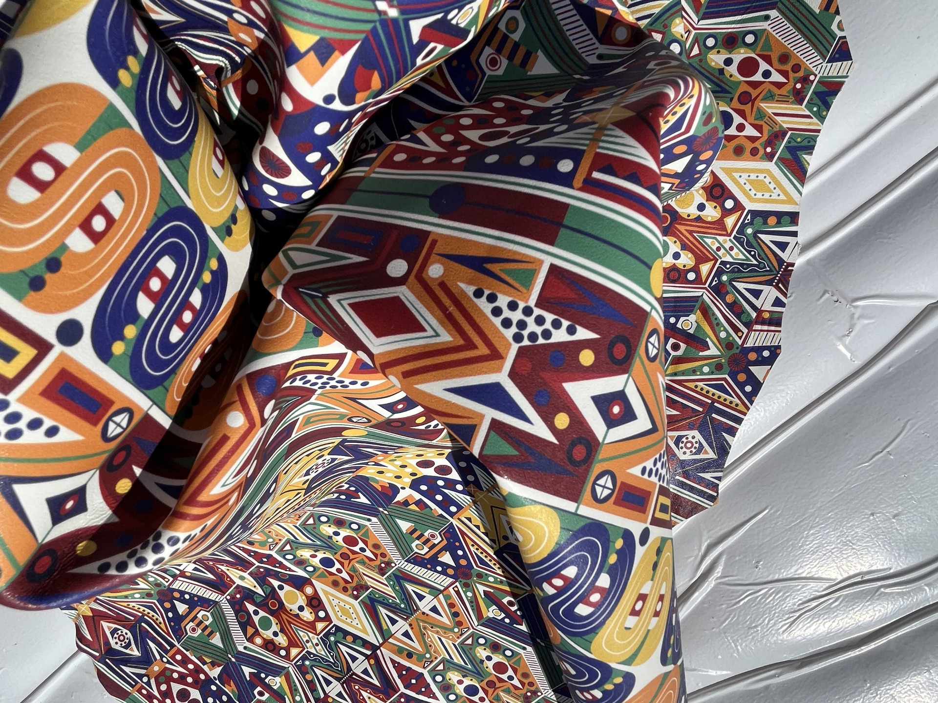 Pellame ovino liscio stampa fantasia multicolor su fondo bianco, morbido nappato e di alta qualità per la produzione di pelletteria e calzature artigianali, borse, borselli, cartelle, zaini, portachiavi, legatoria, ballerine, decolté, sandali e molto altro.