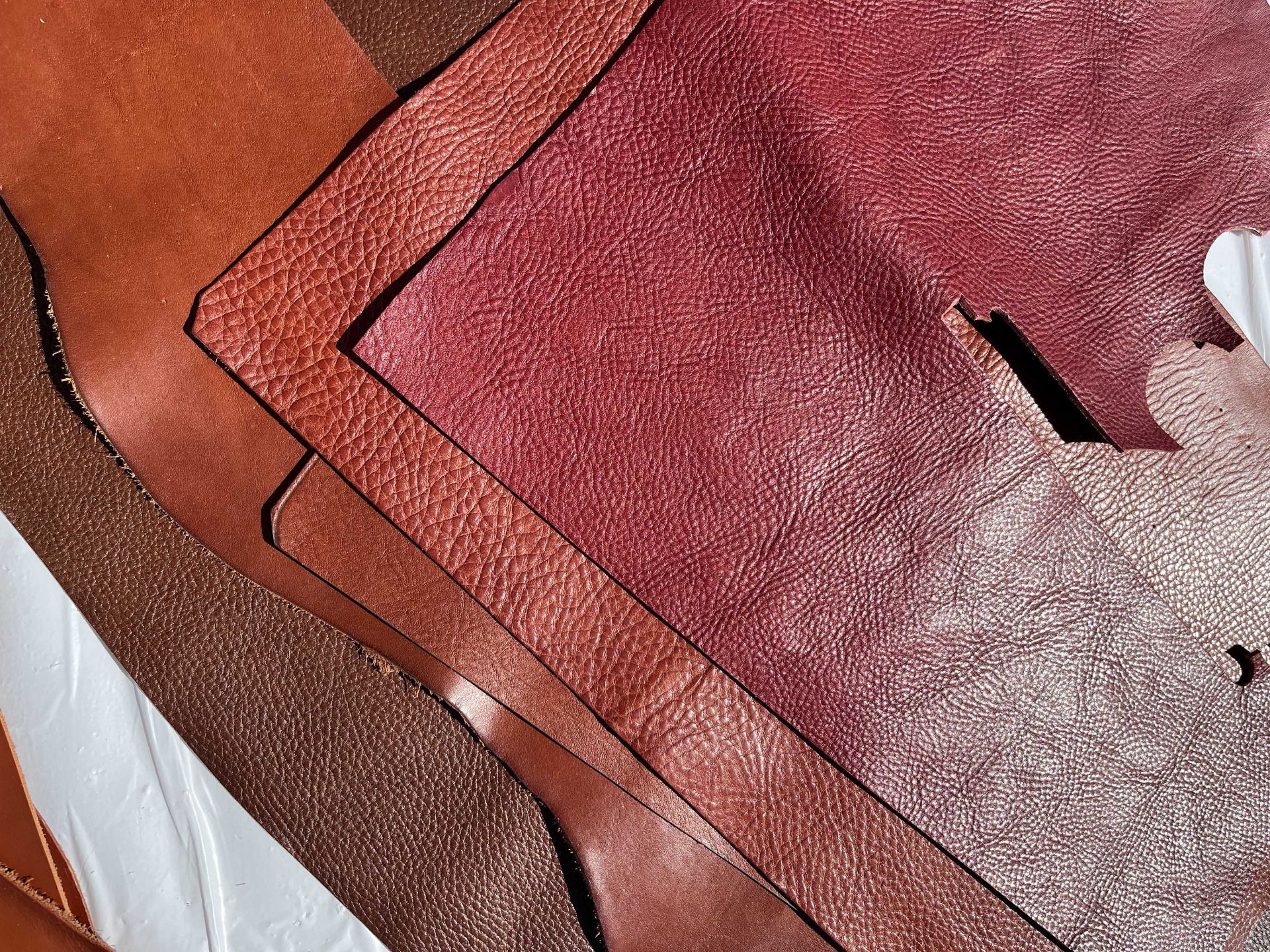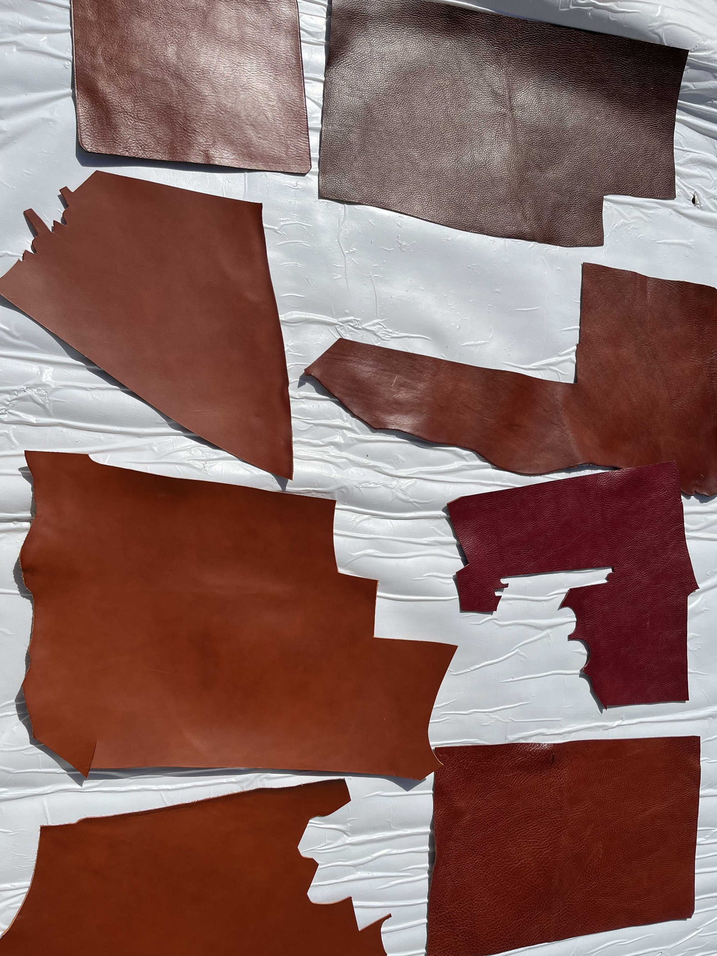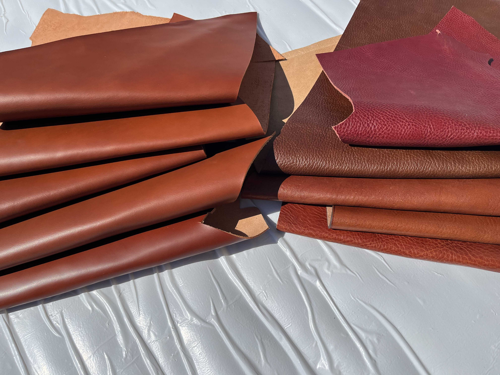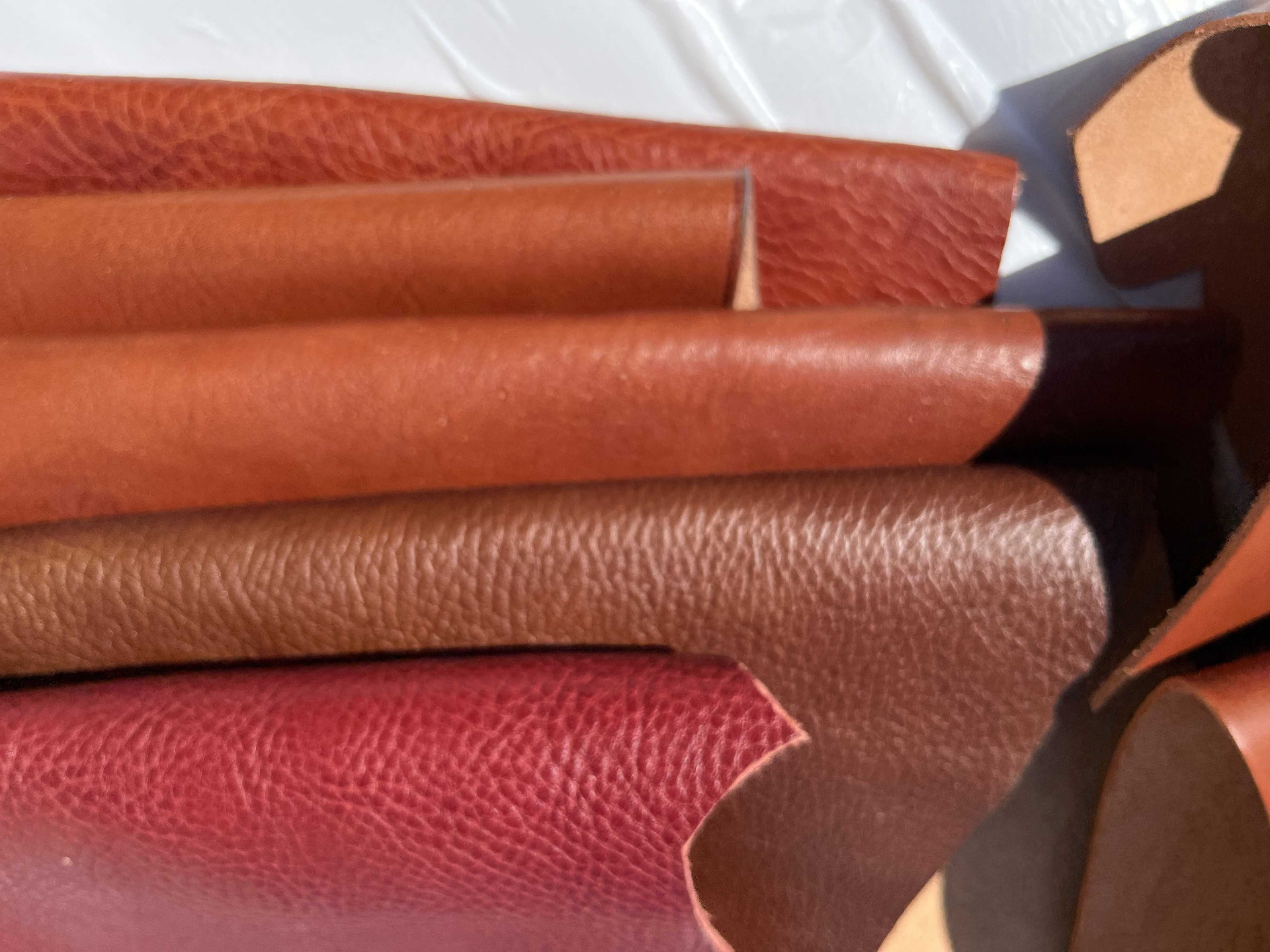 Cartone da 10 pezzami in cuoio assortiti di grandi dimensioni, colori brandy, nocciola e bordò, cinque pezzi di pelli liscia e cinque pelli martellate, causa del differente display del pc e della luminosità, colori online potrebbero essere leggermente diversi dai colori reali.