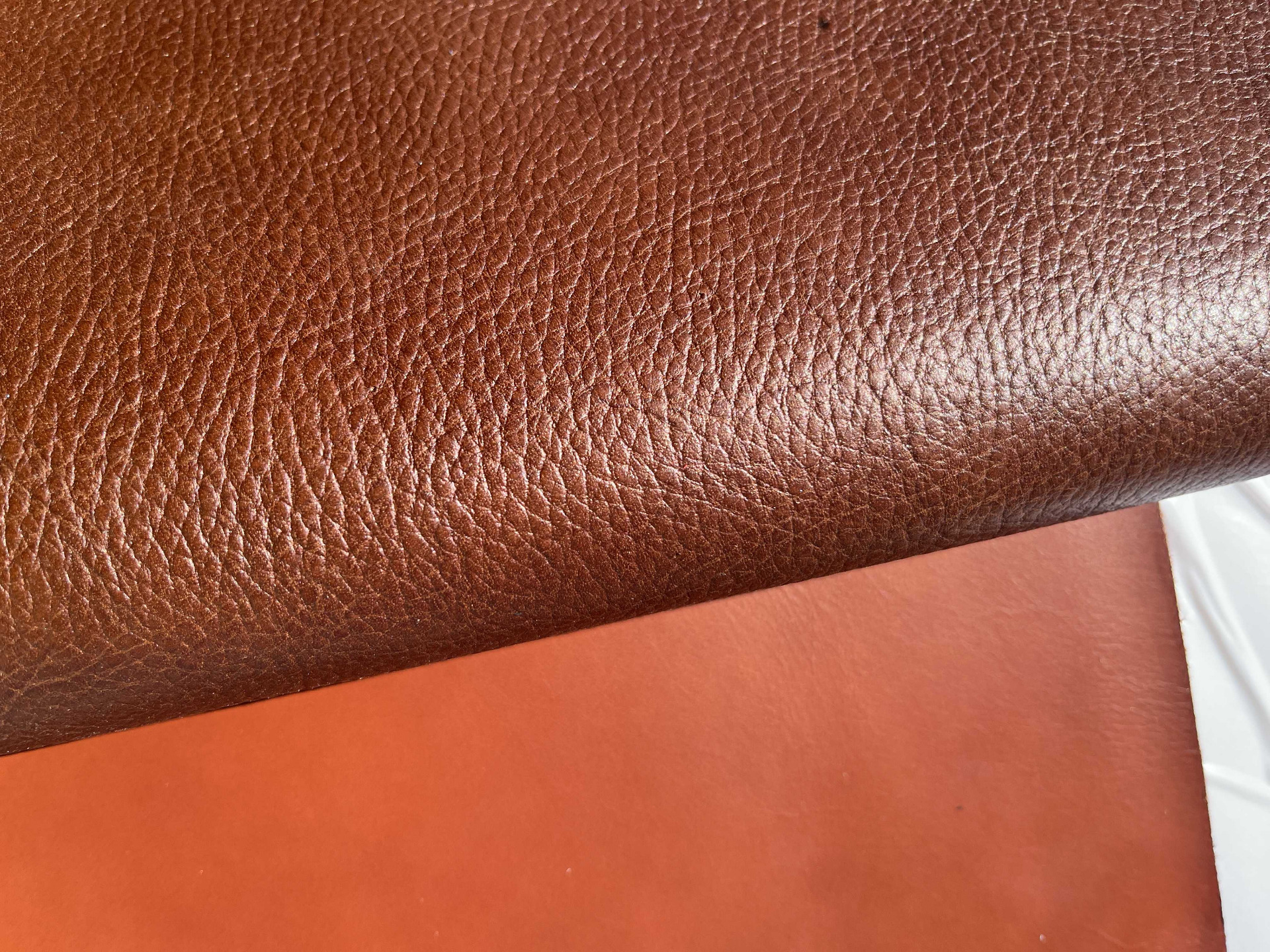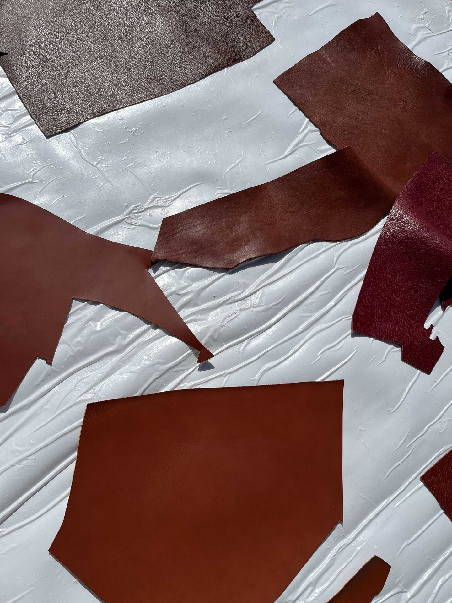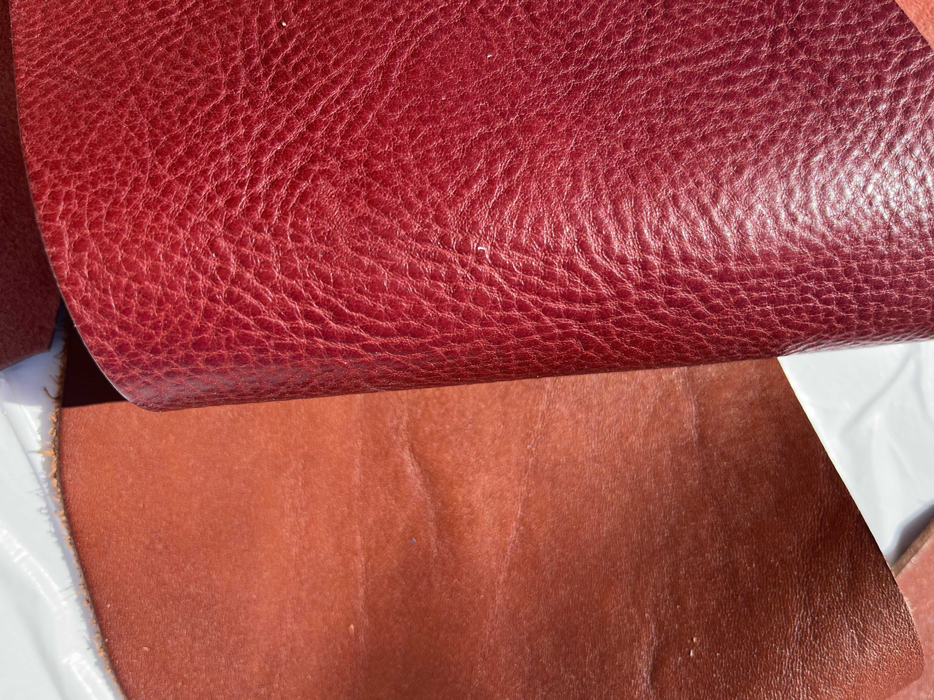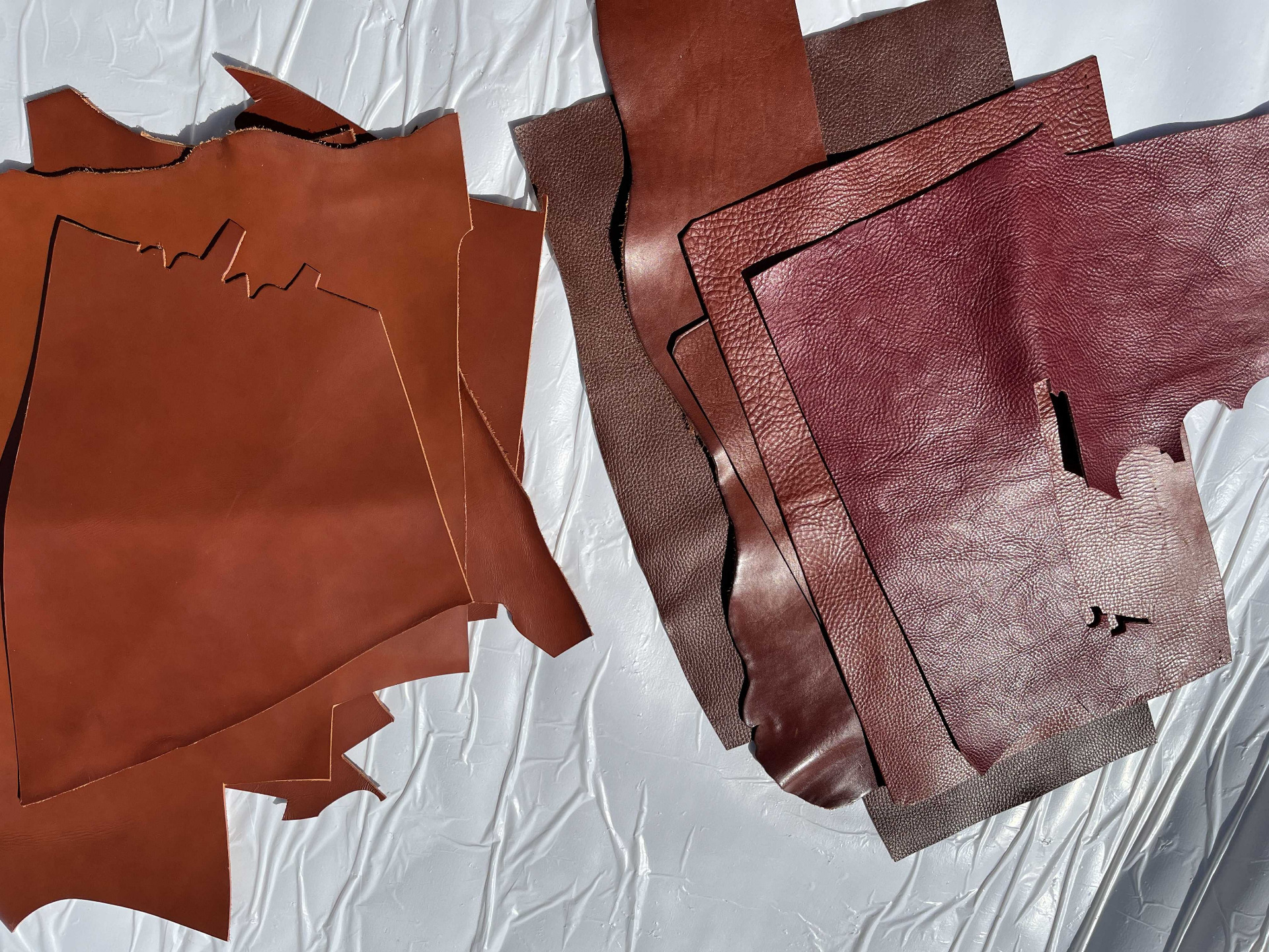 Cartone da 10 pezzami in cuoio assortiti di grandi dimensioni, colori brandy, nocciola e bordò, cinque pezzi di pelli liscia e cinque pelli martellate, causa del differente display del pc e della luminosità, colori online potrebbero essere leggermente diversi dai colori reali.