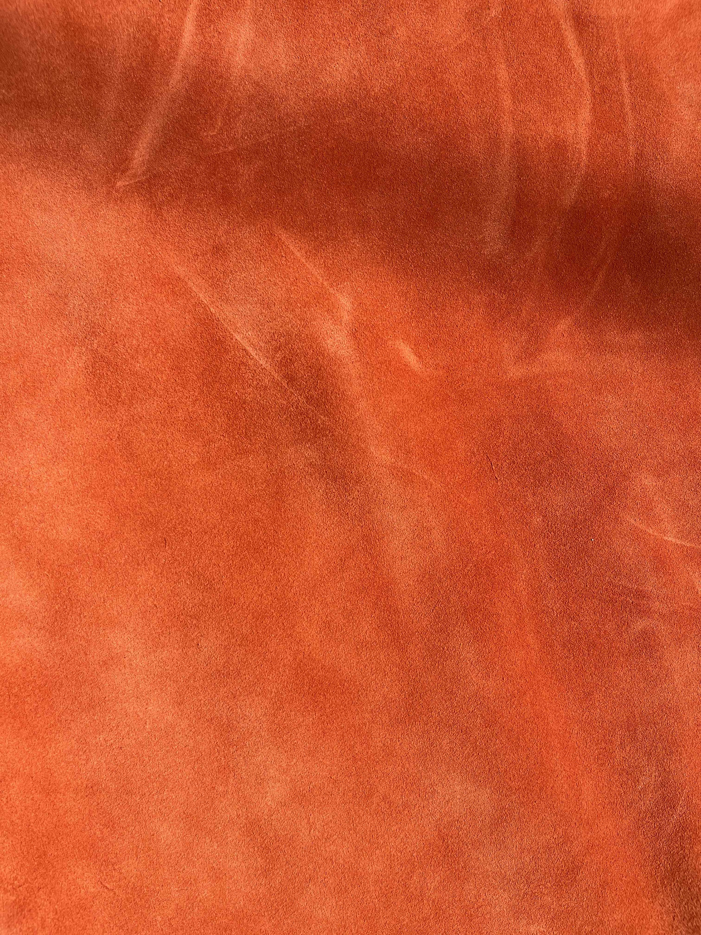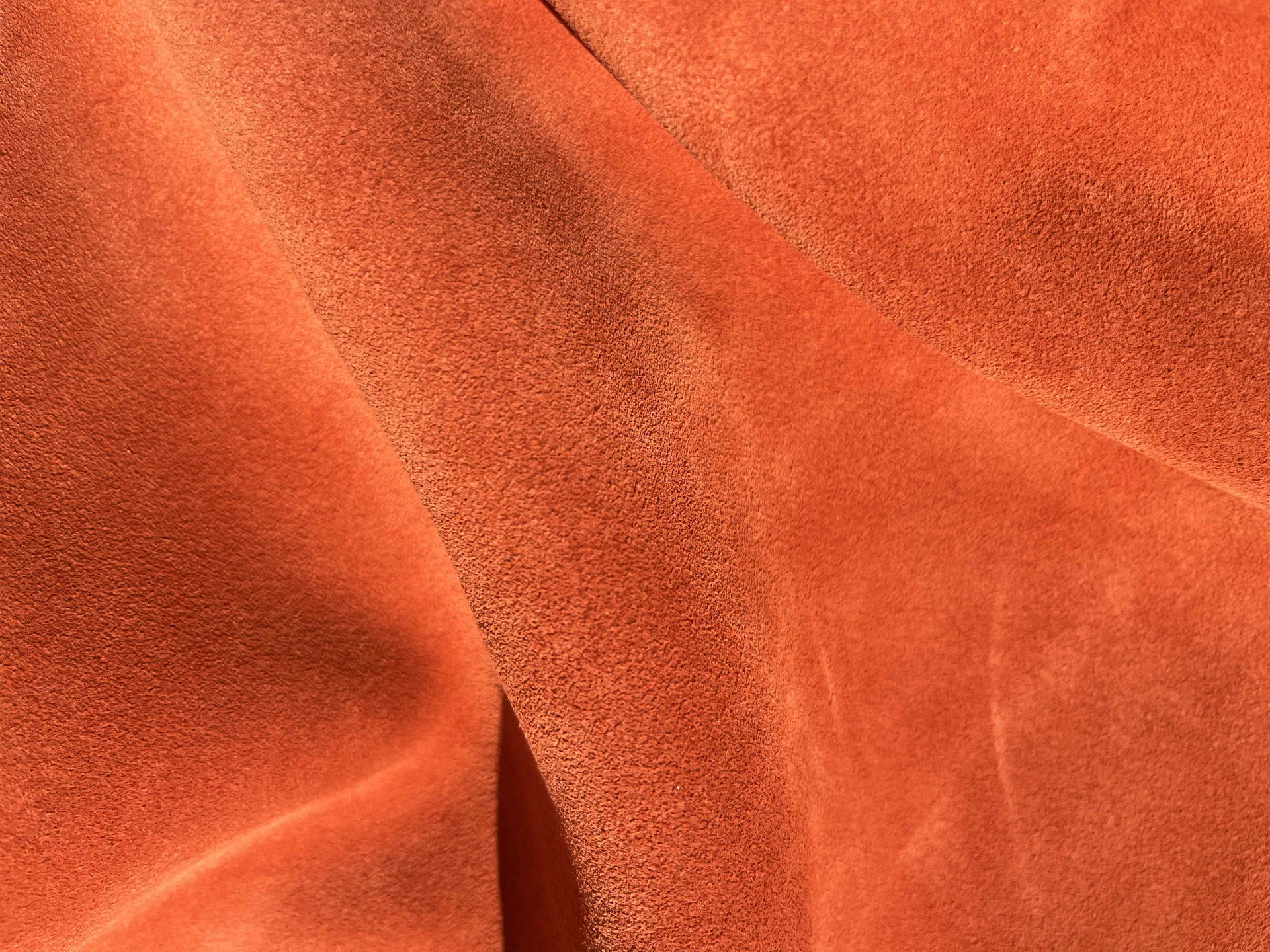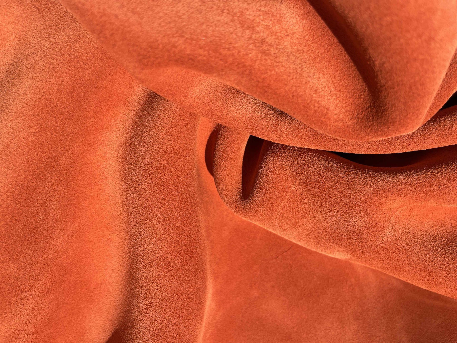 Pellame scamosciato colore Arancione di alto spessore, mano vellutata, particolarmente scrivente e brillante, ideale per piccoli progetti di pelletteria, borse, portafogli, portachiavi, braccialetti, articoli per animali e molto altro.