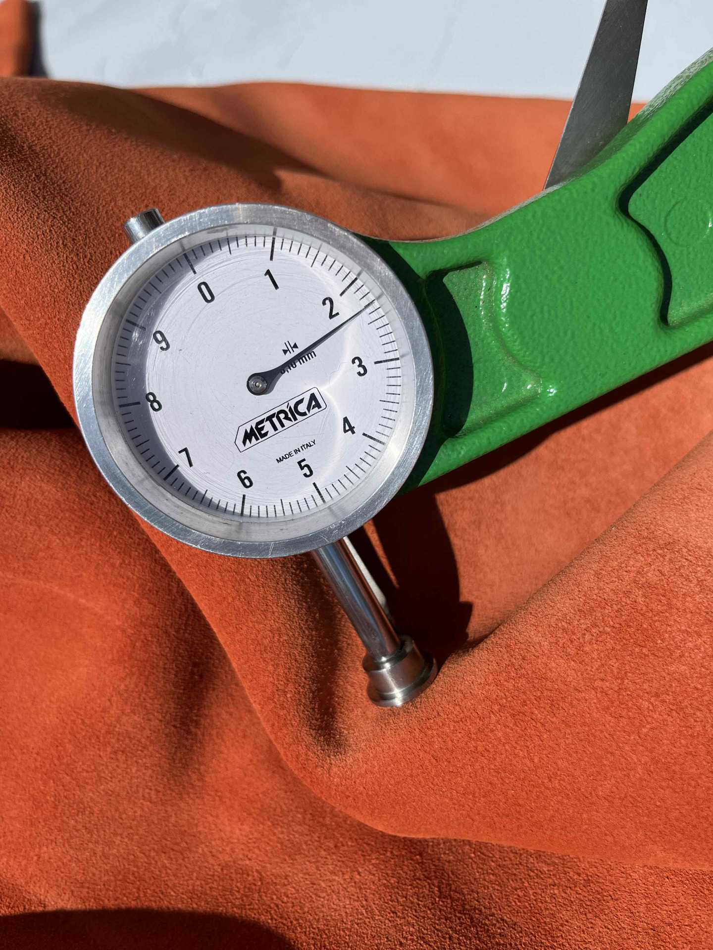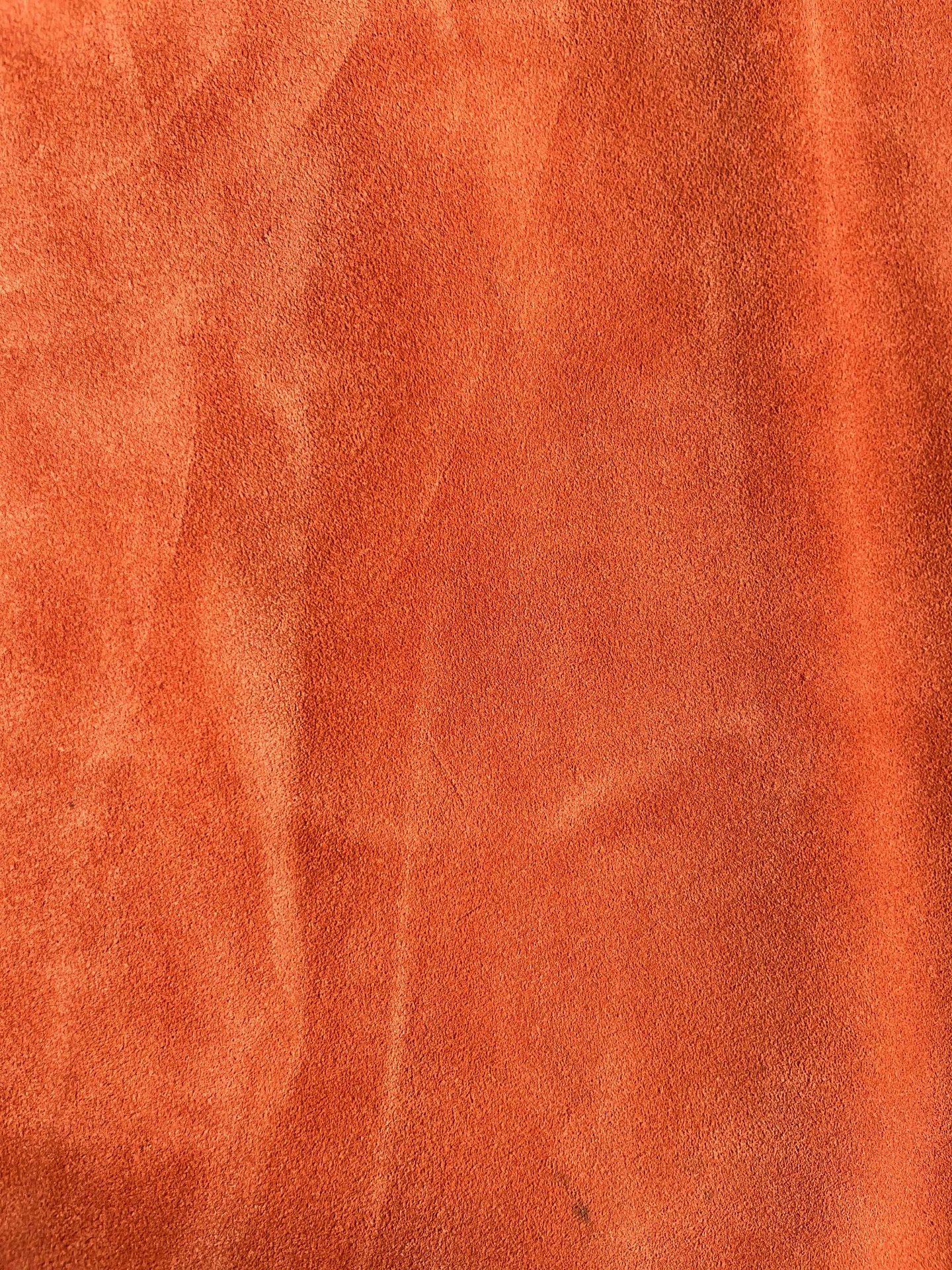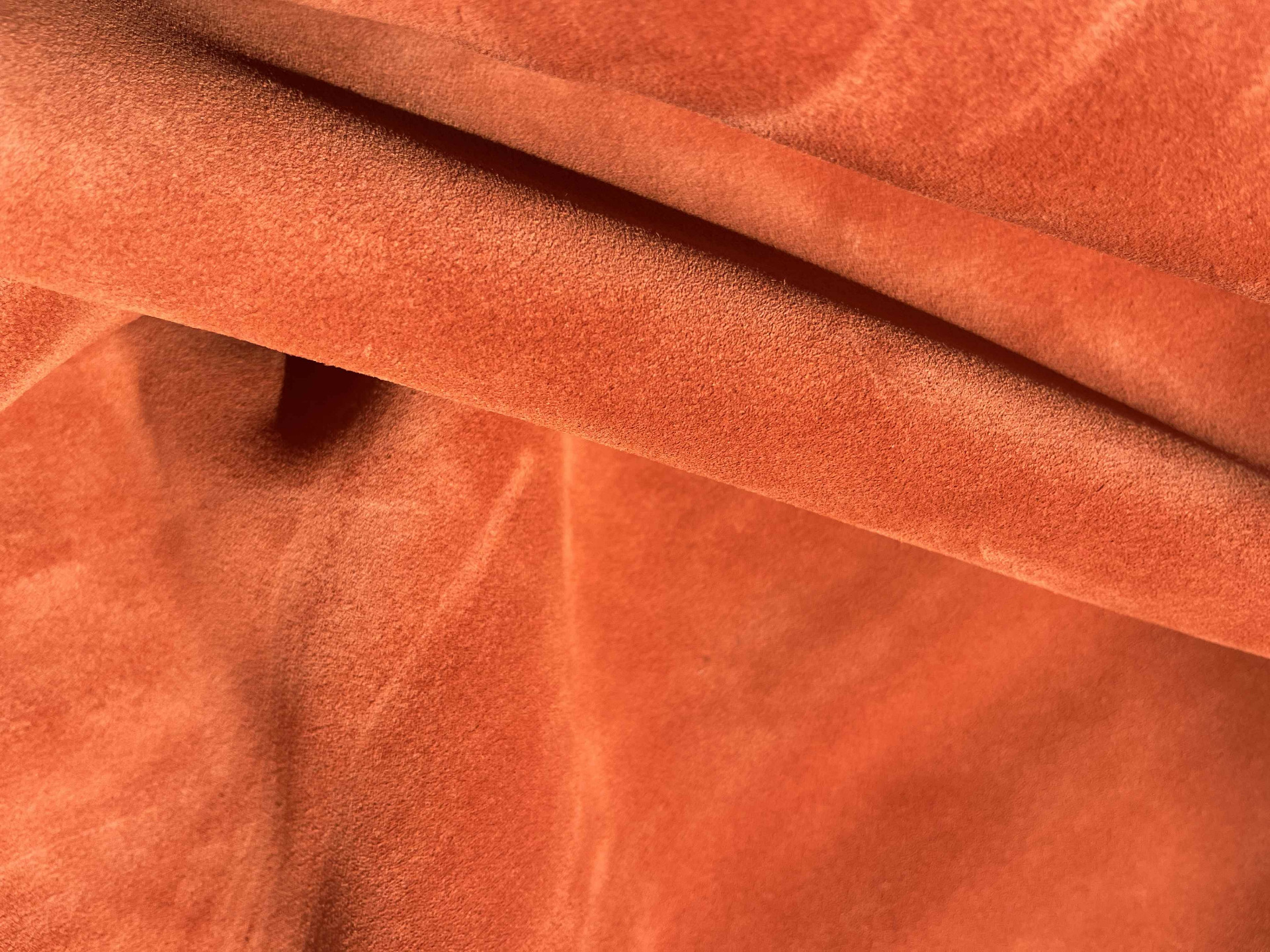 Pellame scamosciato colore Arancione di alto spessore, mano vellutata, particolarmente scrivente e brillante, ideale per piccoli progetti di pelletteria, borse, portafogli, portachiavi, braccialetti, articoli per animali e molto altro.