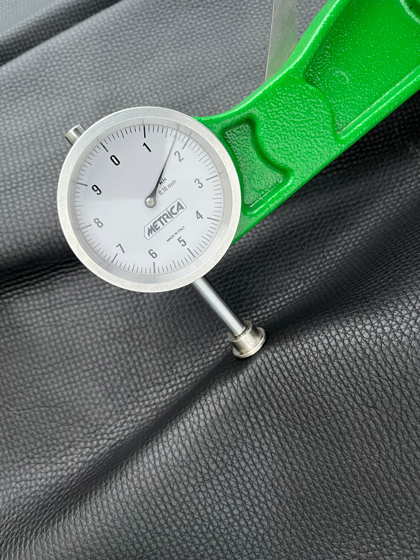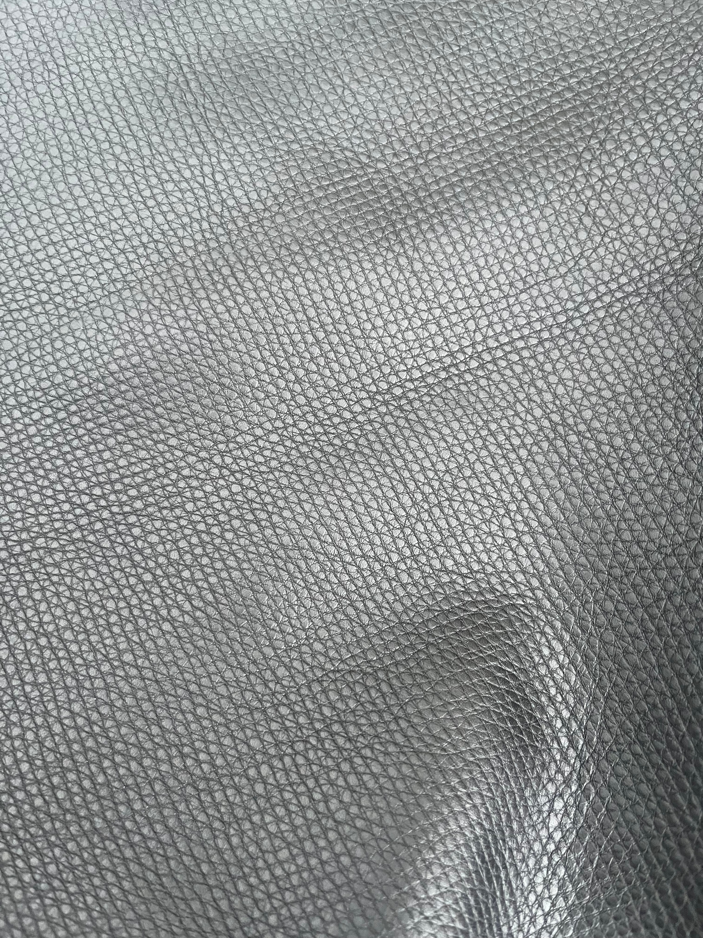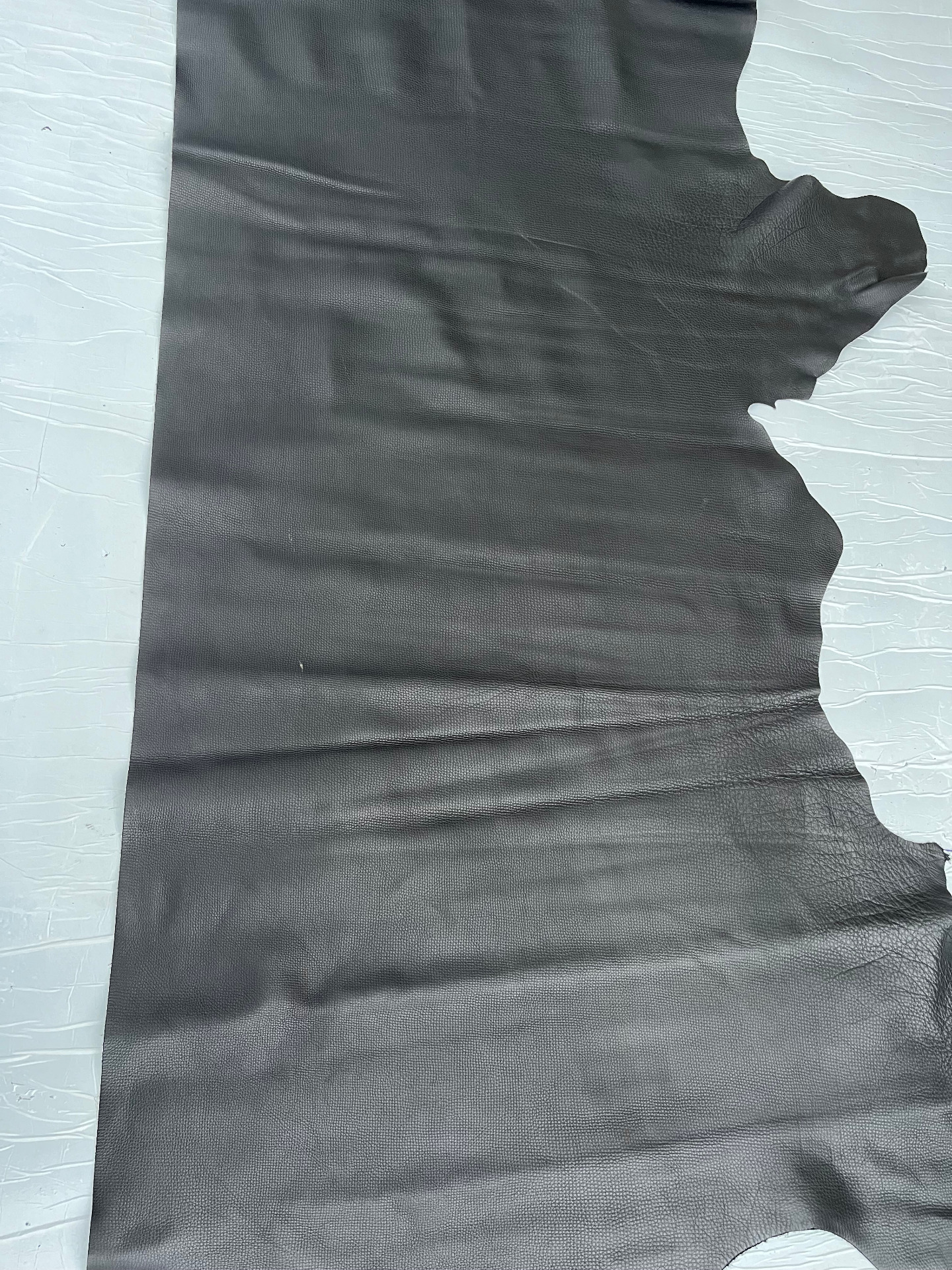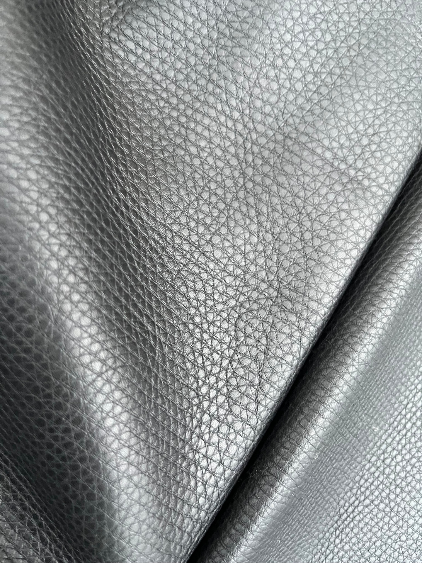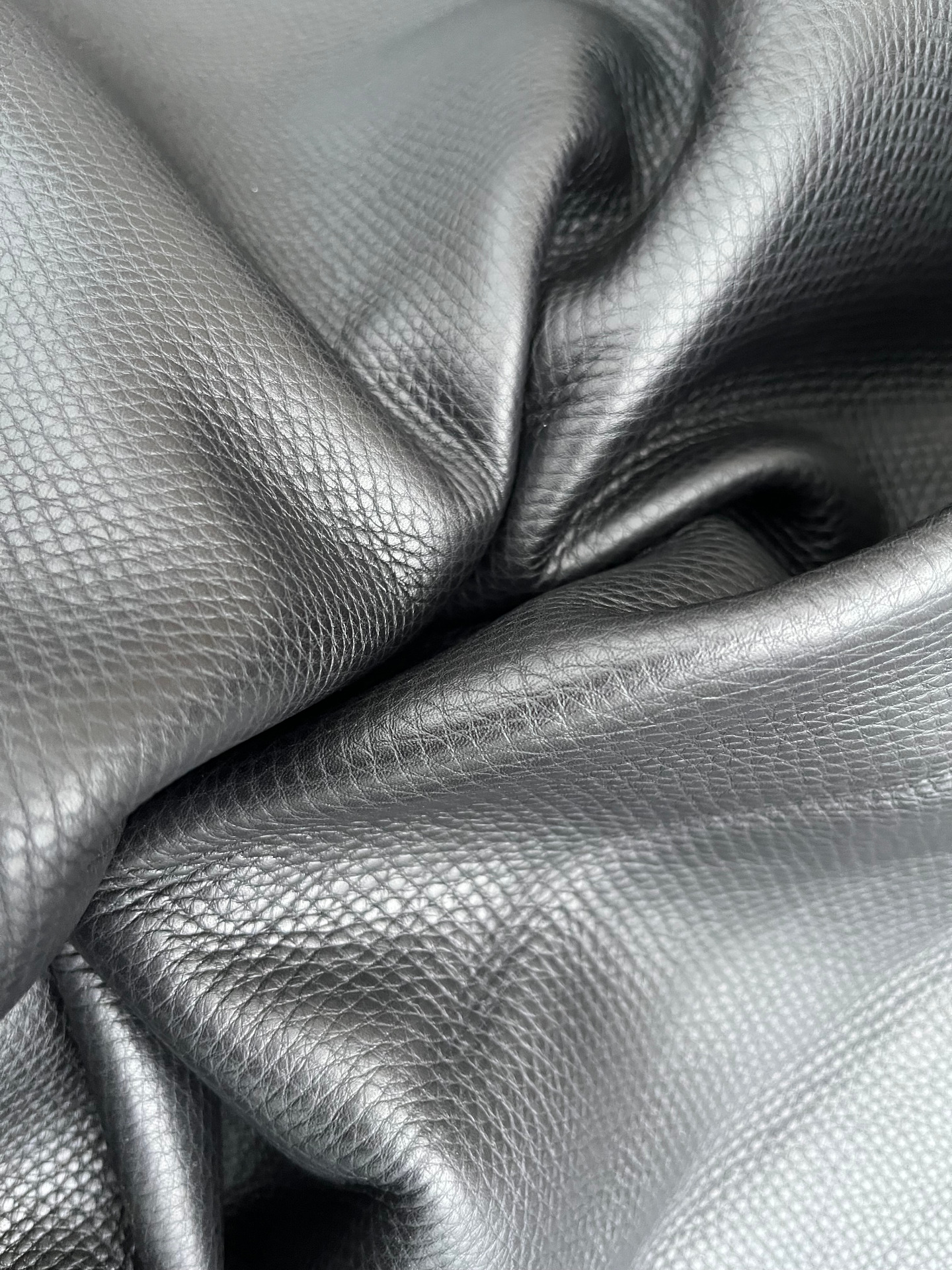 Pellame di vitello colore nero, finitura anilina semilucida, bottalato con una bellissima stampa a trama, morbida al tatto per la produzione di pelletteria, calzature e molto altro.