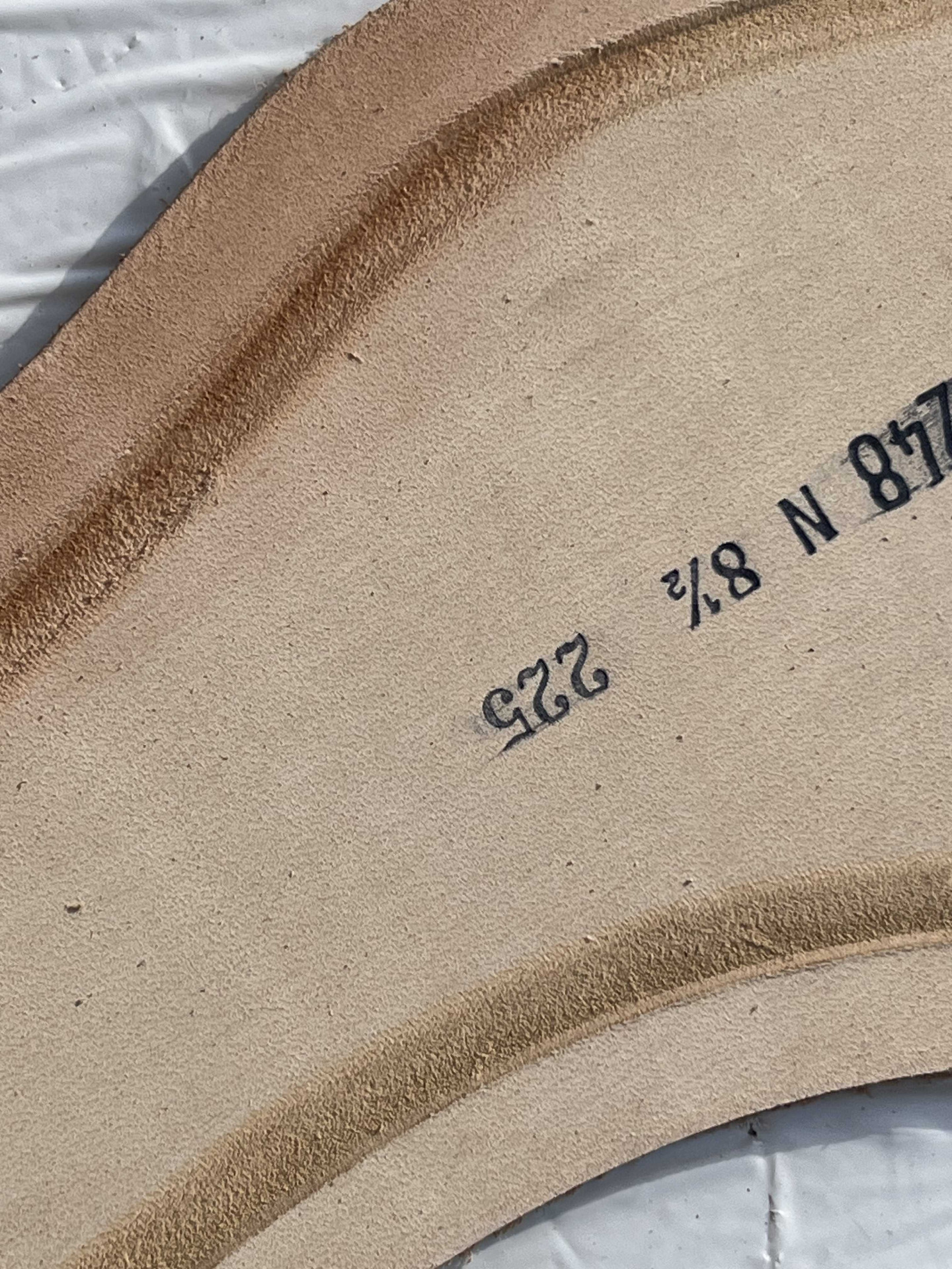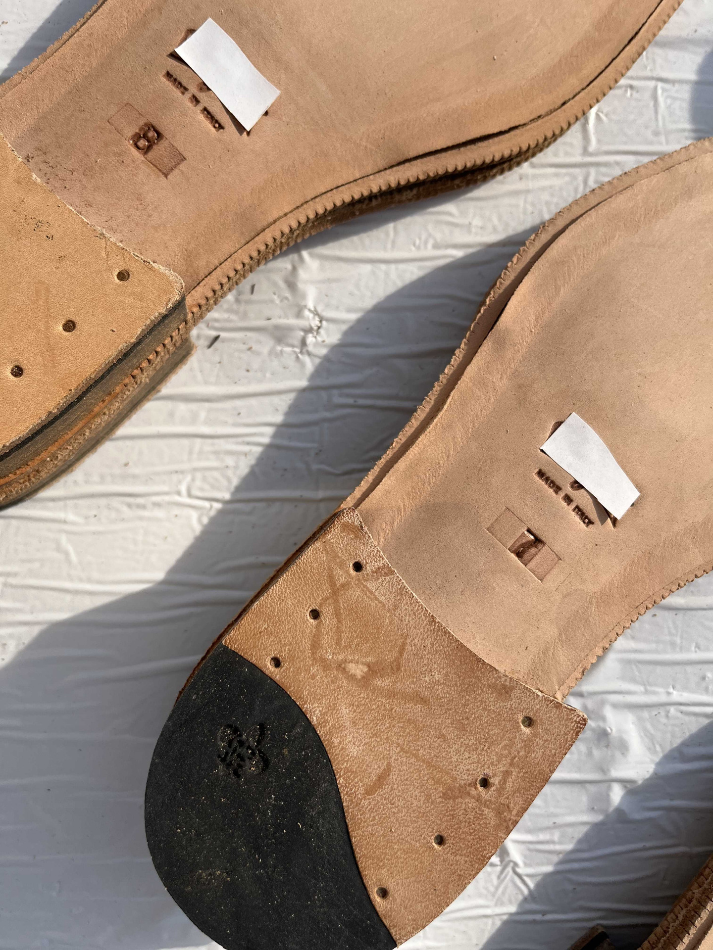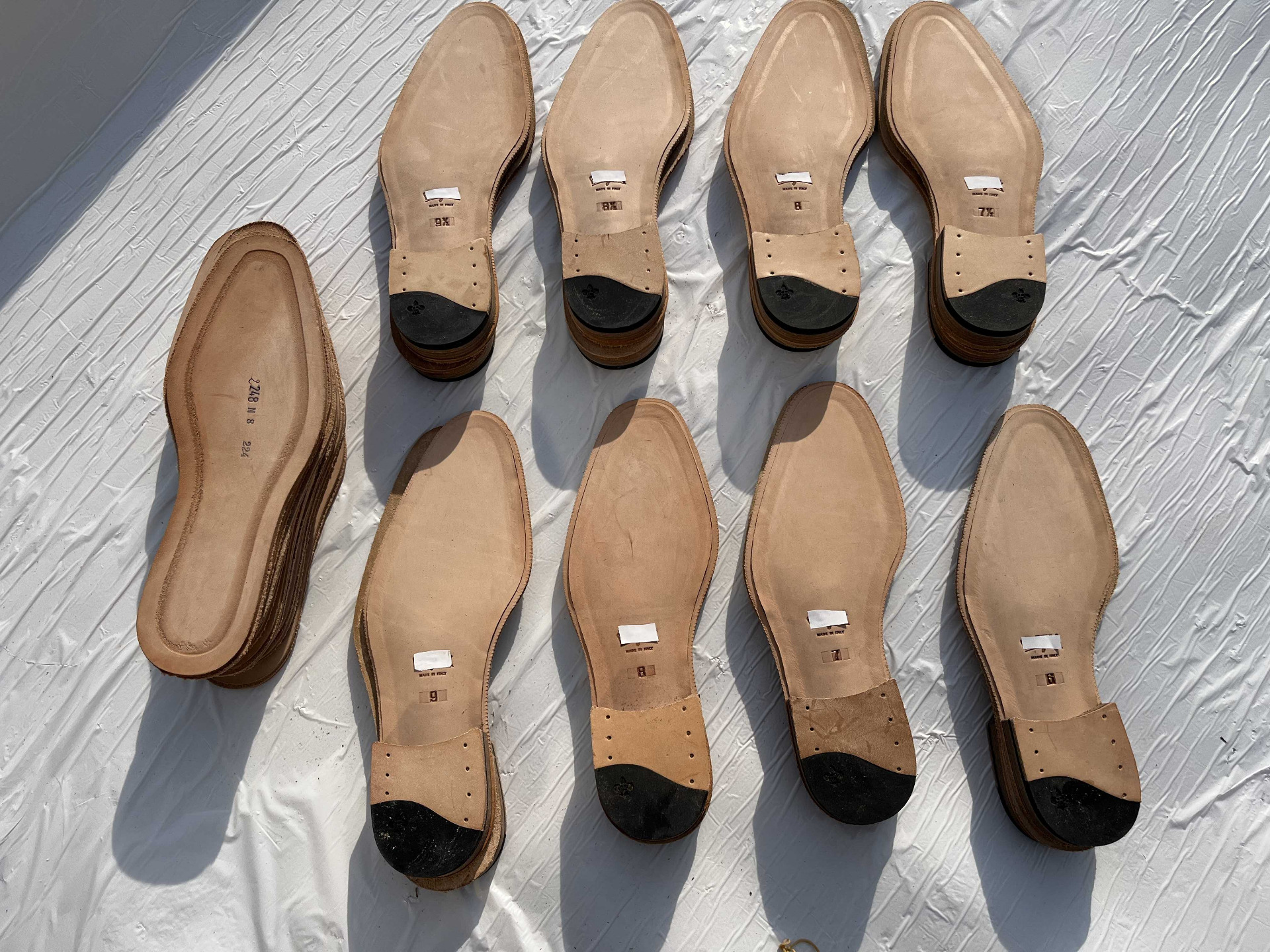 Suola scarpe uomo in vero cuoio naturale fresate ed ugualizzate complete di tacco in cuoio e soletto in cuoio, trattasi di suole con logo personalizzato impresso sulla suola facilmente rimovibile alla fresa, rimanenza di produzione.