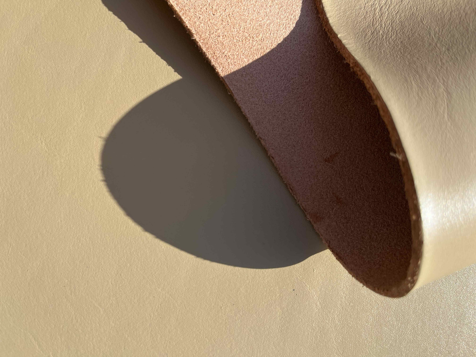 Pellame conciato a vegetale liscio di colore avorio, pellame di alta qualità pieno fiore, segni e imperfezioni non sono da considerarsi difetti, ma certificano la genuinità della materia prima.