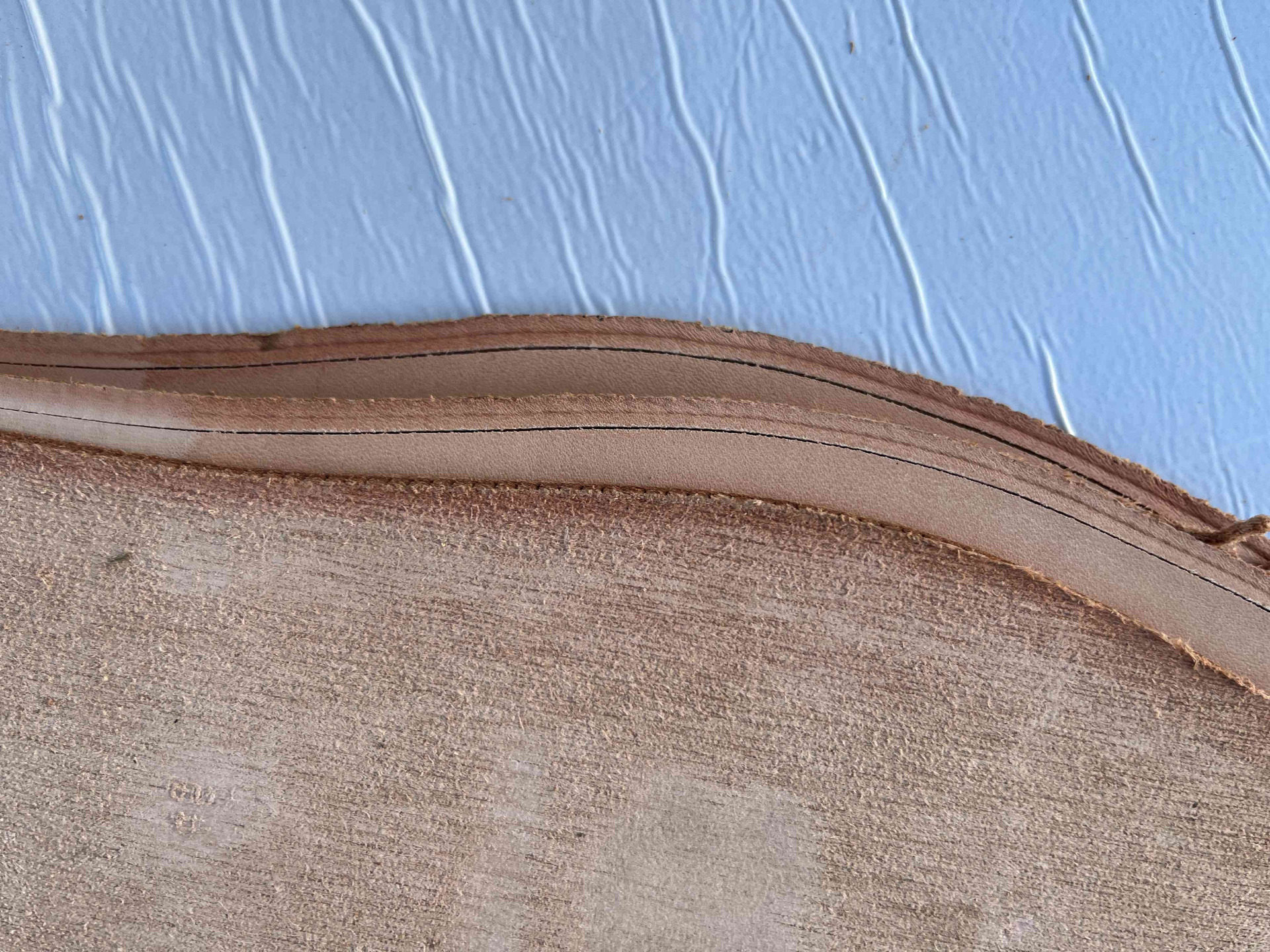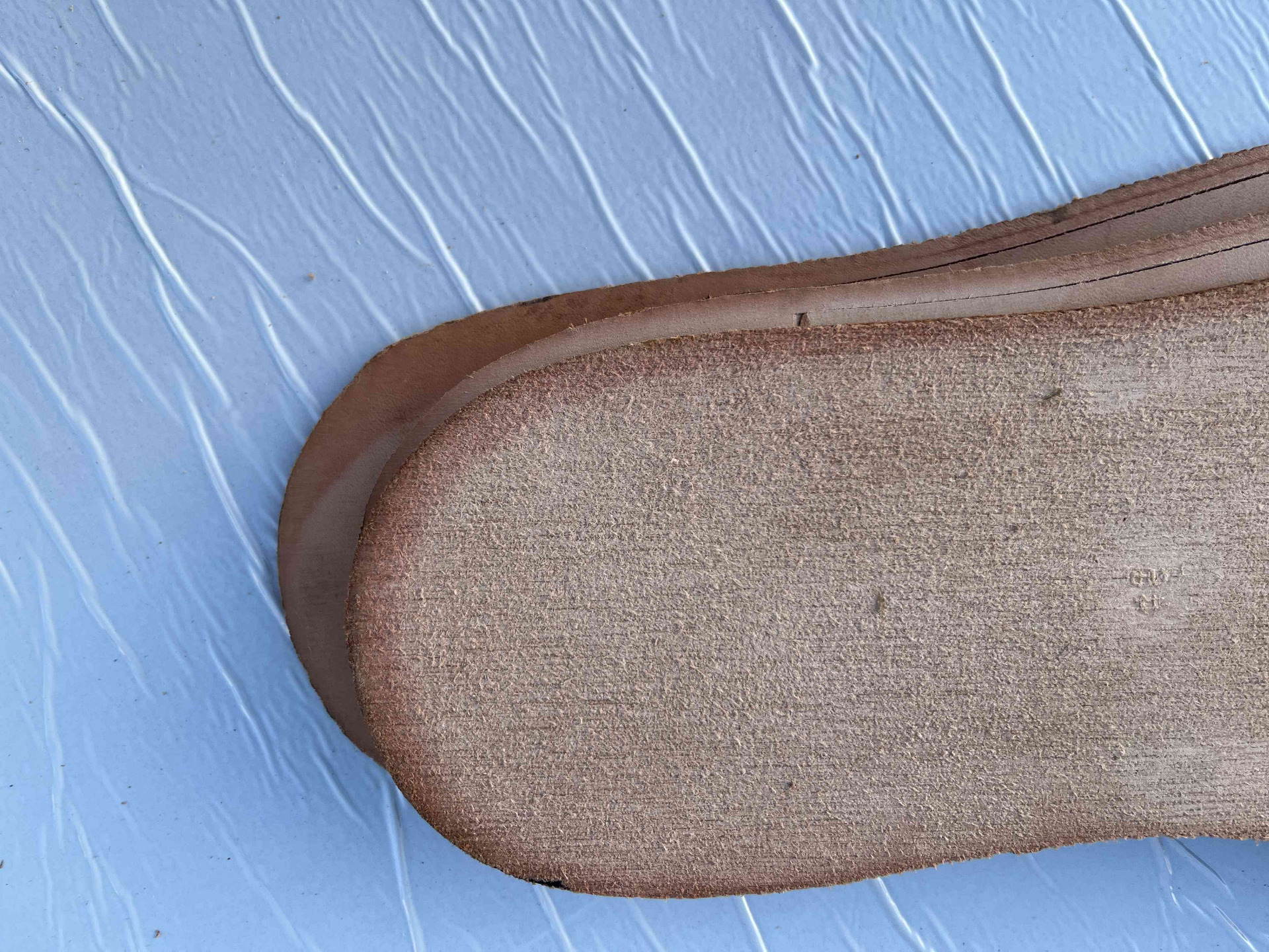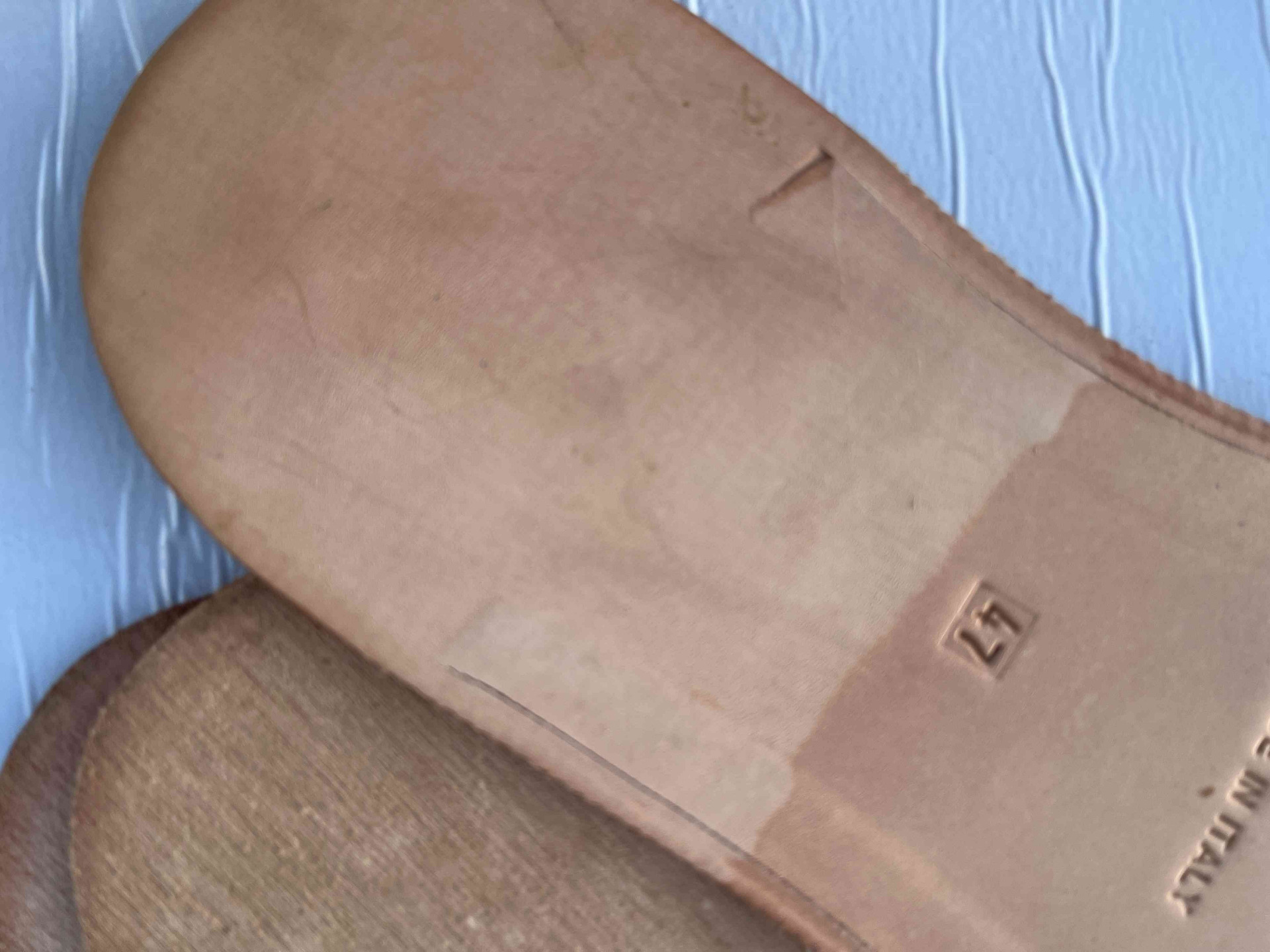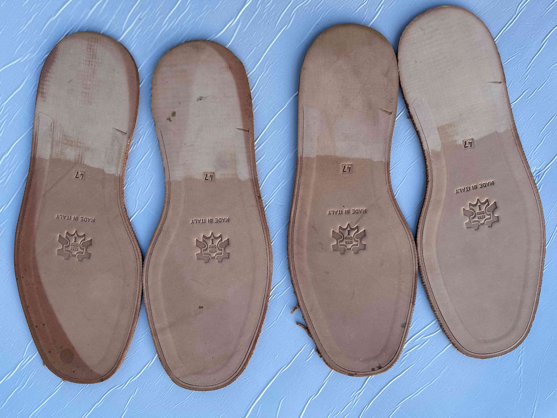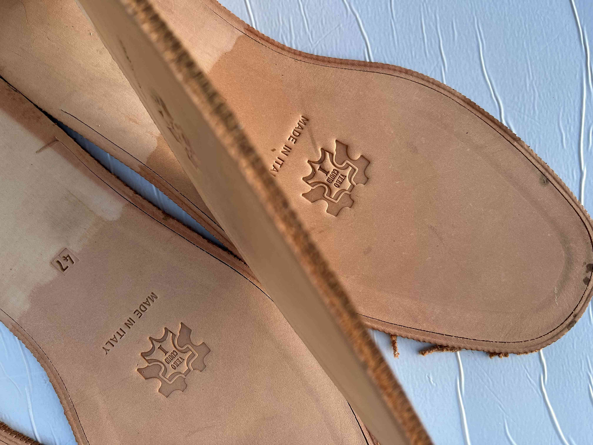 Suola scarpe uomo in vero cuoio naturale fresate ed ugualizzate, rimanenza di produzione con presenza di aloni da movimentazione di magazzino, facilmente rimuovibile nella fase di rifinizione.