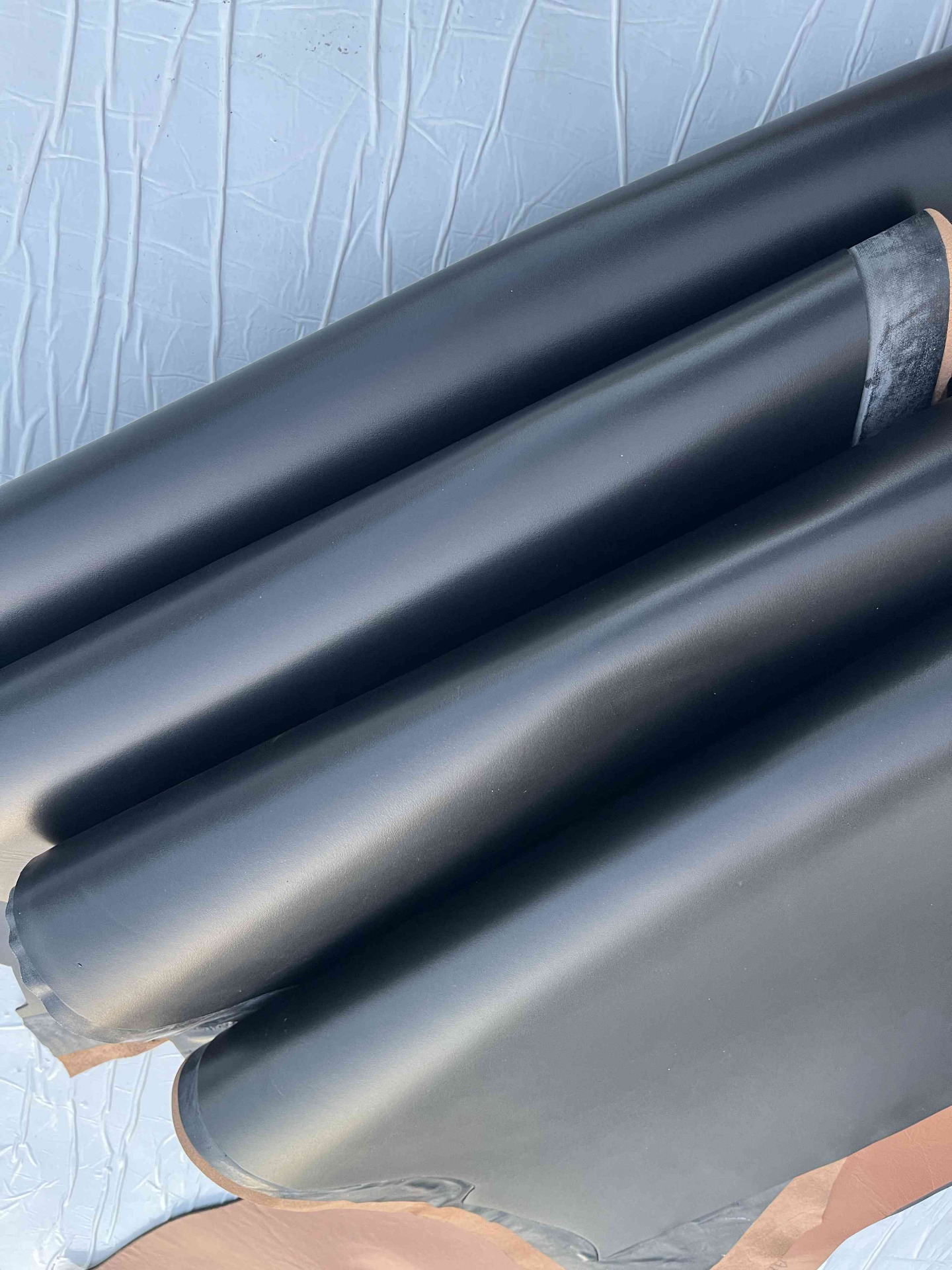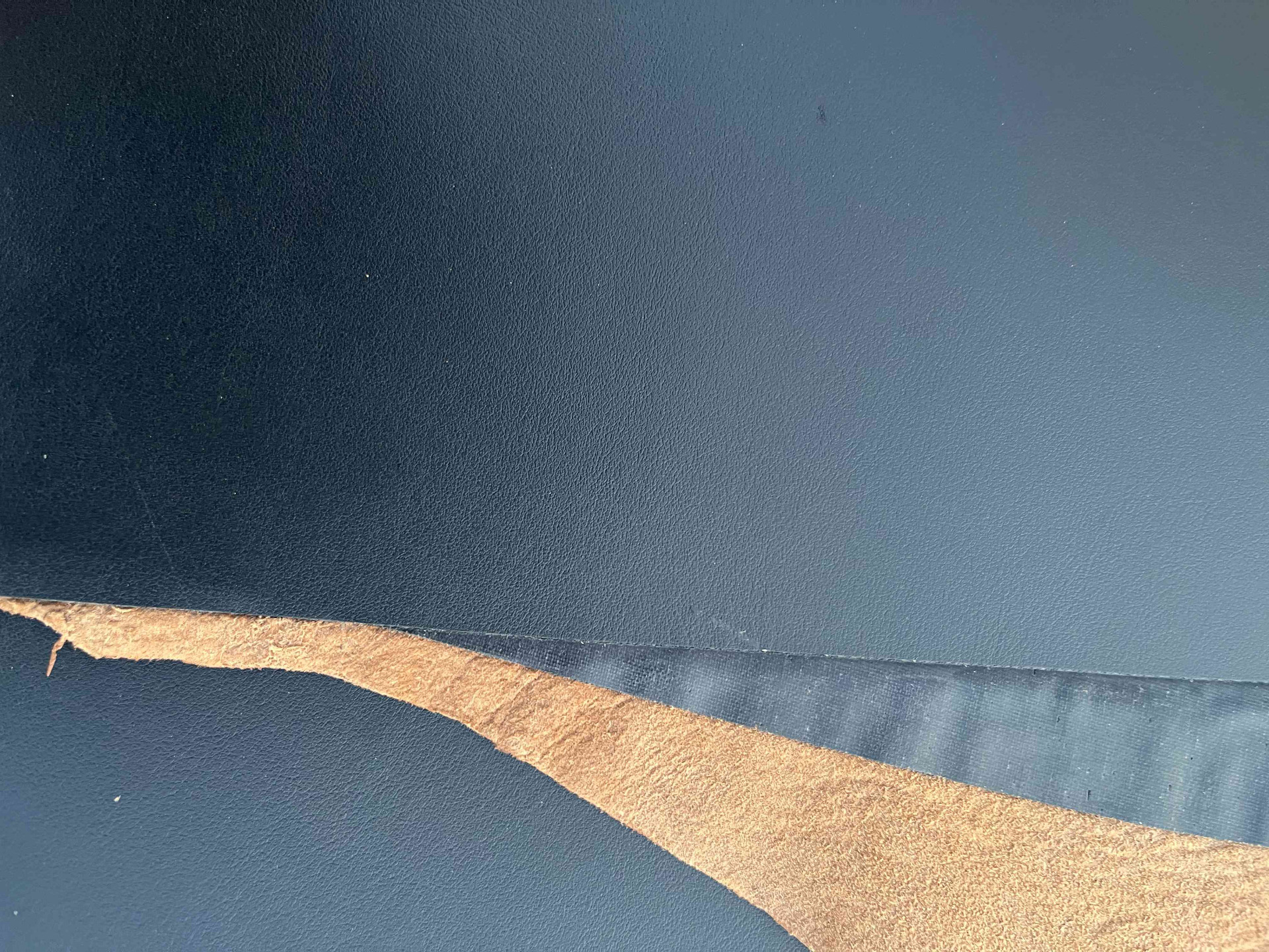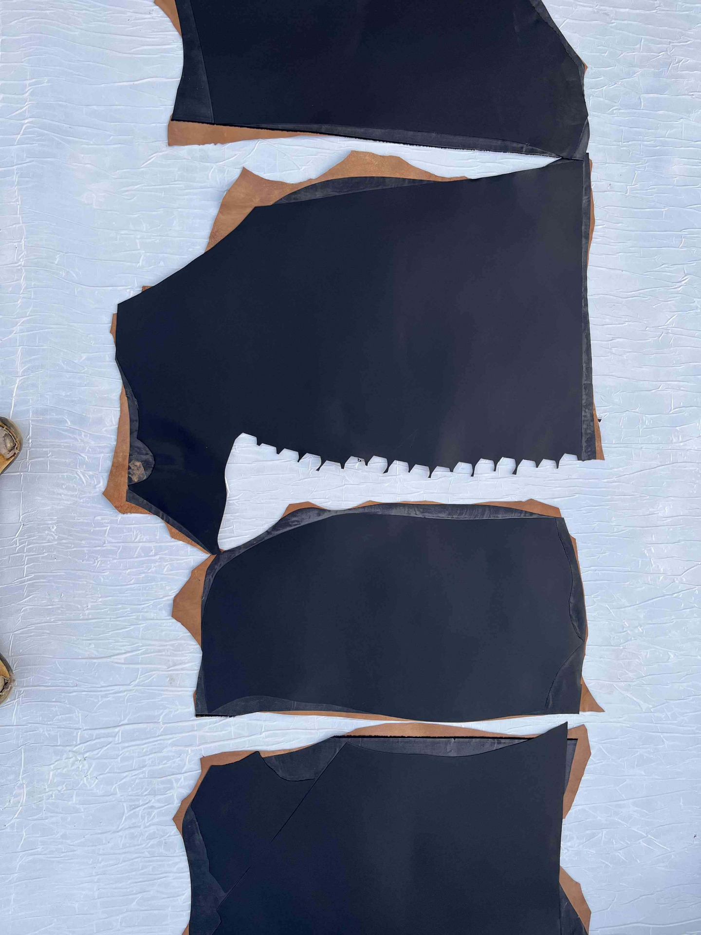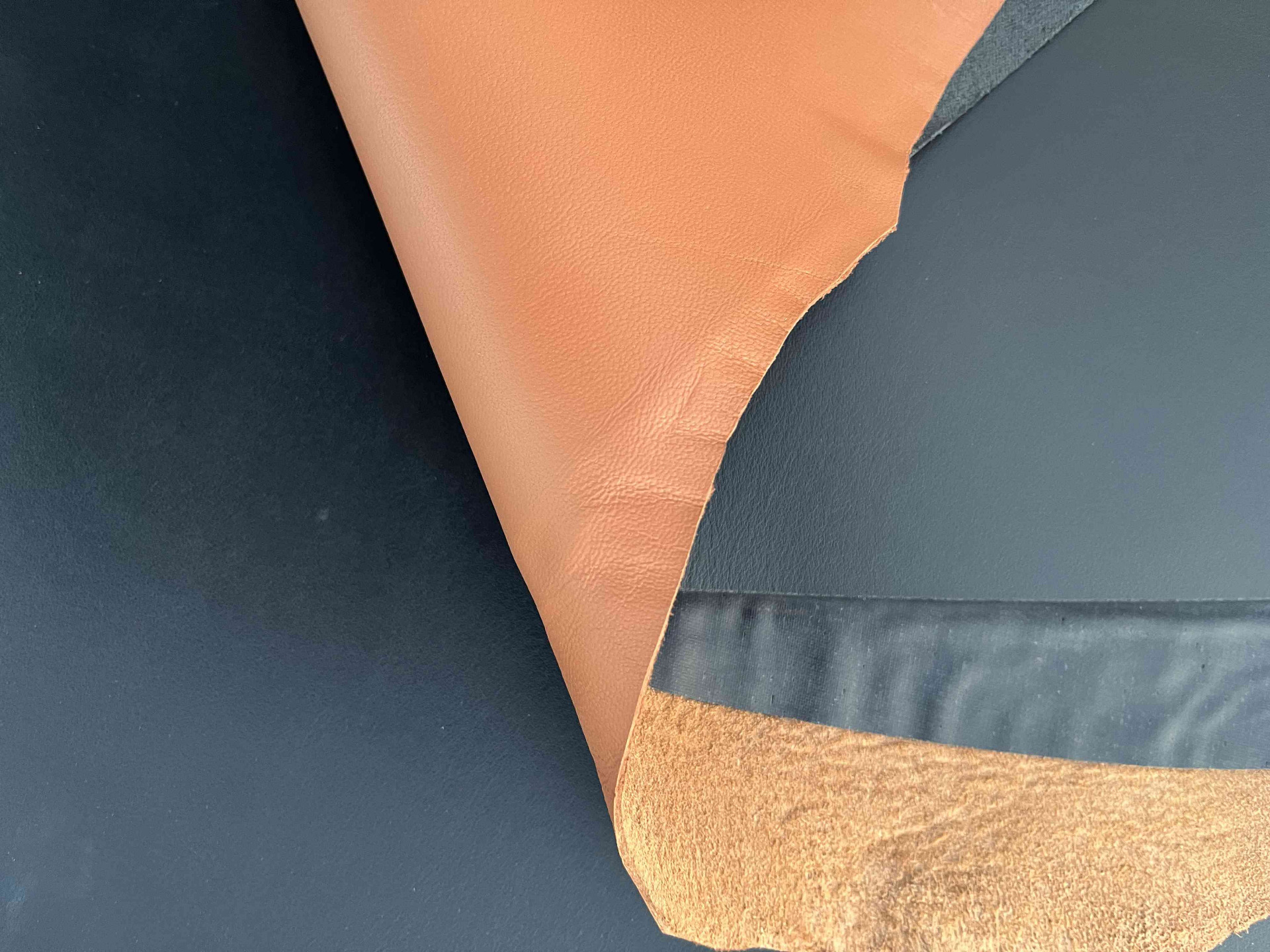 Pellame di vitello liscio colore nero accoppiato con pellame ovino nocciola, mano semirigida, alto spessore, ampiamente utilizzato nel settore della pelletteria e calzatura nella tranciatura di tomaie per sandali, infradito e ciabatte, borse, cinture, collari e molto altro, consente di ottenere una tomaia con il retro già completo di fodera pronta per il montaggio.