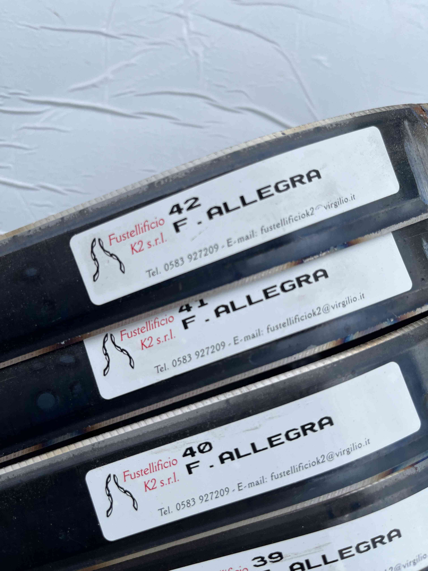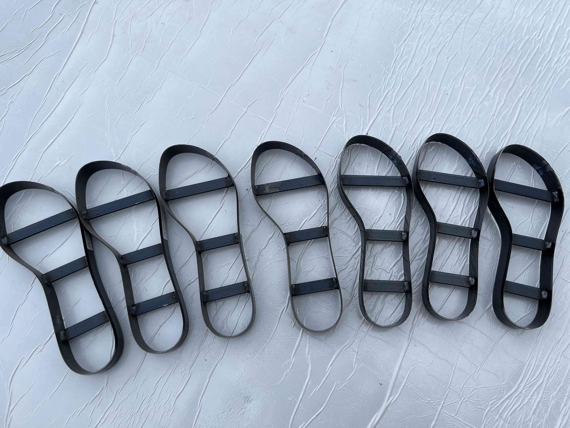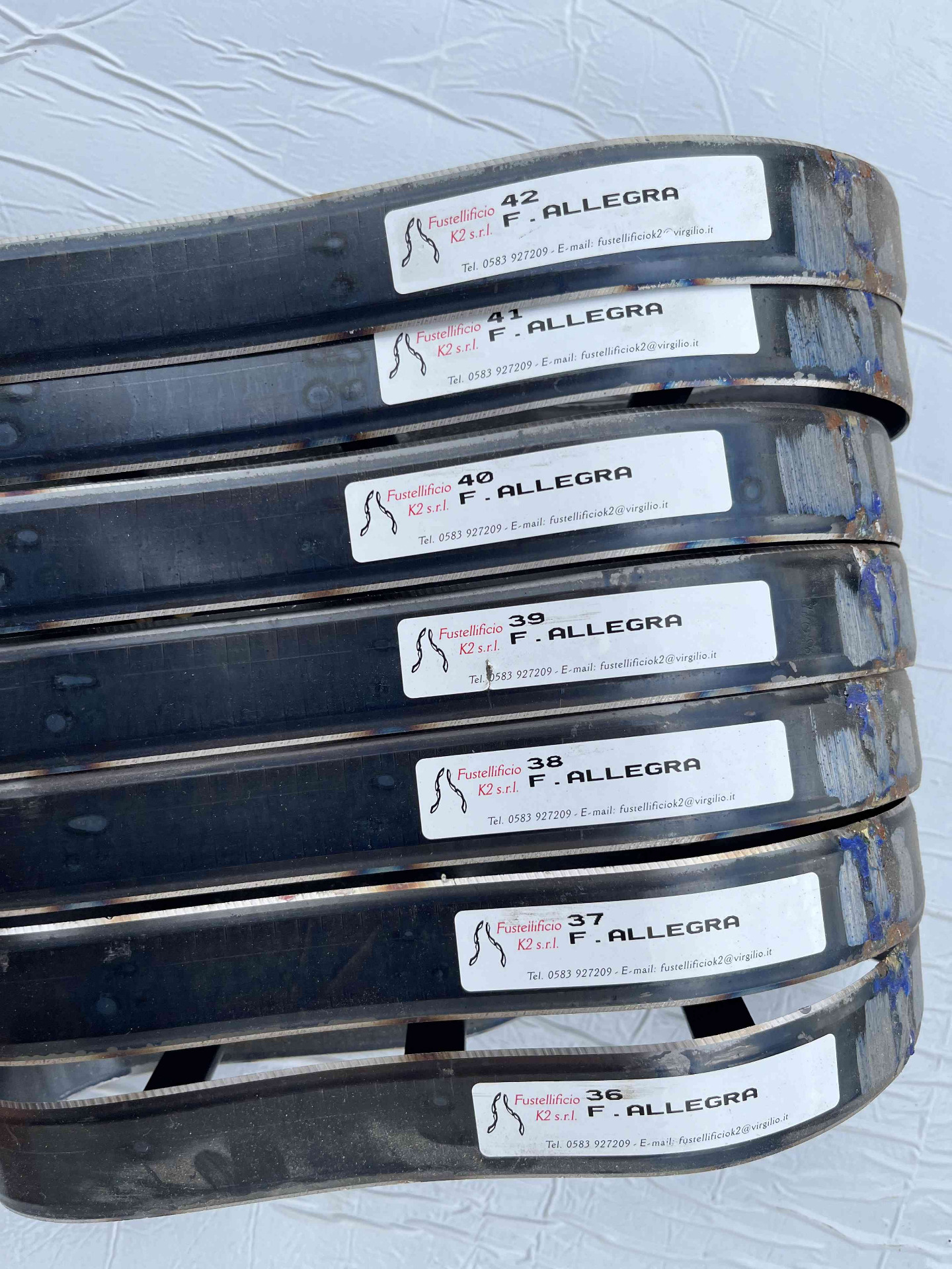 Serie di fustelle in acciaio usate per taglio delle suola sandali e infradito donna, set completo fustelle in acciaio austriaco due millimetri di spessore e trenta millimetri di altezza, fustelle con pochissime battute all'attivo in condizioni equiparabili al nuovo.