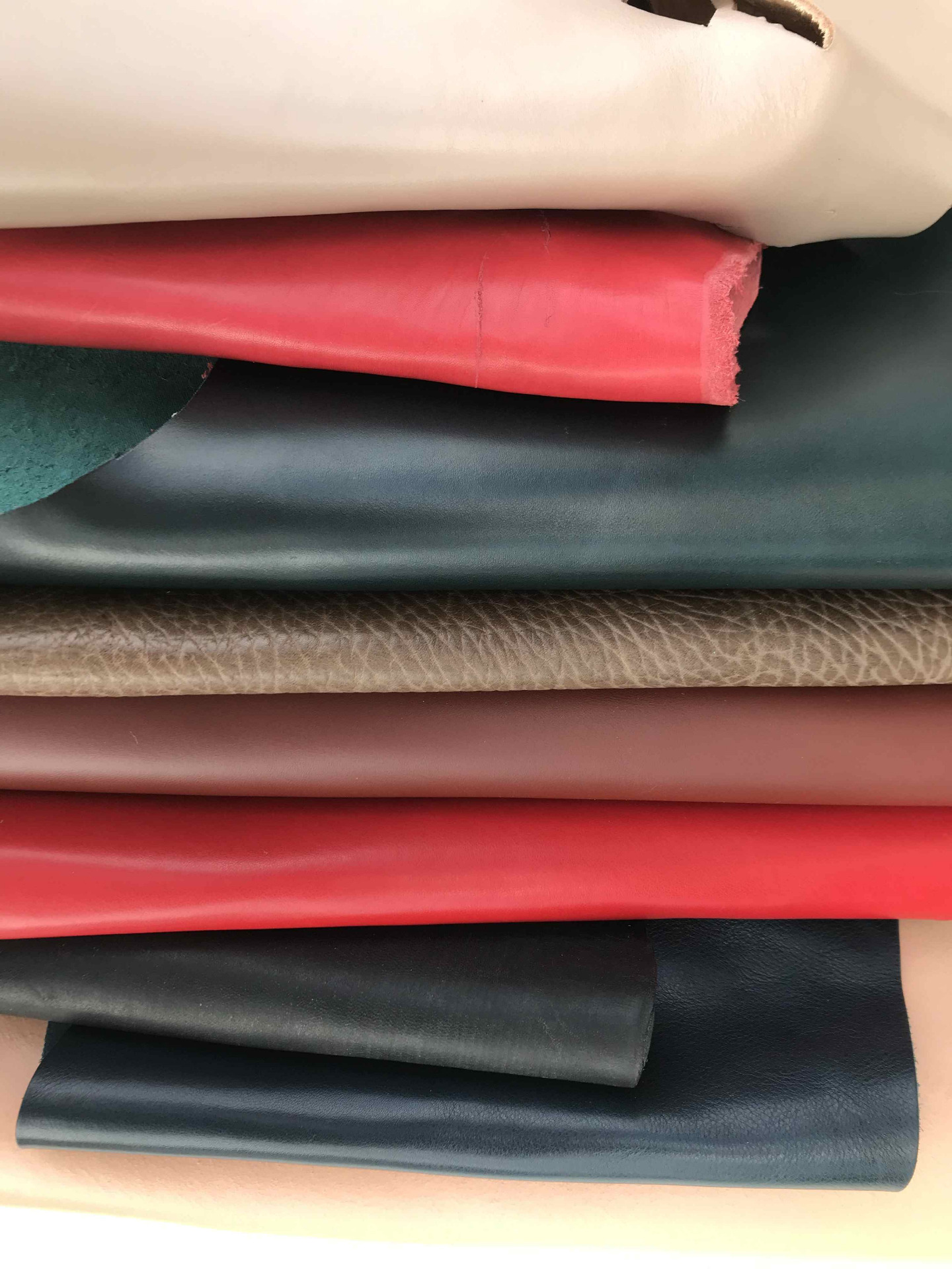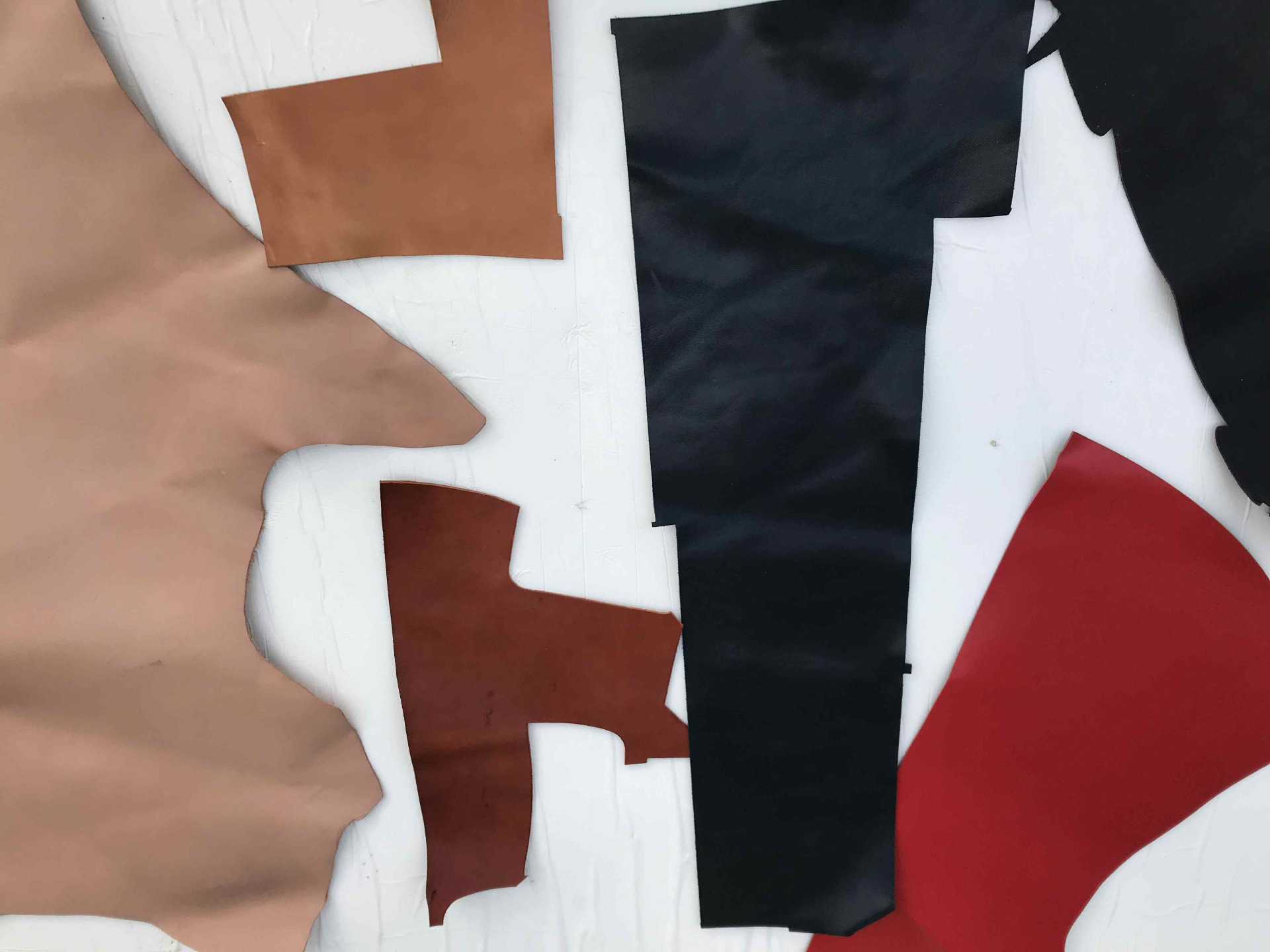 Cartone da cinque chili con pezzami in cuoio assortiti di grandi e medie dimensioni, colori e spessori diversi, pezzi di pelle liscia e bottalata.