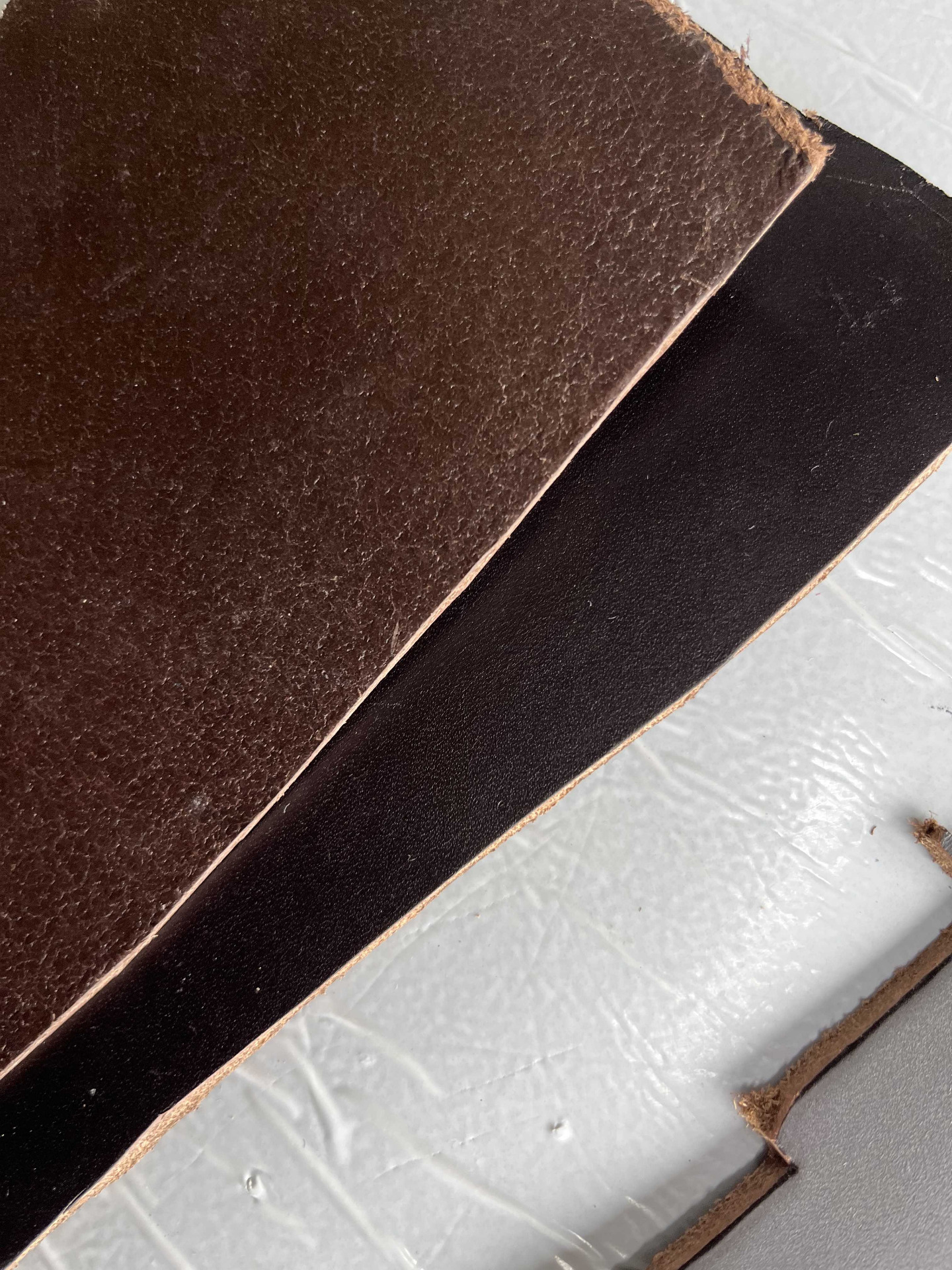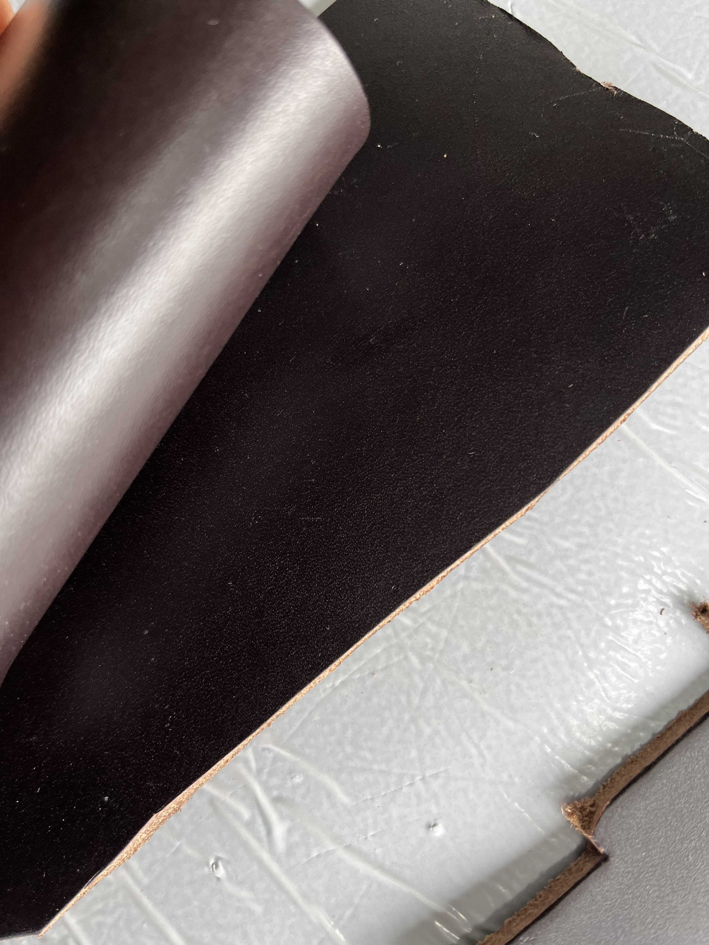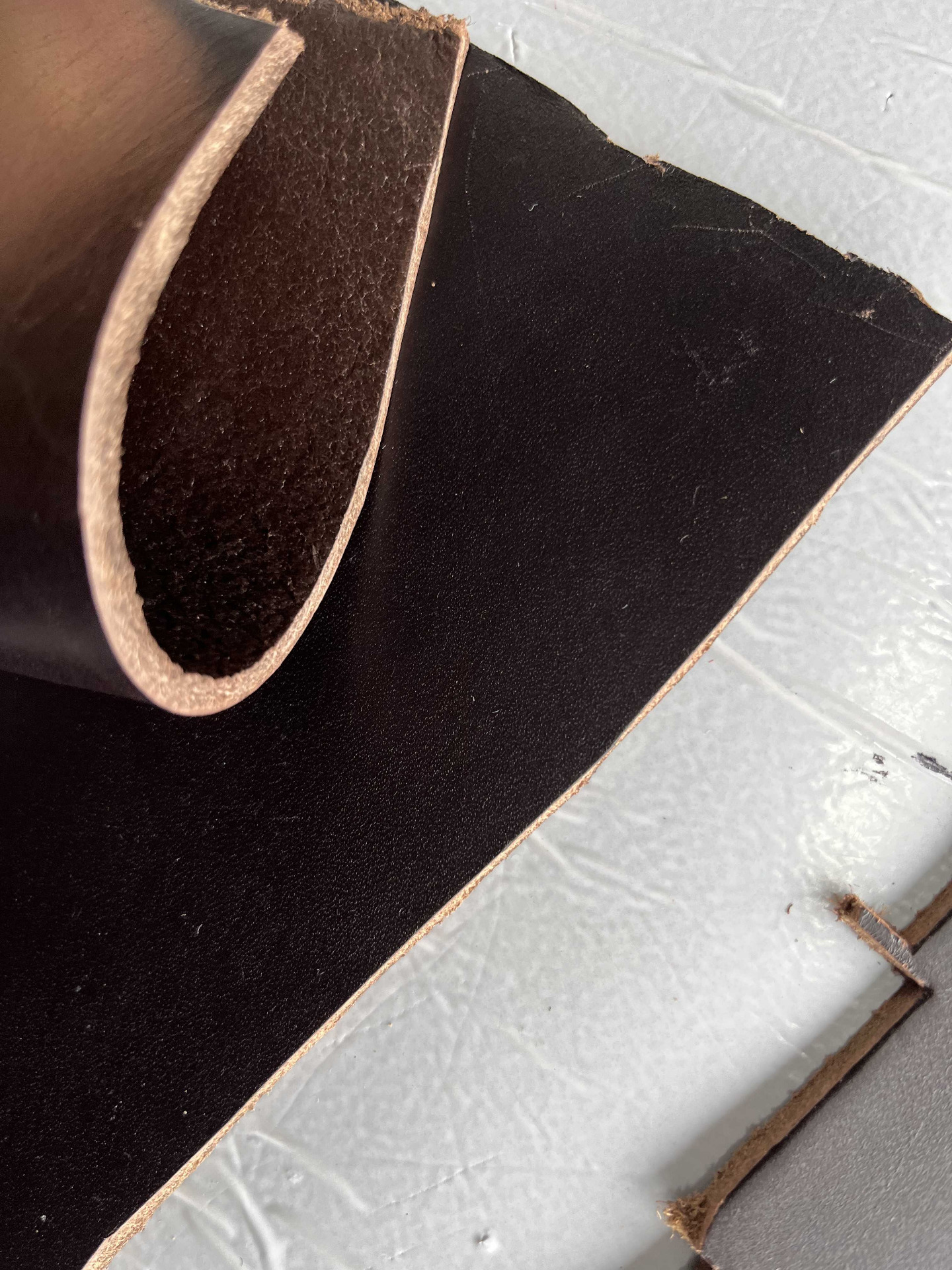Pellame conciato 100% a vegetale ingrassato al sego di colore Testa di Moro, liscio pieno fiore, qualità top, alto spessore uniforme per tutta la superficie, cerato da carne per coltelleria, bricolage, hobby creativi e molto altro.