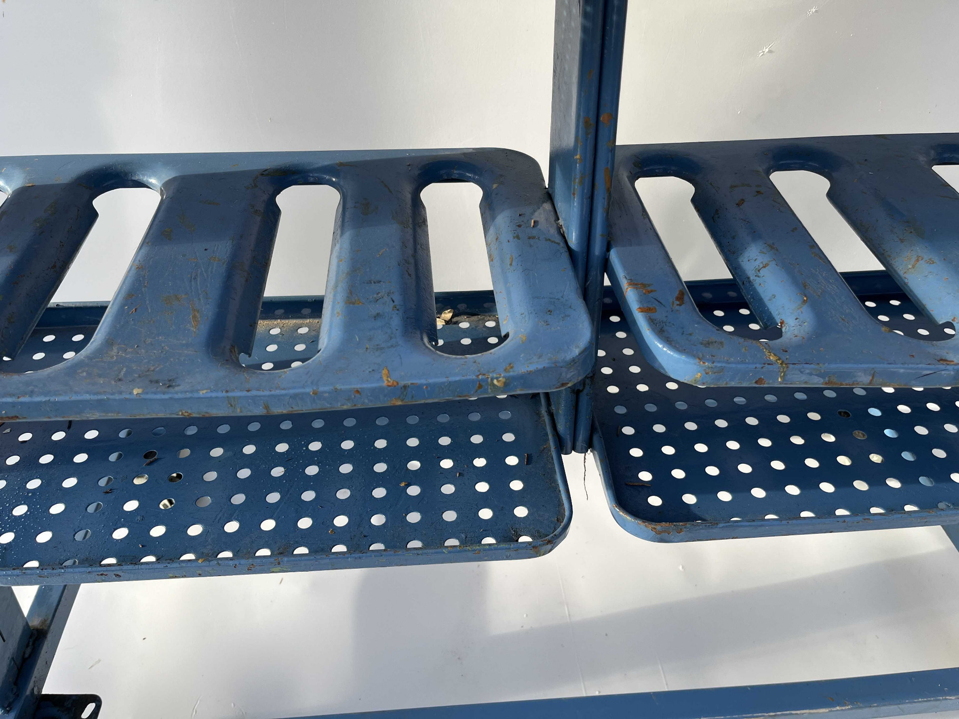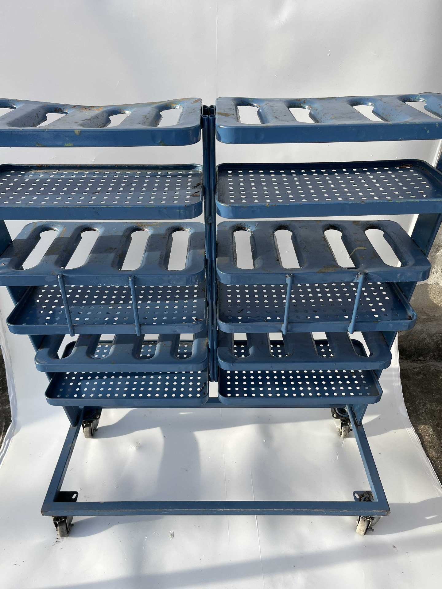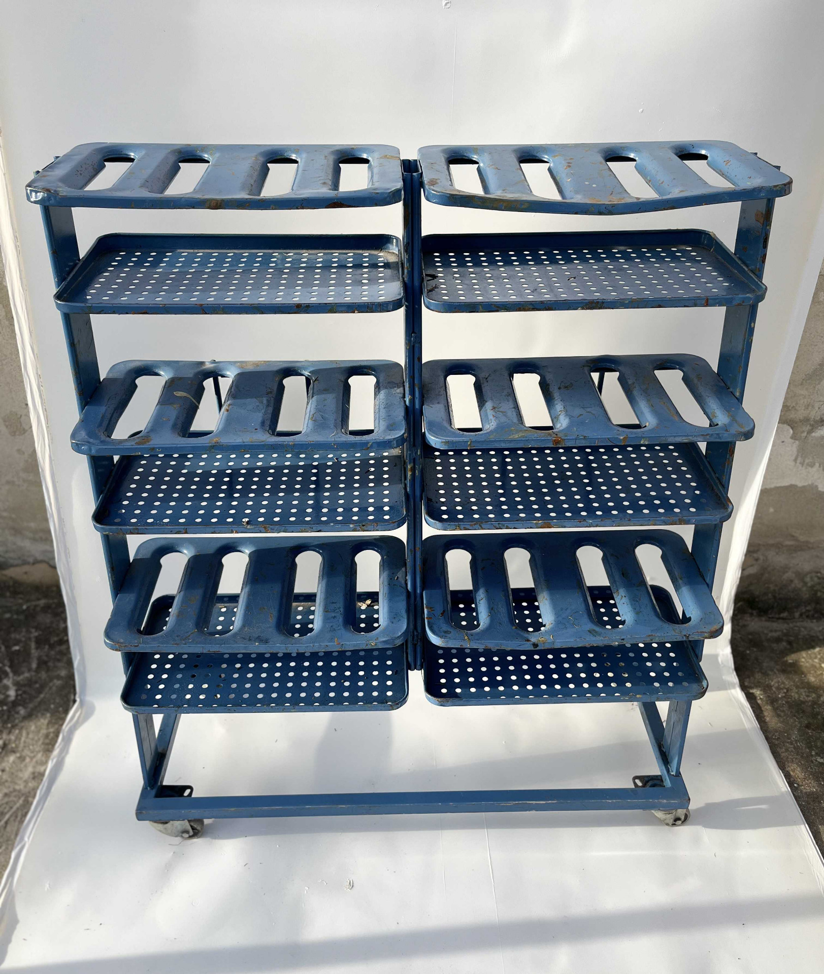 Carrello per calzolaio con cavità per posatura calzature durante la lavorazione, sei piani, dotato di ruote, prima vernice originale di fabbrica, realizzato completamente in ferro pesante, produzione 100% made in Itaky e in ottimo stato di conservazione.