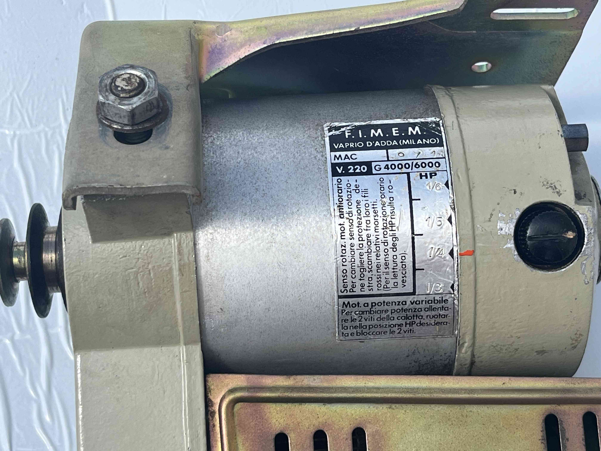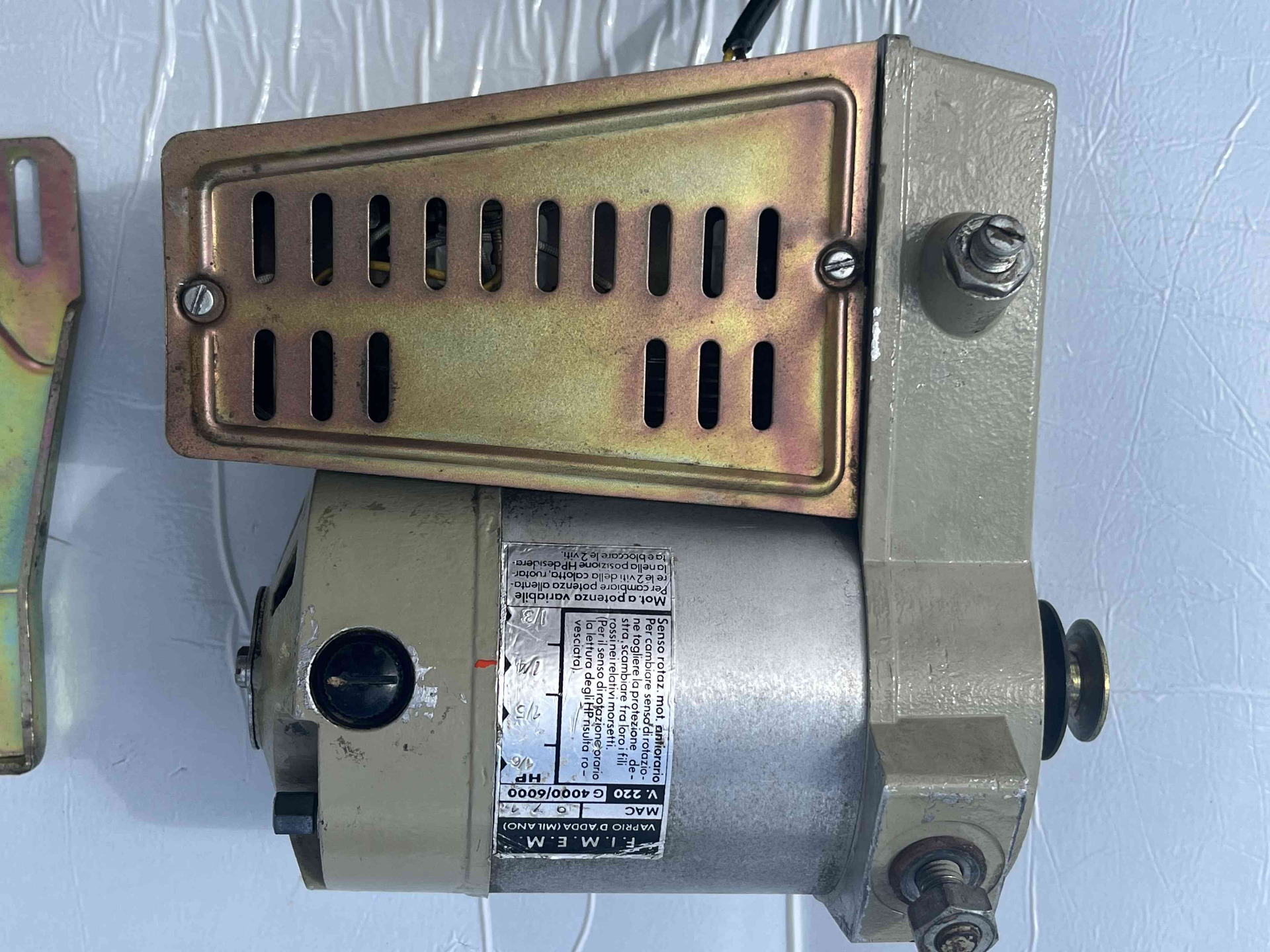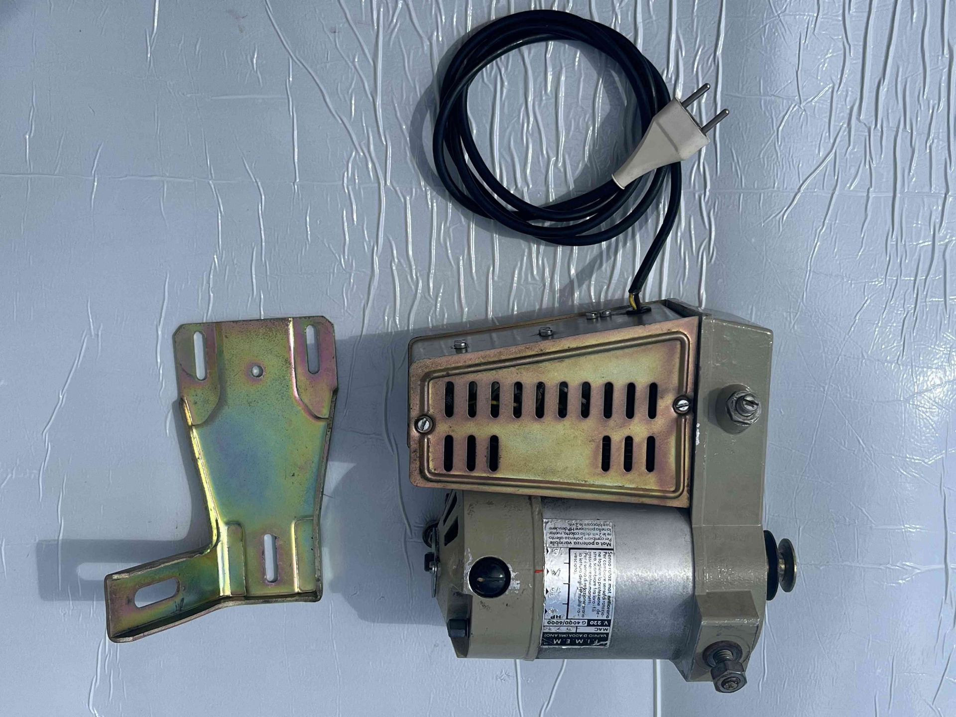 Motore usato per macchina da cucire monofase della FIMEM freno/frizione in condizioni eccellenti, perfettamente funzionante, completo di staffa, puleggia e cavo di collegamento alla rete, adattabile su qualsiasi macchina da cucire lineare, Necchi, Pfaff, Bernina, Rimoldi etc.