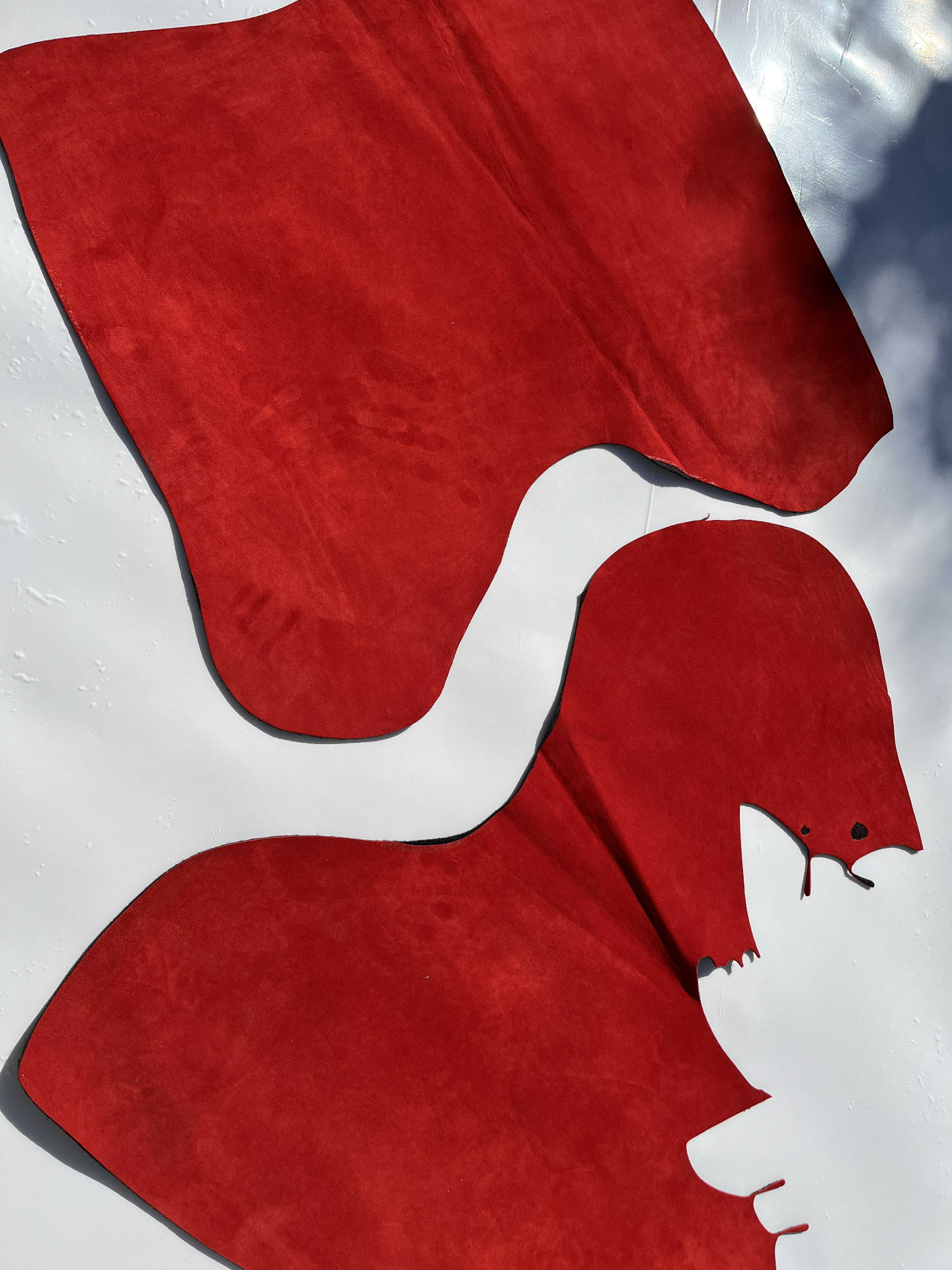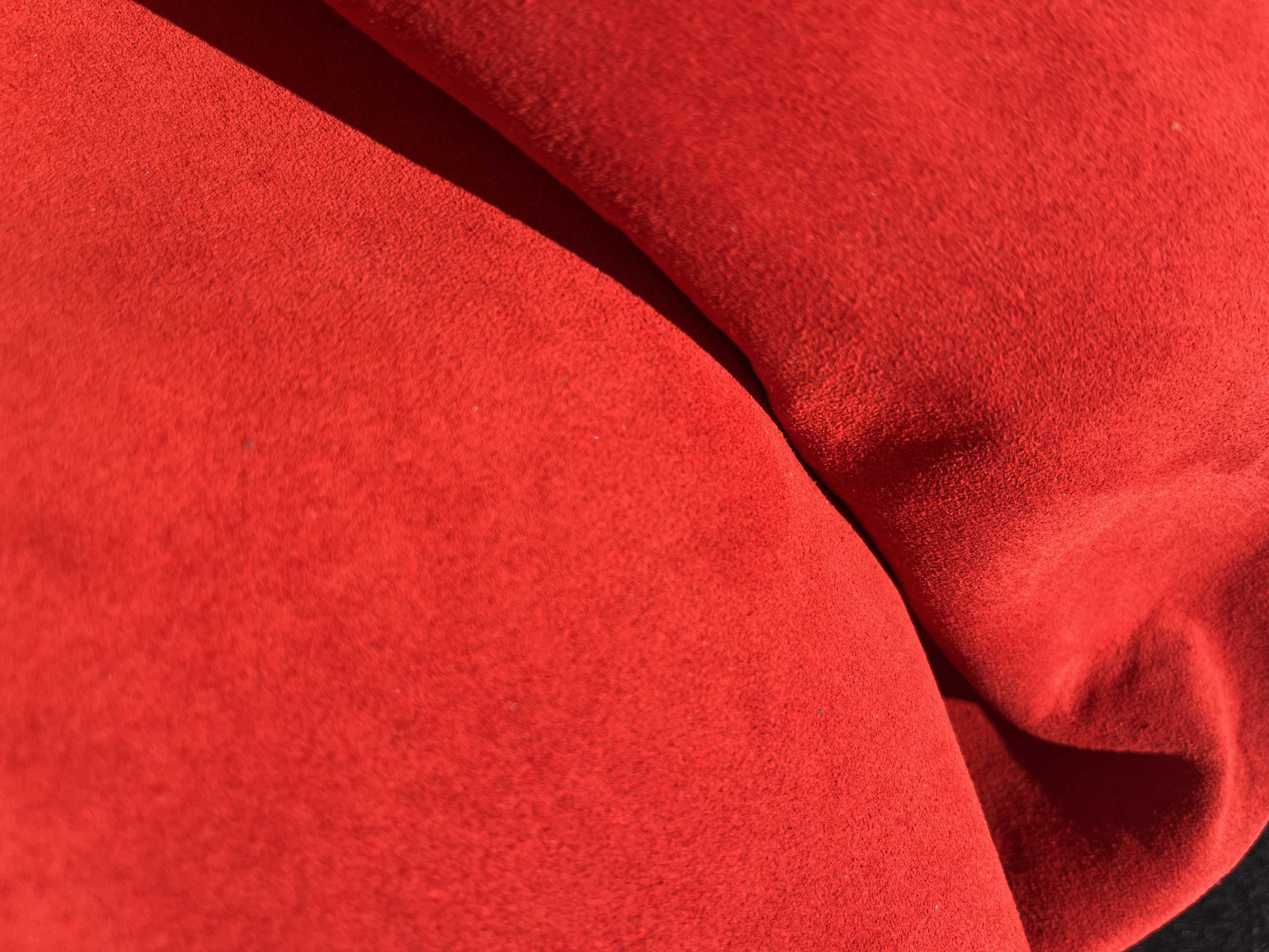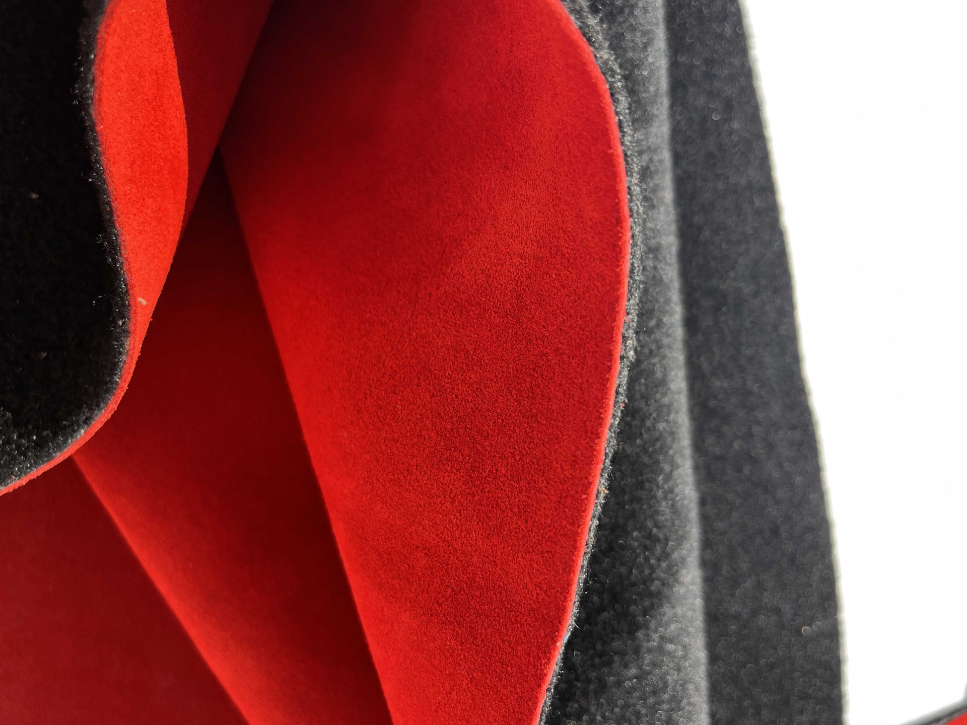 Pellame scamosciato accoppiato con feltro nero nella parte retro, mano semirigida, alto spessore, ampiamente utilizzato nel settore della calzatura per la produzione di ciabatte, articoli per animali, hobby creativi e molto altro, consente di ottenere una tomaia con il retro già completo di fodera pronta per il montaggio.