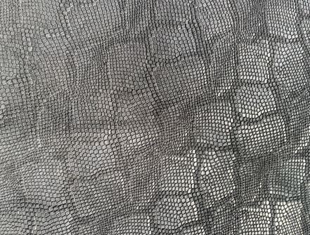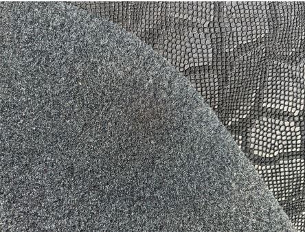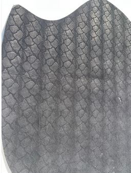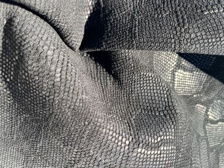 Pellame liscio stampato con la particolare squama del pitone accoppiato con feltro nero nella parte retro, mano semirigida, alto spessore, ampiamente utilizzato nel settore della calzatura per la produzione di ciabatte, articoli per animali, hobby creativi e molto altro, consente di ottenere una tomaia con il retro già completo di fodera pronta per il montaggio.