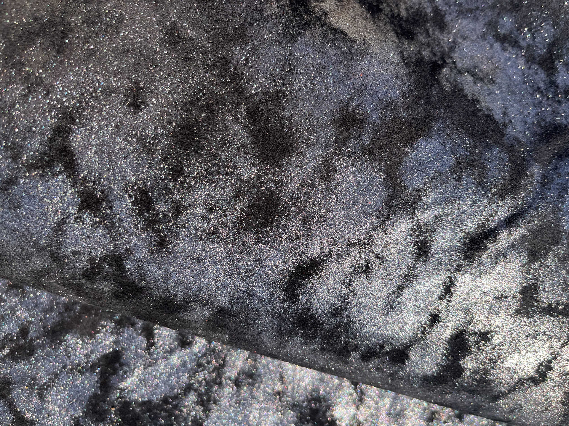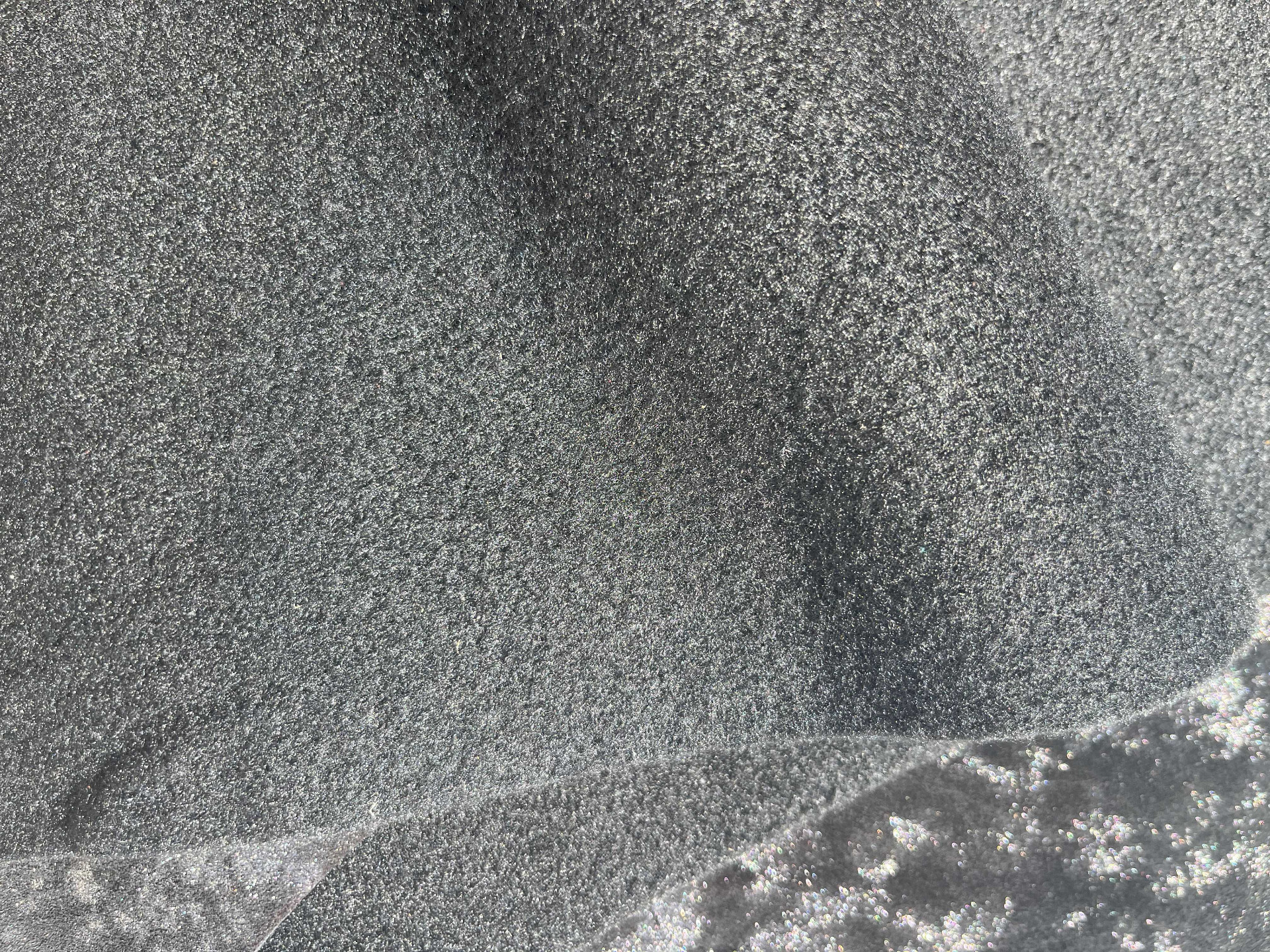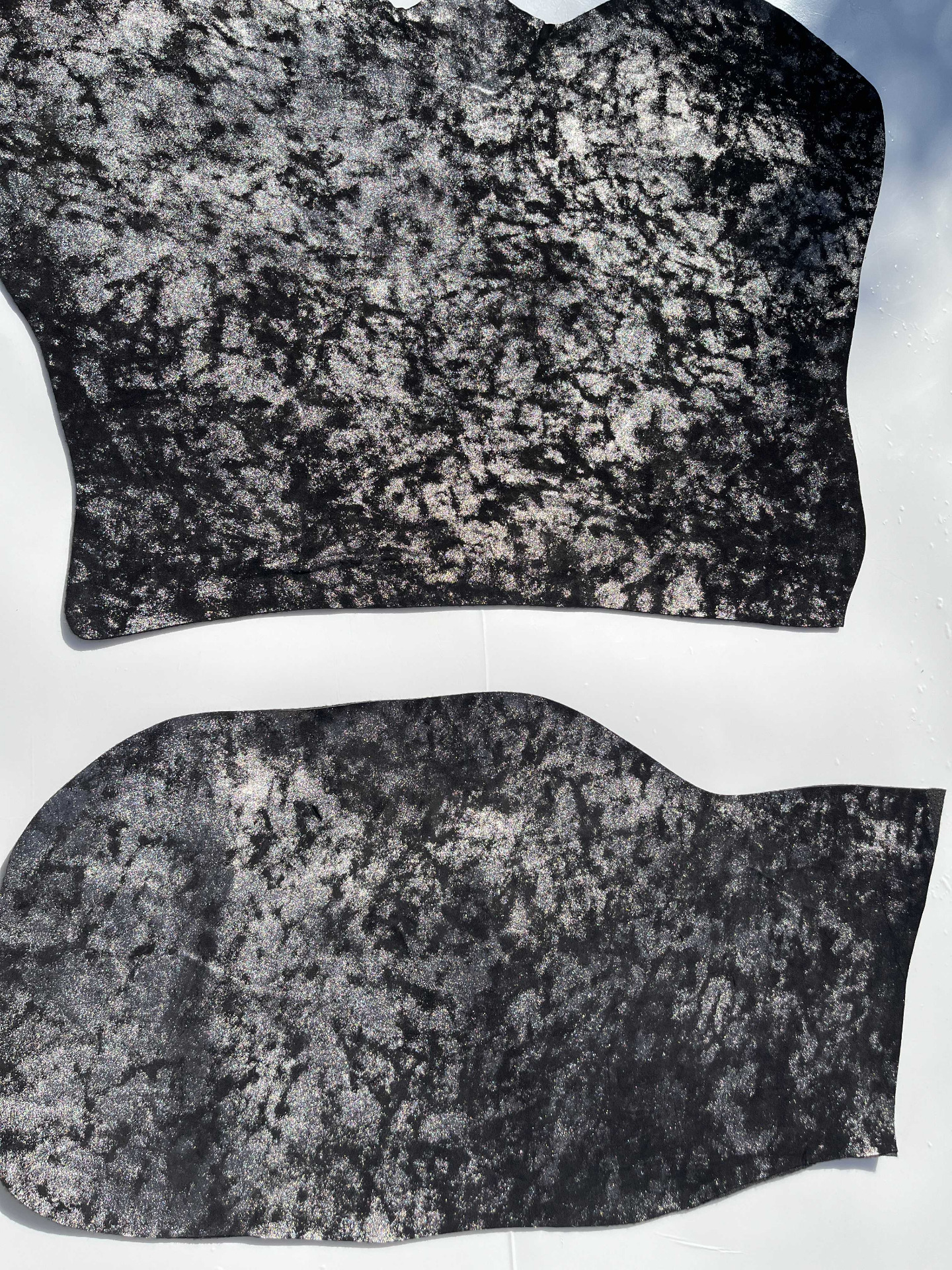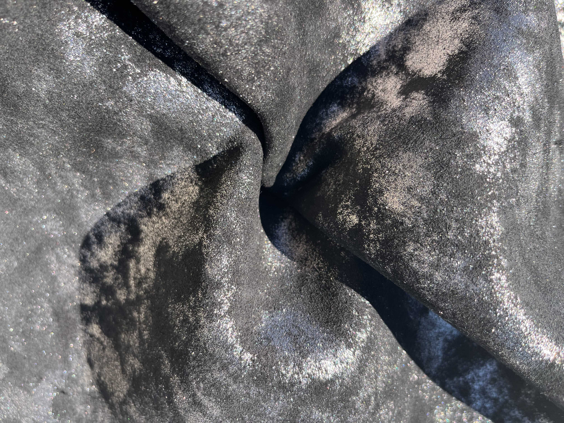 Pellame scamosciato effetto nuvola accoppiato con feltro nero nella parte retro, mano semirigida, alto spessore, ampiamente utilizzato nel settore della calzatura per la produzione di ciabatte, articoli per animali, hobby creativi e molto altro, consente di ottenere una tomaia con il retro già completo di fodera pronta per il montaggio.