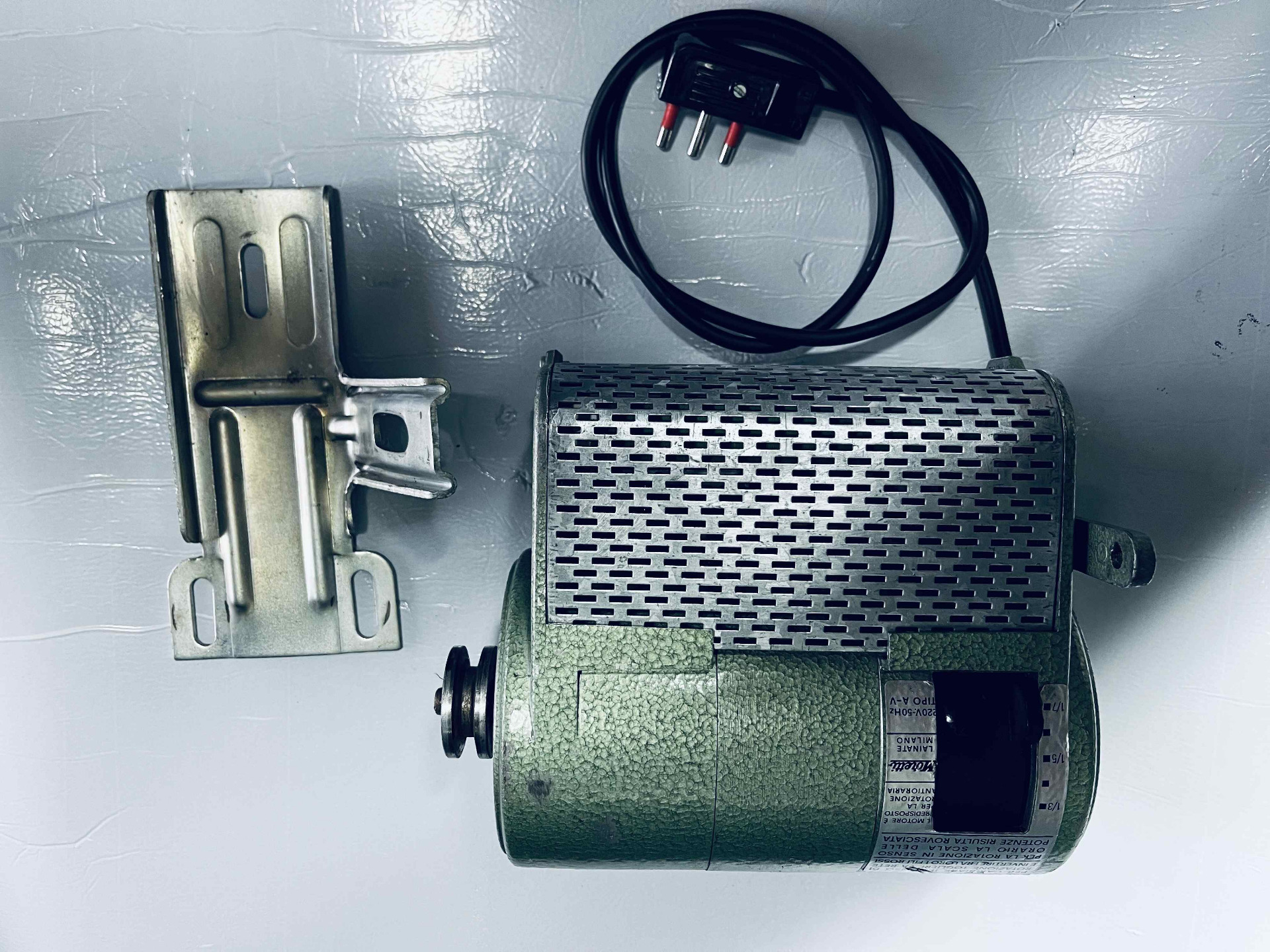 Motore usato per macchina da Cucire monofase della Moretti freno/frizione in condizioni pari al nuovo, pochissime ore di lavoro, perfettamente funzionante, completo di staffa, puleggia e cavo di collegamento alla rete, adattabile su qualsiasi macchina da cucire lineare, Necchi, Pfaff, Bernina, Rimoldi etc.