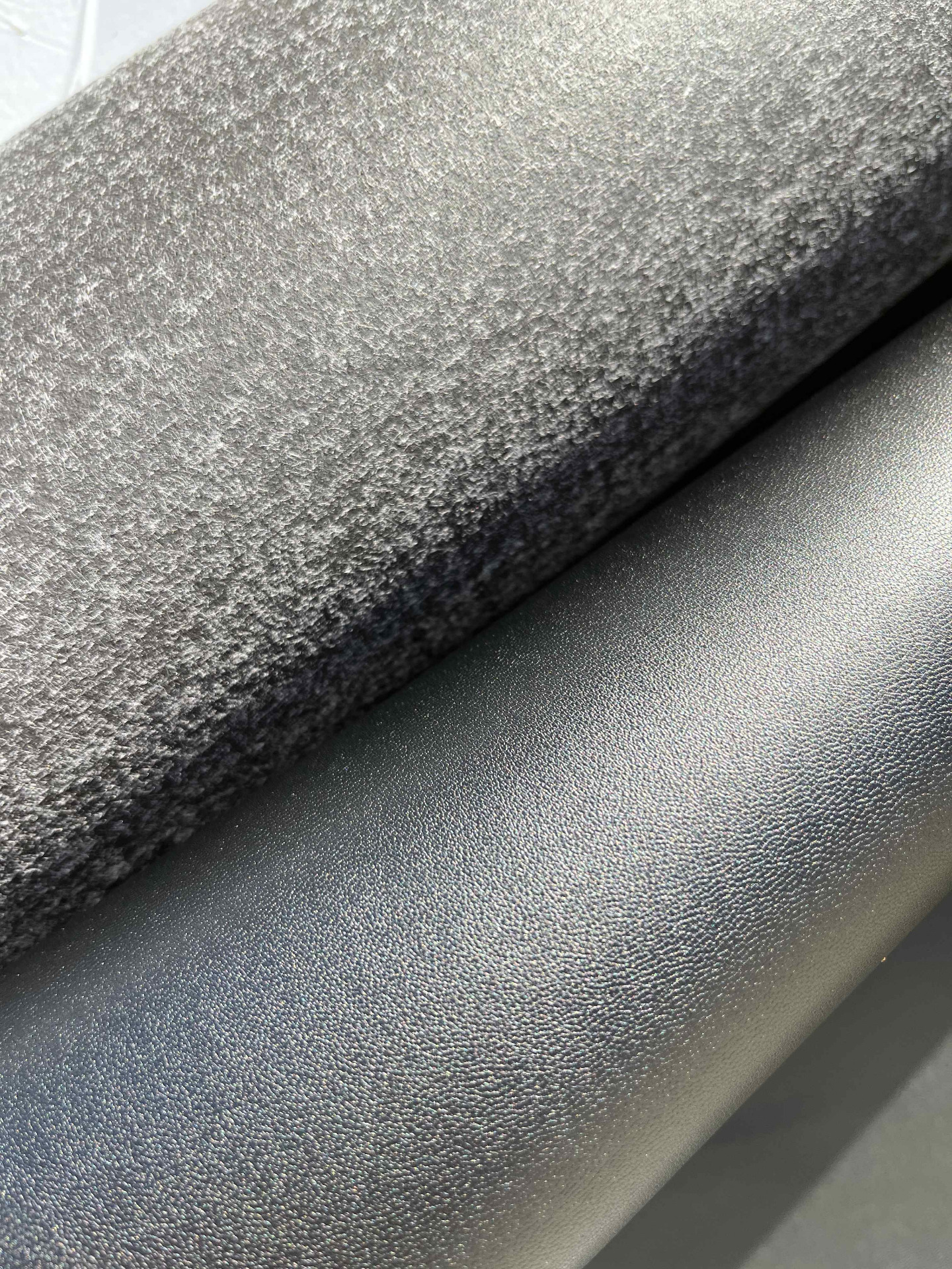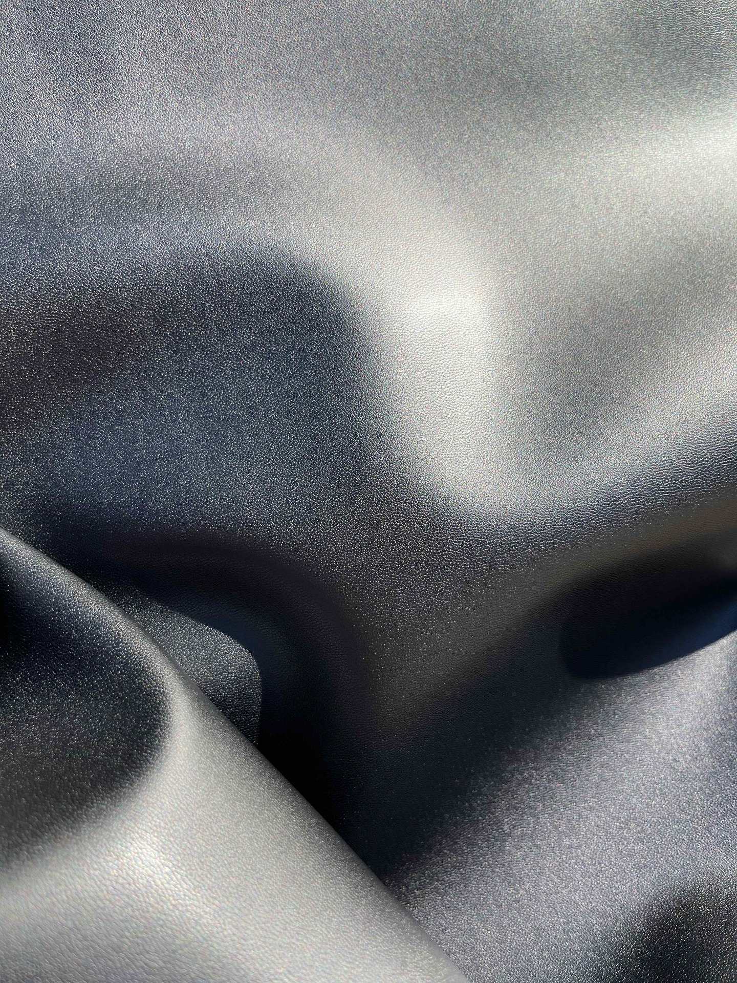 Scampolo ecopelle, sky finta pelle liscia di colore nero doppiata, mano morbida, parte retro in tessuto antracite ideale per creazioni artigianali di pelletteria, tappezzeria, selleria, nautica e molto altro.