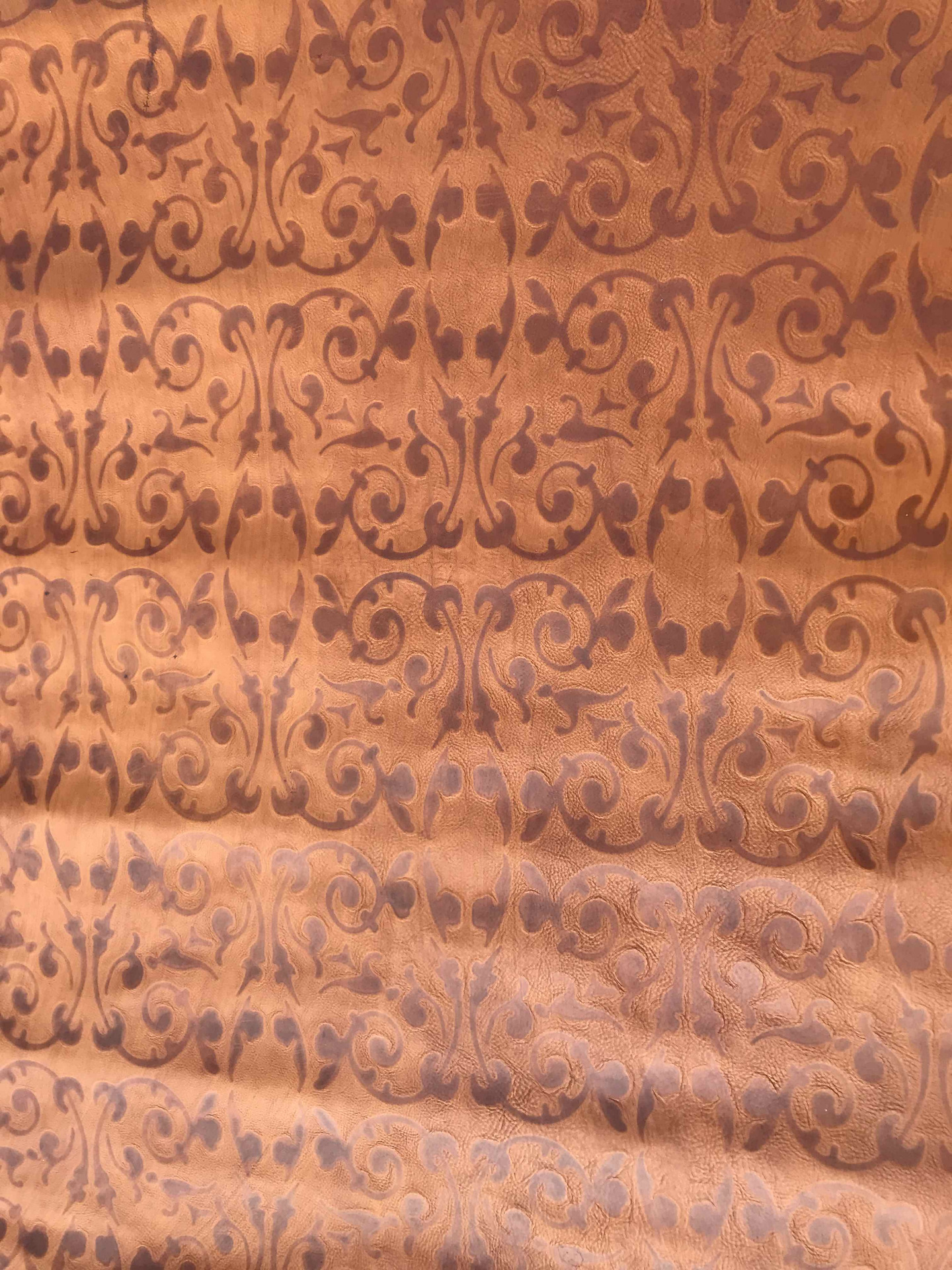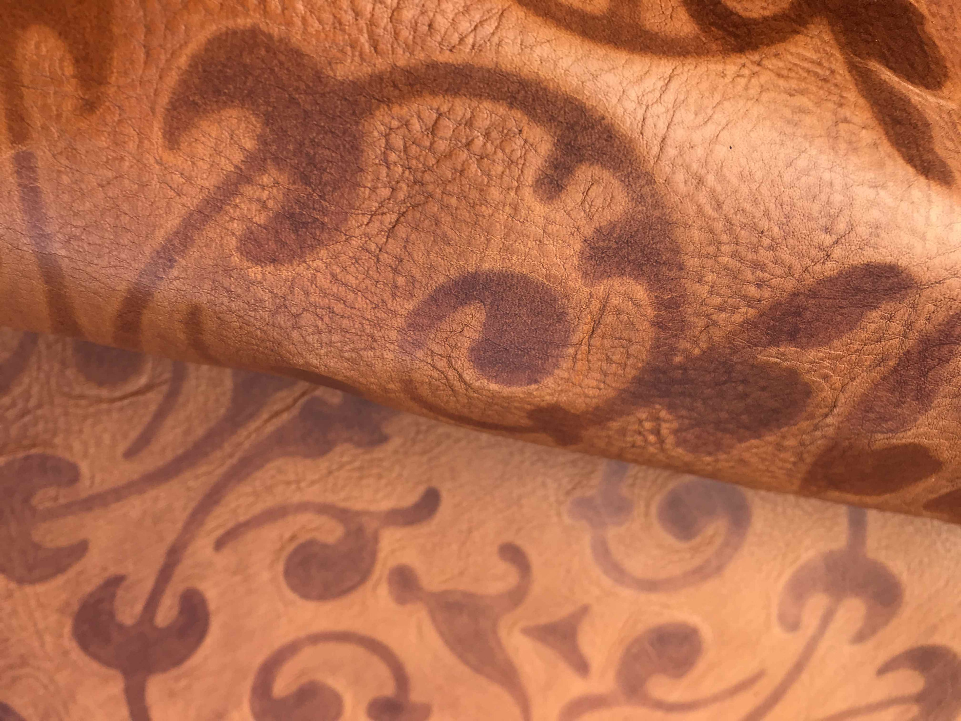 Pellame a vegetale colore Miele da pelletteria, pelle conciata 100% a vacchetta ingrassata al sego pieno fiore, stampata in rilievo con motivo floreale, colorata manualmente con tamponatura a spugna per ottenere un effetto vintage, per realizzare borse, zaini, cinture, braccialetti, selleria, fondine, portachiavi, incisione, articoli per animali e molto altro.