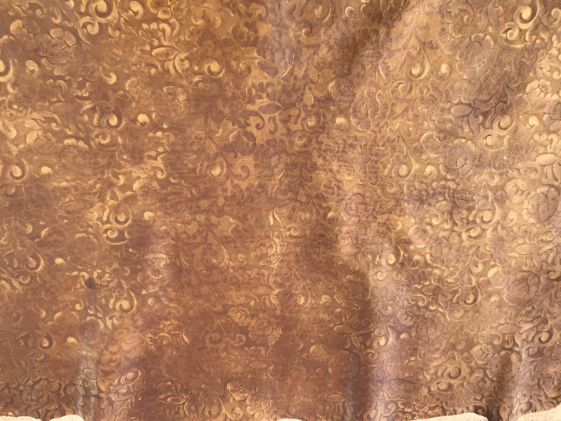 Pellame a vegetale colore Ambra da pelletteria, pelle conciata 100% a vacchetta ingrassata al sego pieno fiore, stampata in rilievo con motivo floreale, colorata manualmente con tamponatura a spugna per ottenere un effetto vintage, per realizzare borse, zaini, cinture, braccialetti, selleria, fondine, portachiavi, incisione, articoli per animali e molto altro.