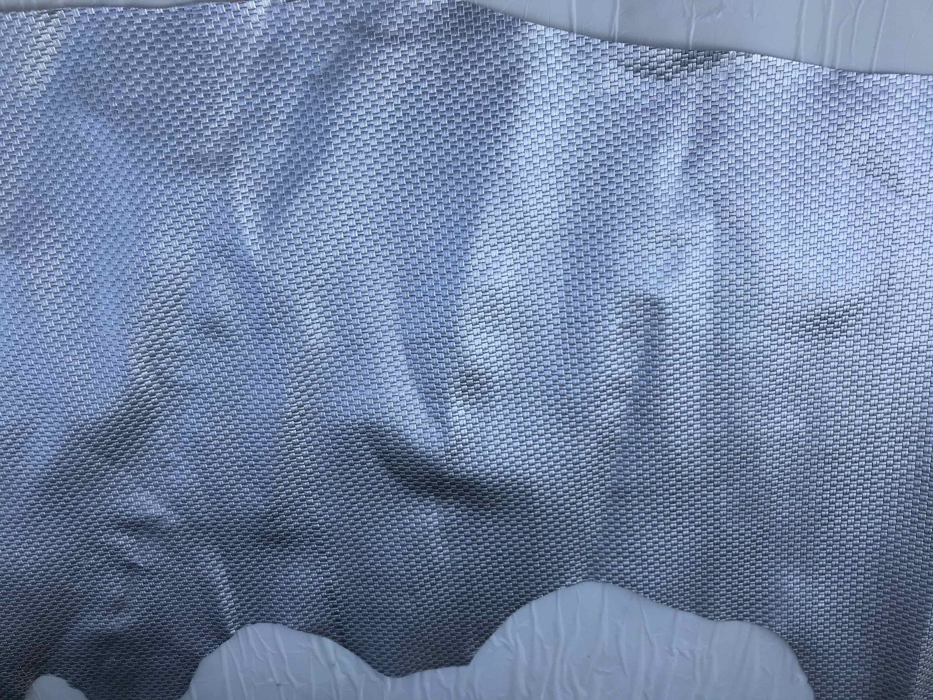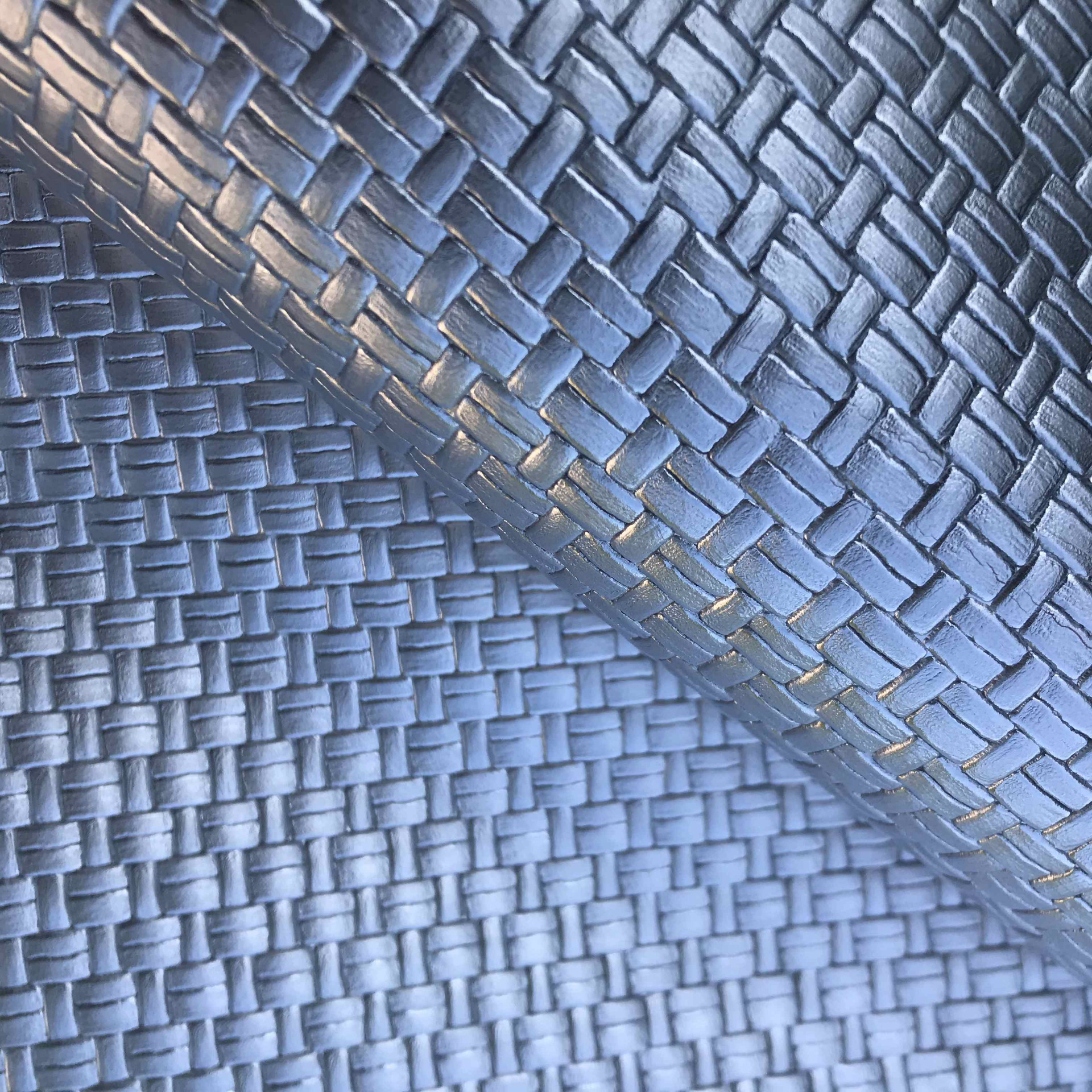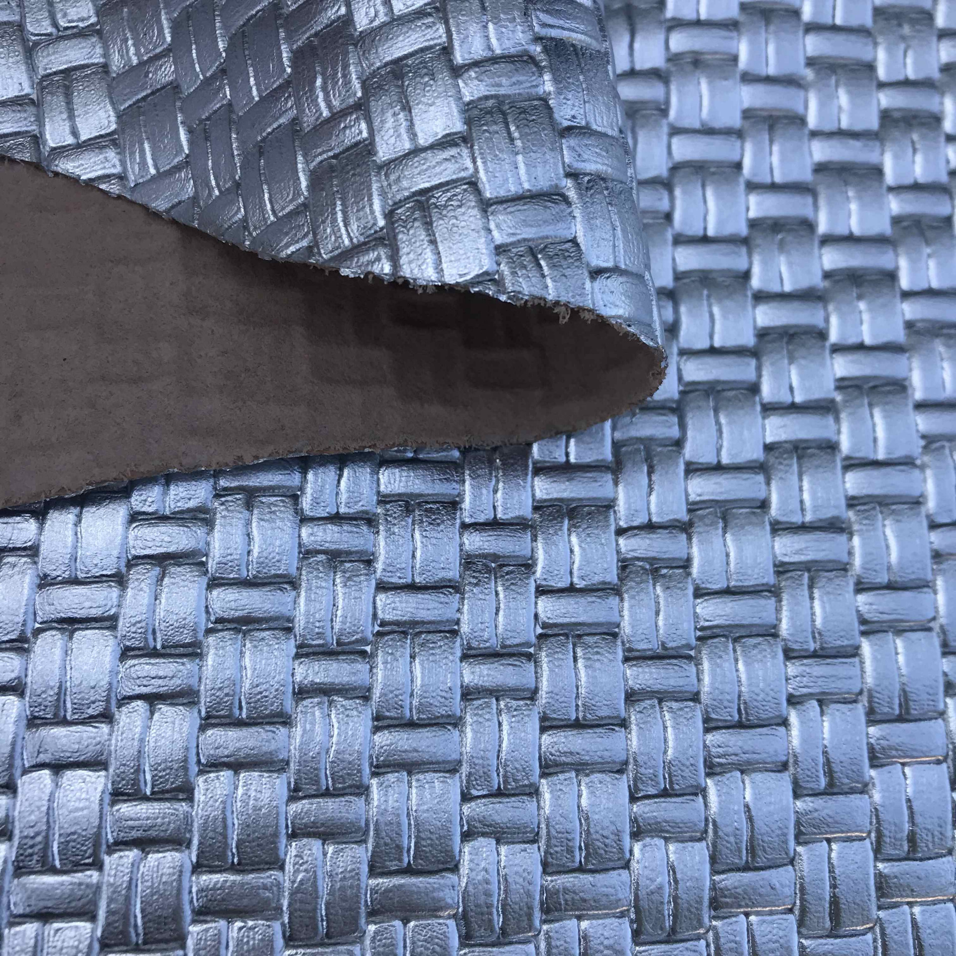 Pellame stampato finitura intreccio conciato a vegetale su fondo naturale di colore argento satinato, pellame semirigido di alta qualità, caratteristiche per la produzione di pelletteria e calzature, cinture, borse, cartelle, tracolle, zaini, braccialetti, svuotatasche, fondine, portachiavi, sandali, infradito e molto altro.