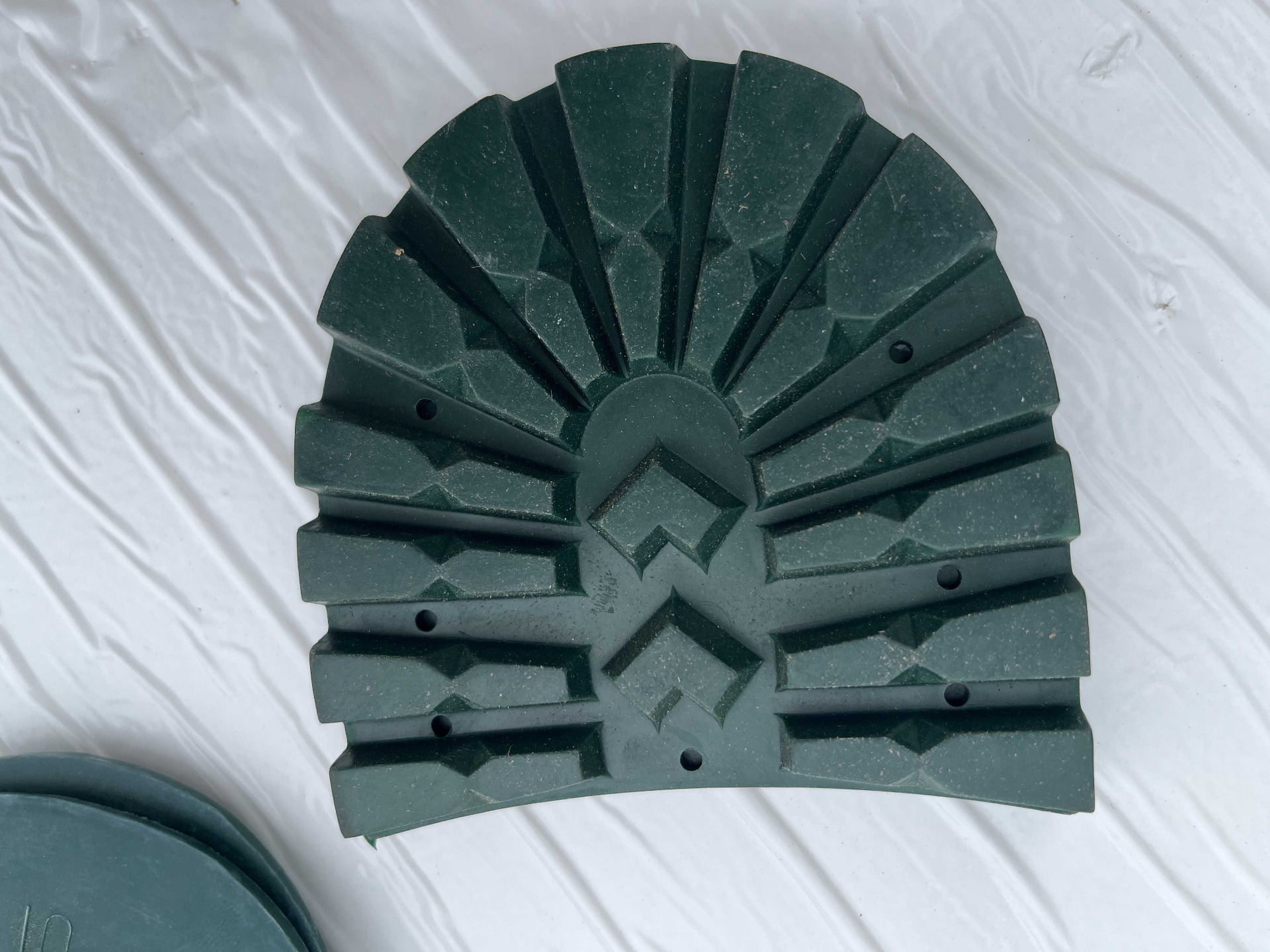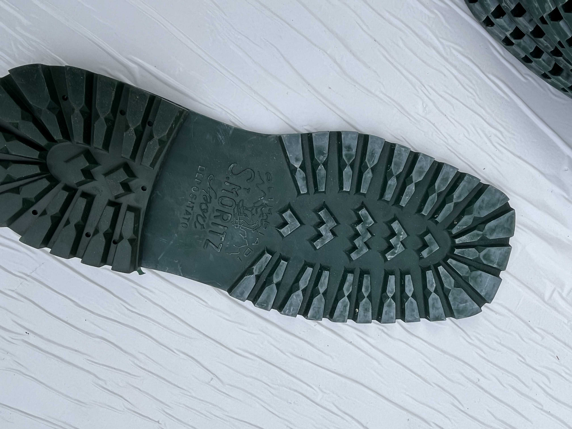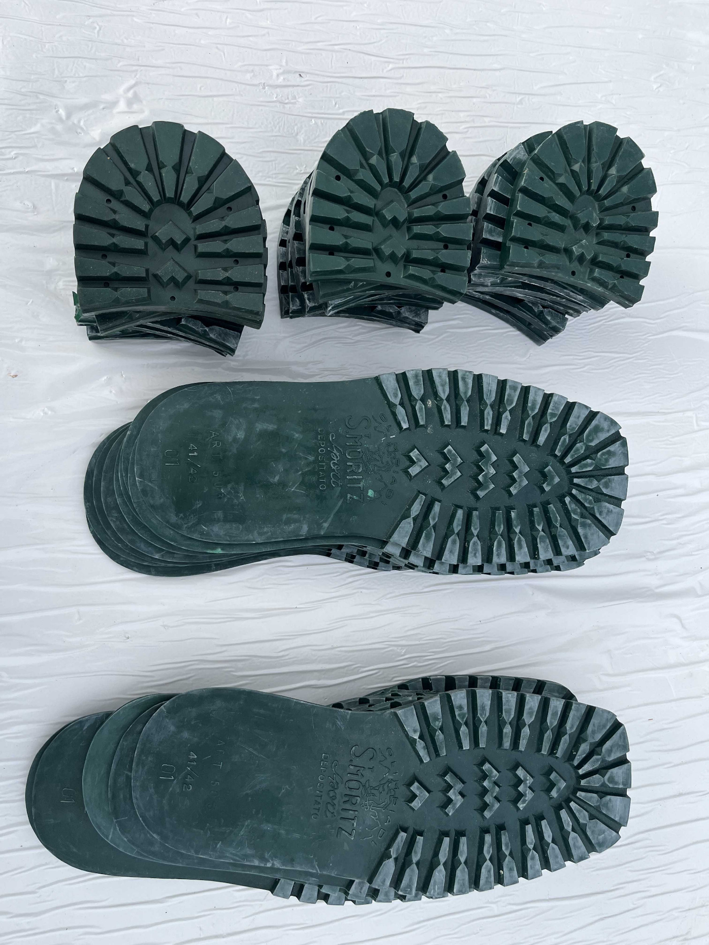 Suole in vera gomma disegno classico carrarmato di colore verde, taglia 41/42 corredate di tacco nella taglia 43/44, attenzione presenza di logo.