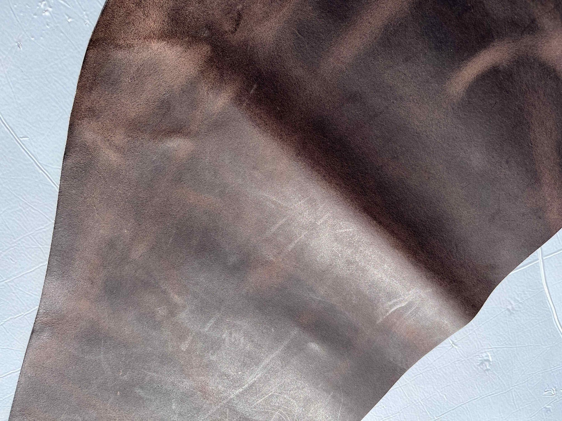 Pellame di vitello trattamento Crazy Horse (pull-up) cerato effetto schiarente, mano morbida e pastosa al tatto, ideale per borse, borselli, cartelle, zaini, portachiavi, legatoria e molto altro.