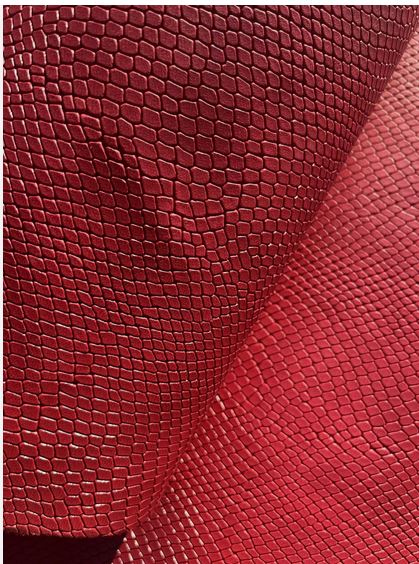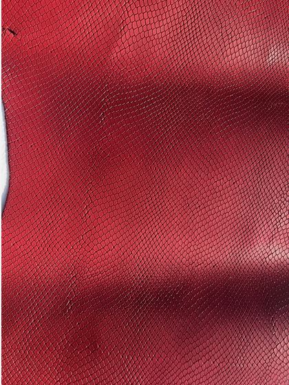 Pellame concia 100% a vegetale di colore rosso stampato imitazione effetto pitone, finitura anilina con caratteristiche naturali per la produzione artigianale di sandali, ciabatte, infradito, svuotatasche, fondine, portachiavi, legatoria, agende, incisione e molto altro.