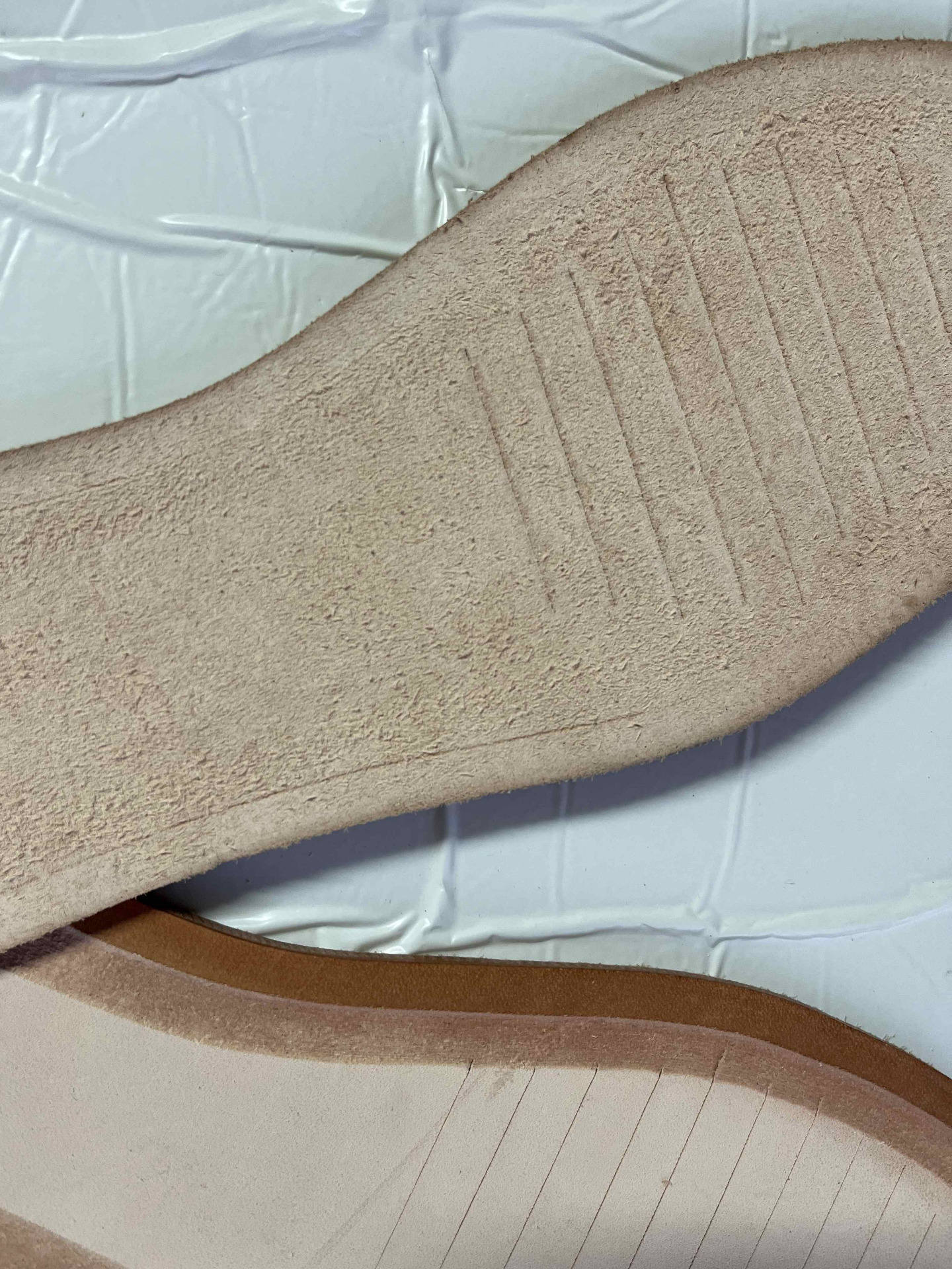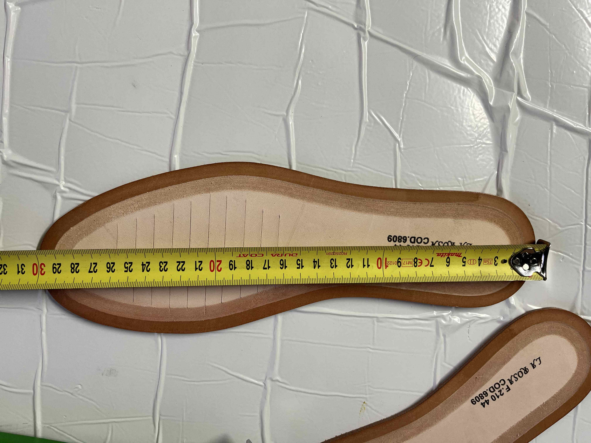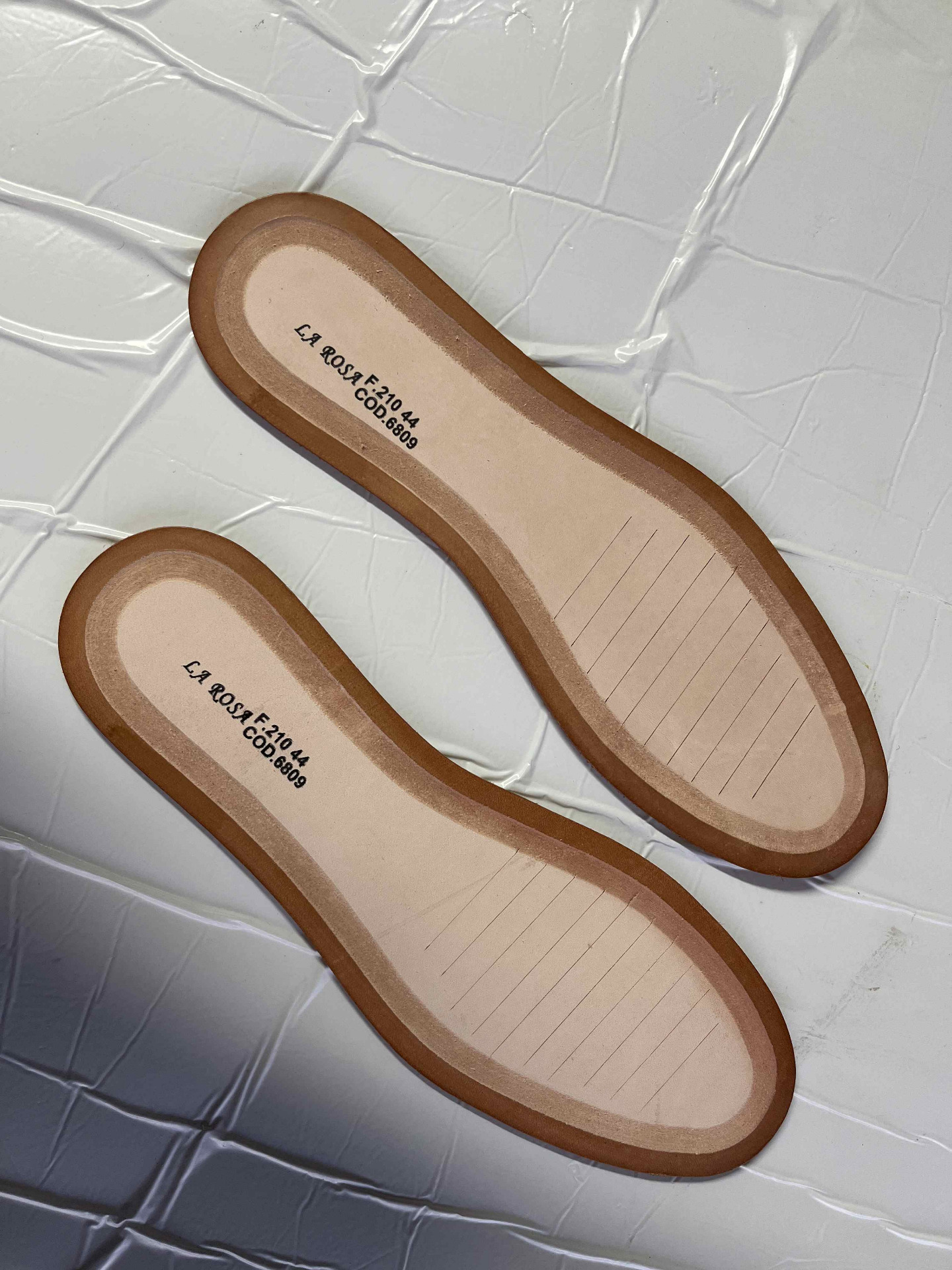 Solette in cuoio per intersuola tranciati da 4 mm di spessore misura unica trenta centimetri, presente una scritta su tutti i soletti come nelle immagini.