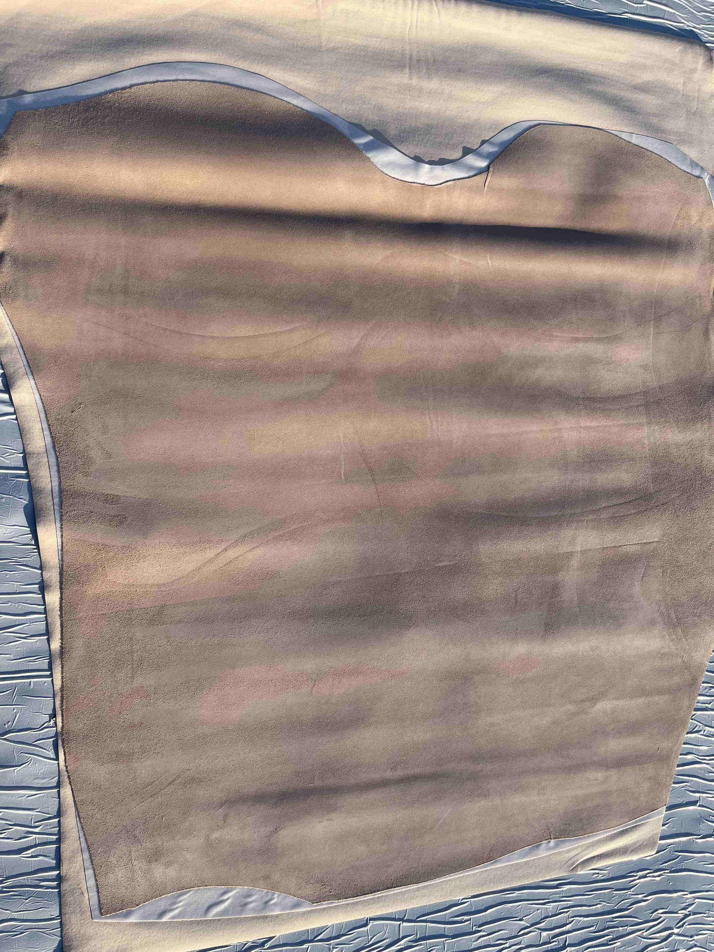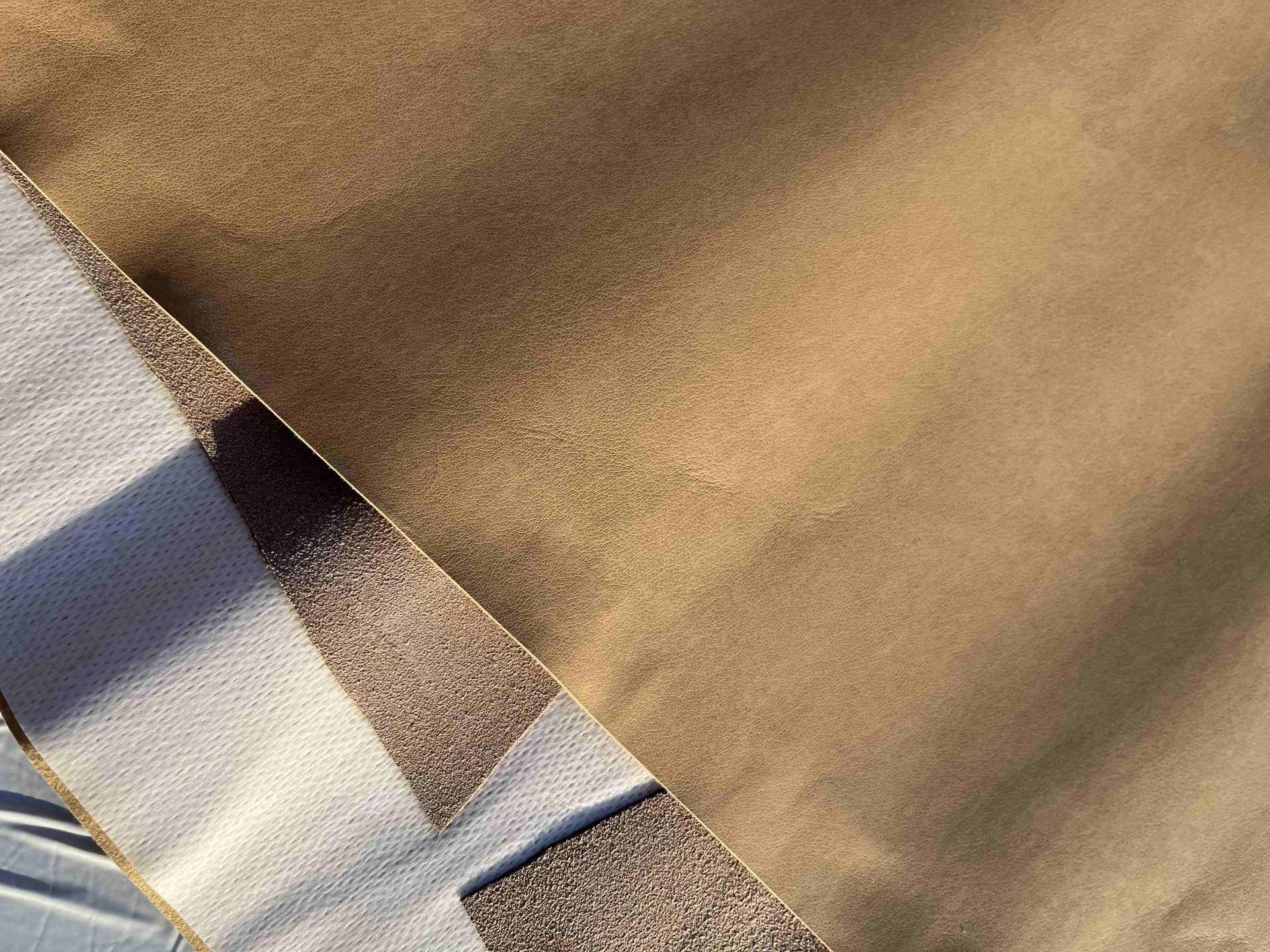 Pellame scamosciato accoppiato con ecopelle, mano semirigida, alto spessore, ampiamente utilizzato nel settore della pelletteria e calzatura nella tranciatura di tomaie per sandali, infradito e ciabatte, borse, cinture, collari e molto altro, consente di ottenere una tomaia con il retro già completo di fodera pronta per il montaggio.