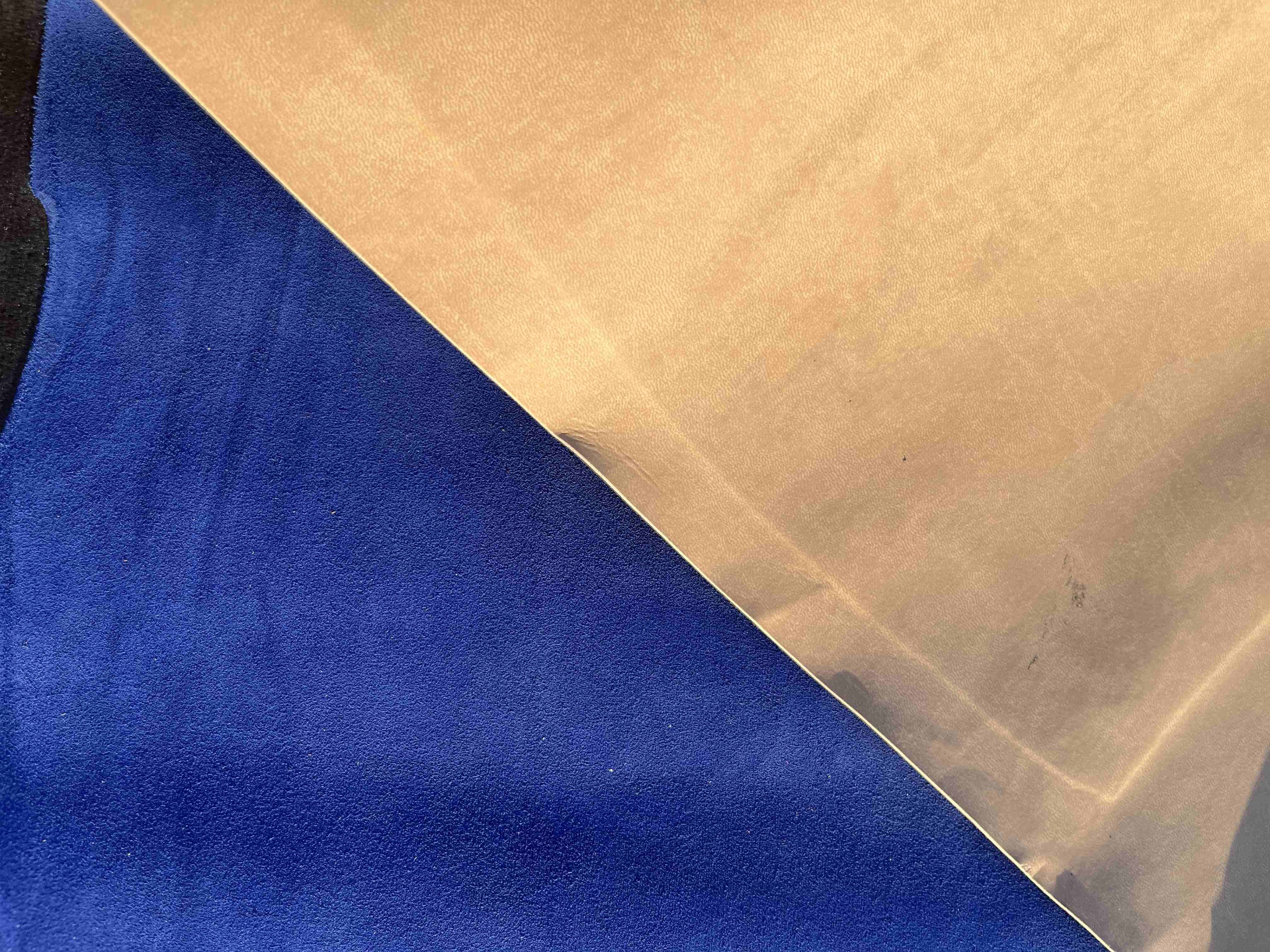 Pellame scamosciato accoppiato con ecopelle, mano semirigida, alto spessore, ampiamente utilizzato nel settore della pelletteria e calzatura nella tranciatura di tomaie per sandali, infradito e ciabatte, borse, cinture, collari e molto altro, consente di ottenere una tomaia con il retro già completo di fodera pronta per il montaggio.
