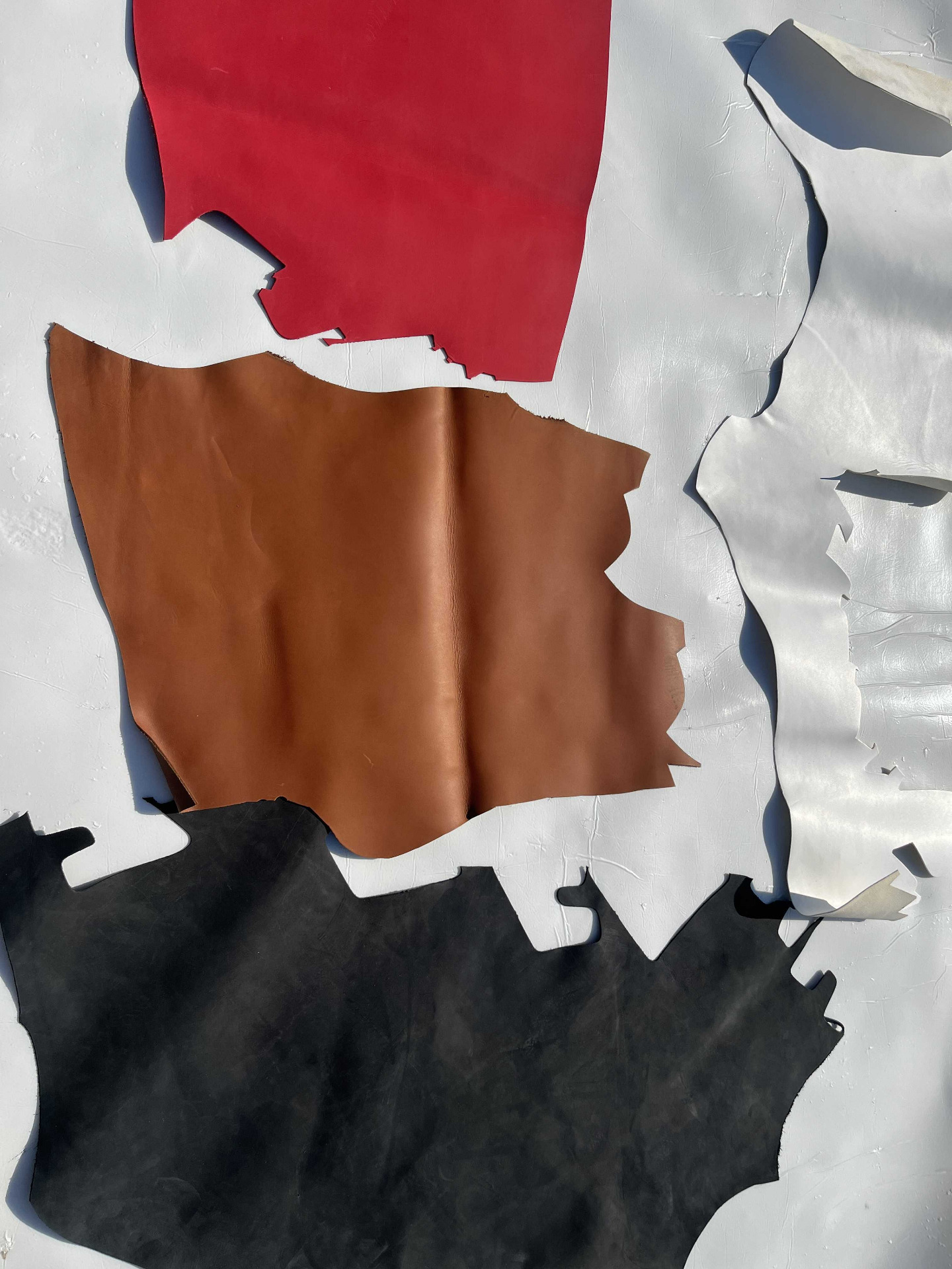 Cartone da 5 chili con pezzami in cuoio assortiti di grandi dimensioni, colori e spessori diversi, pezzi di pelle liscia e bottalata, causa del differente display del pc e della luminosità, colori online potrebbero essere leggermente diversi dai colori reali.