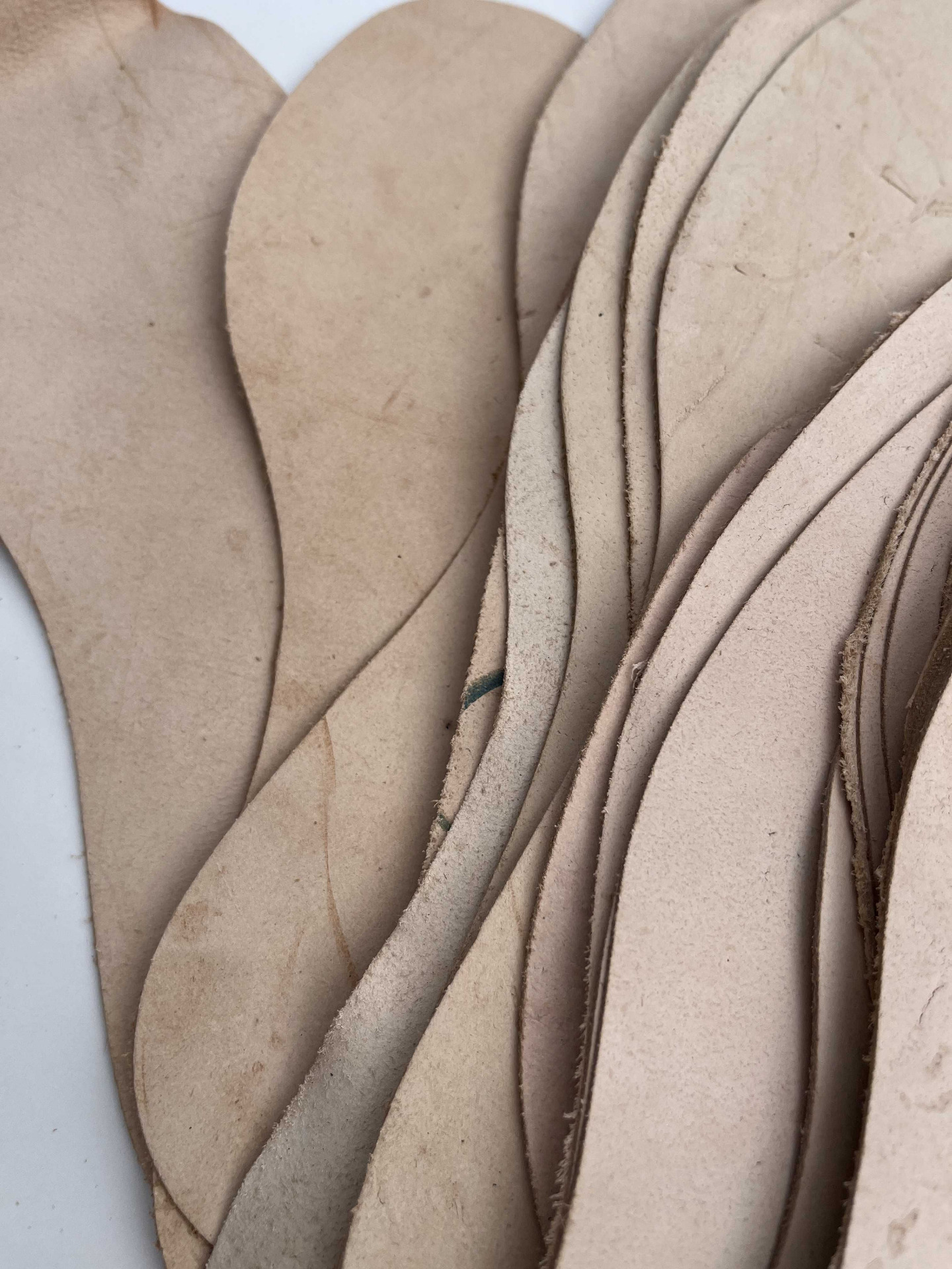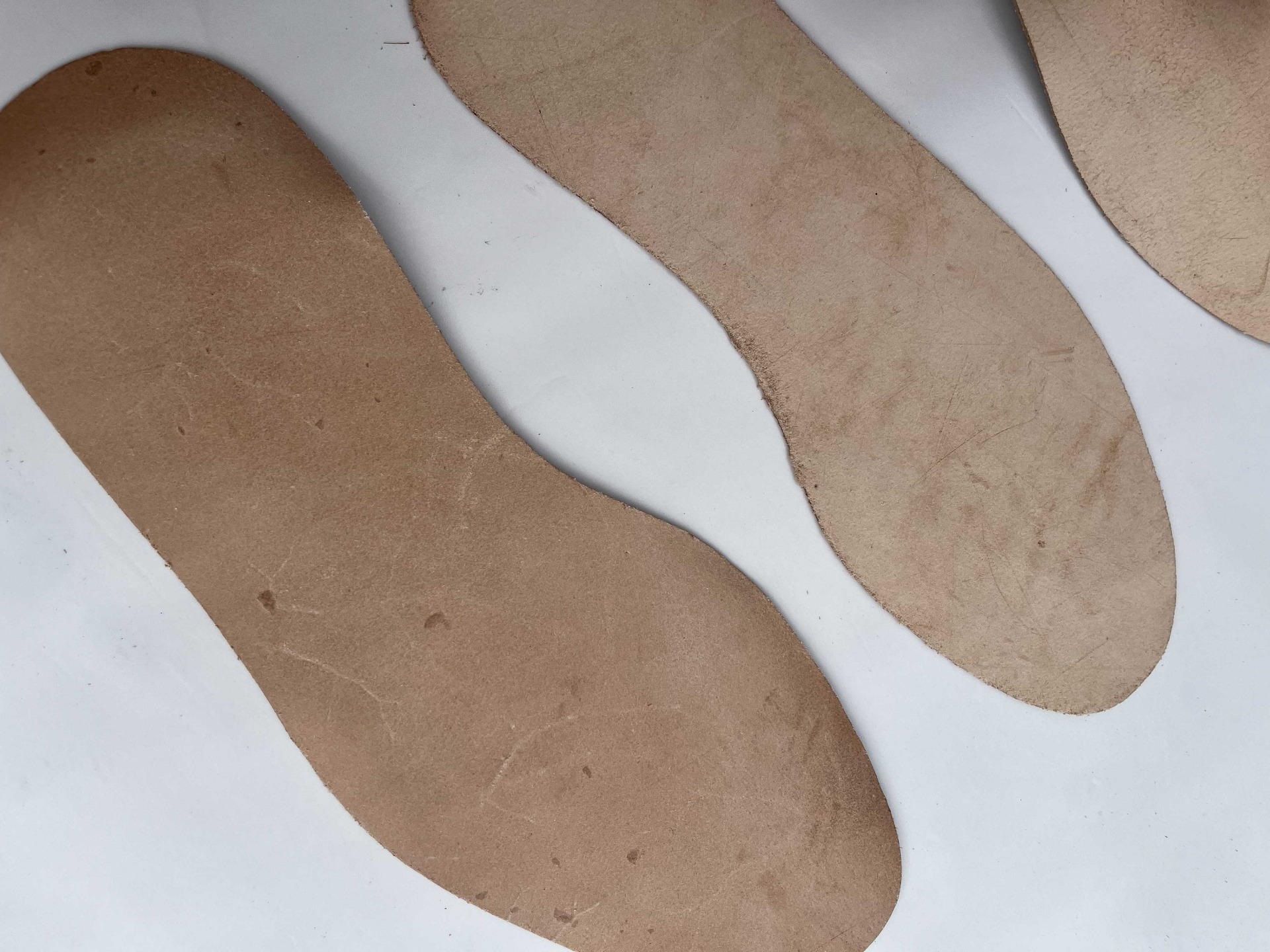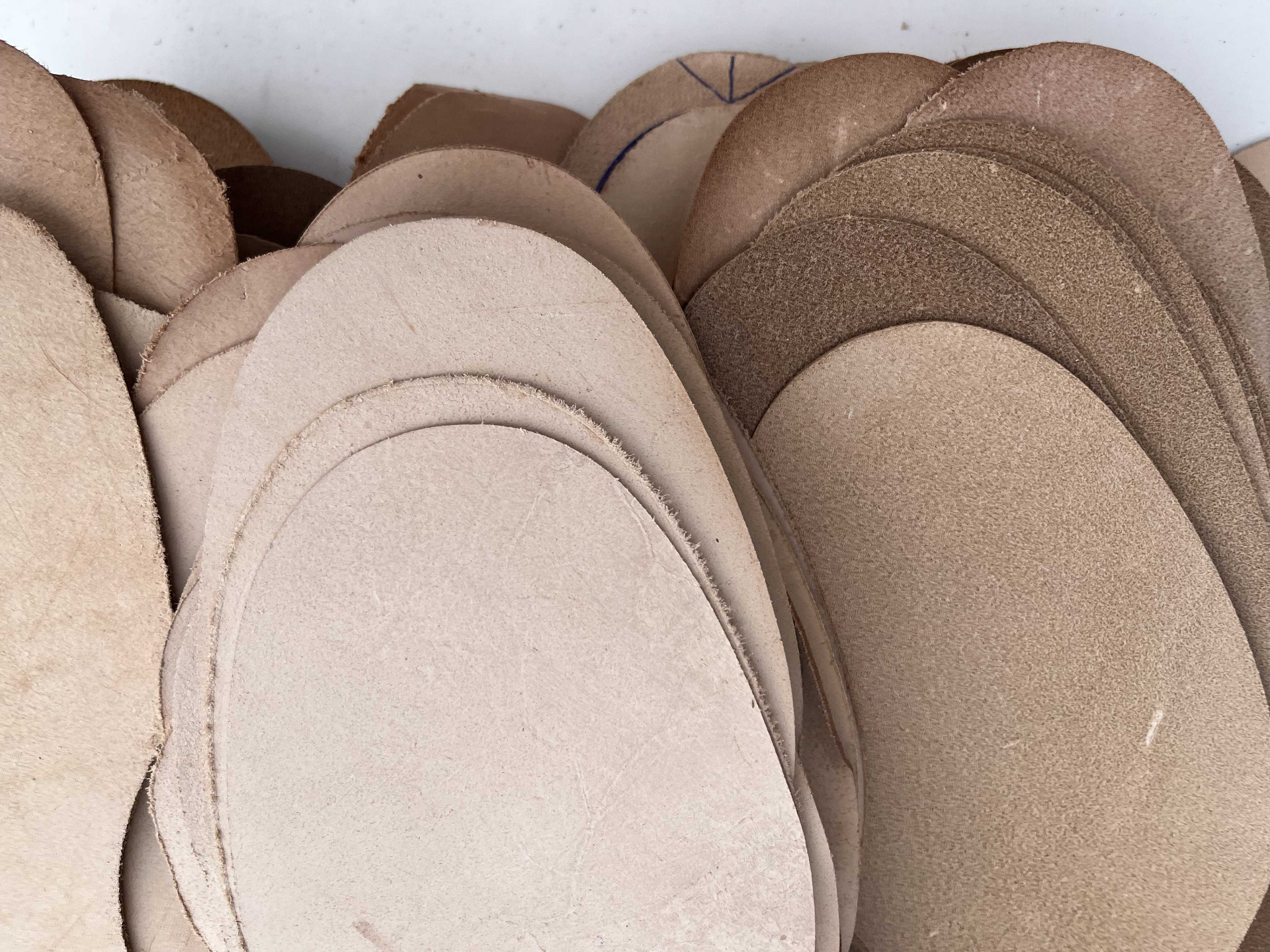 Solette per scarpe in pelle di crosta al vegetale, varie misure, quantità approssimativa circa 500 pezzi, non ha valore vincolante poiché vendita a peso.