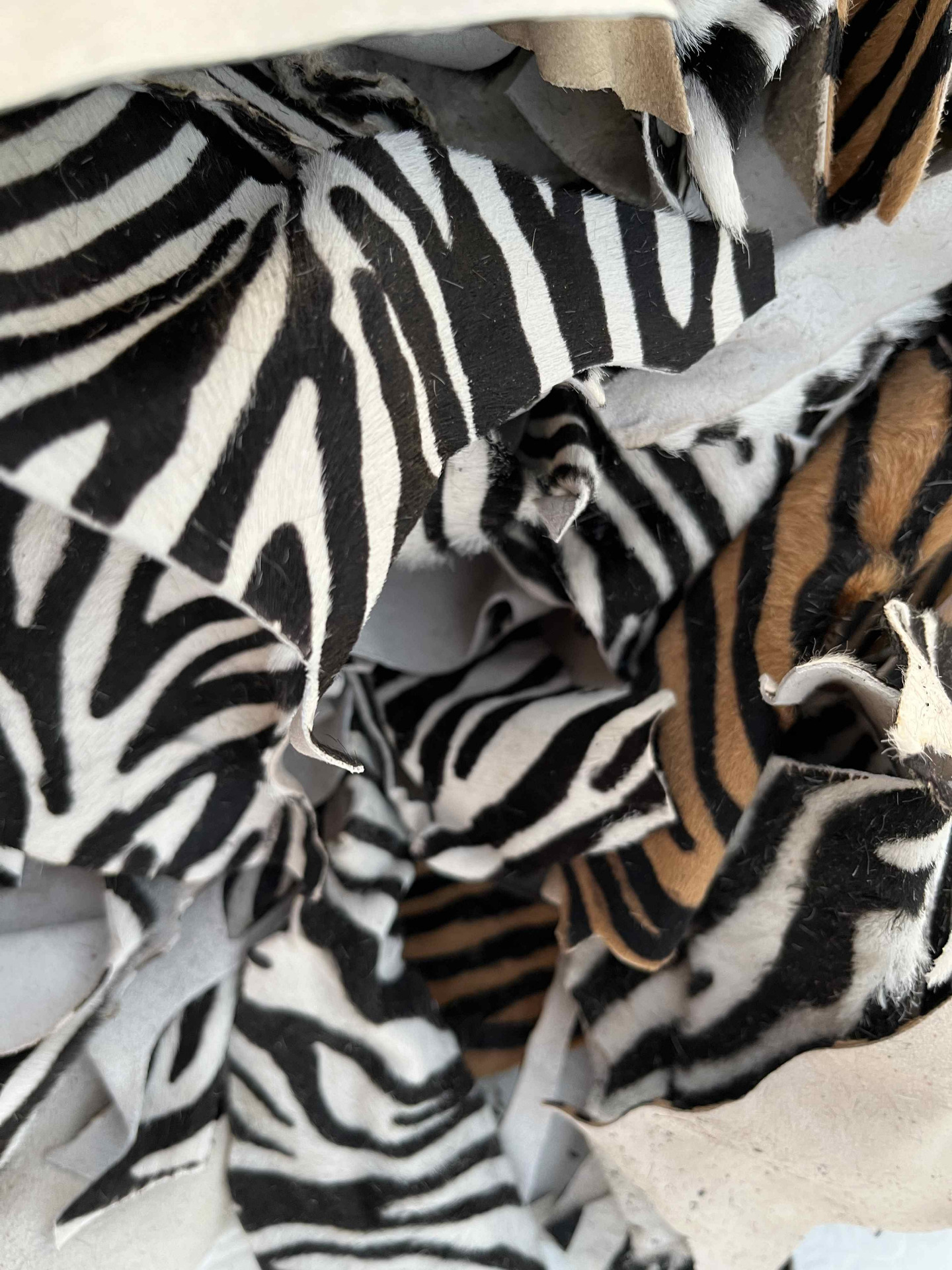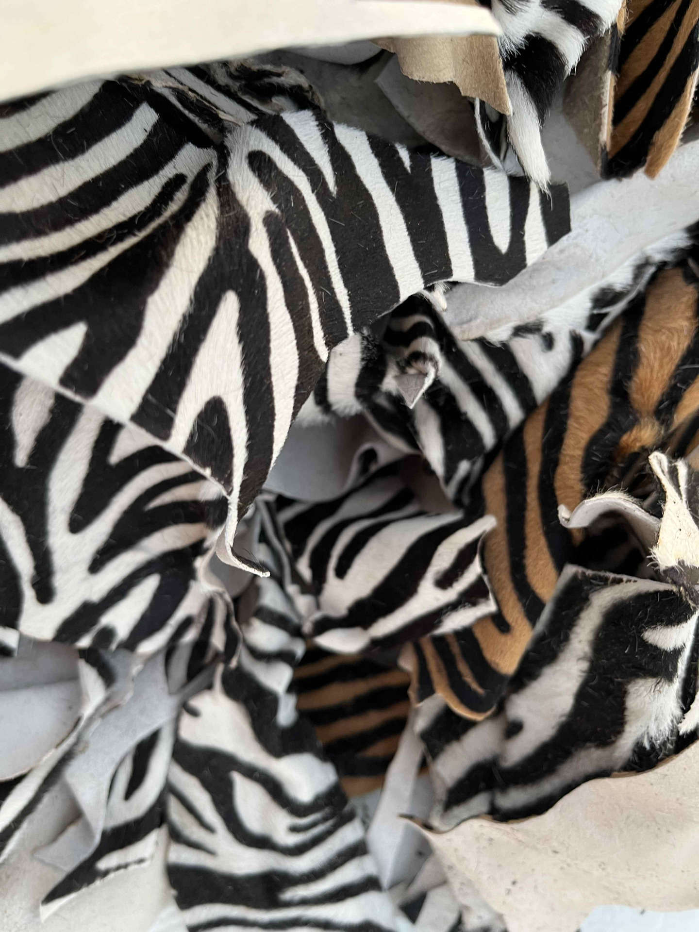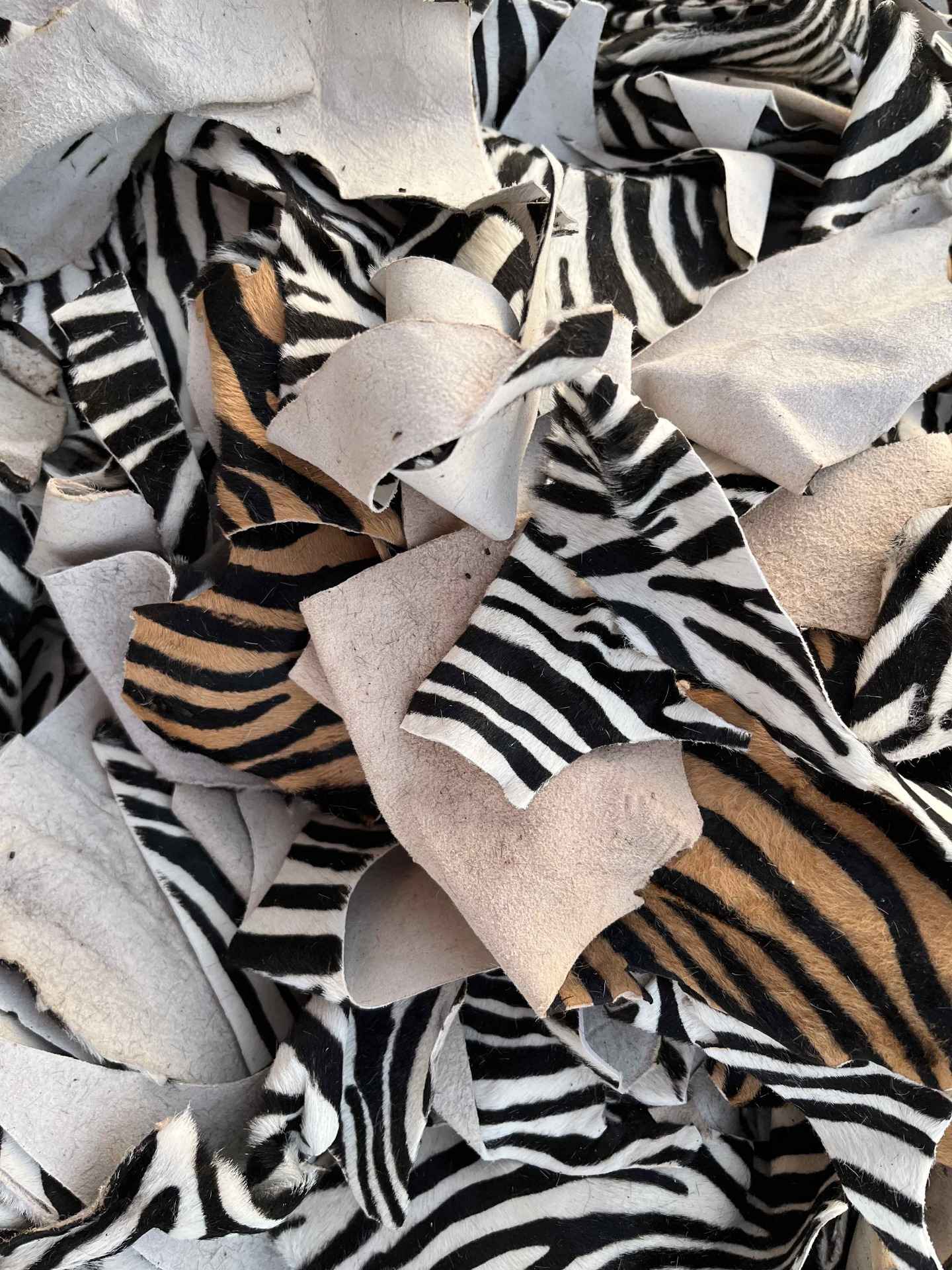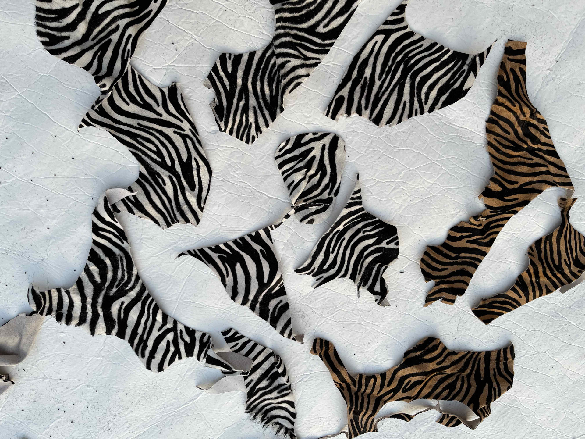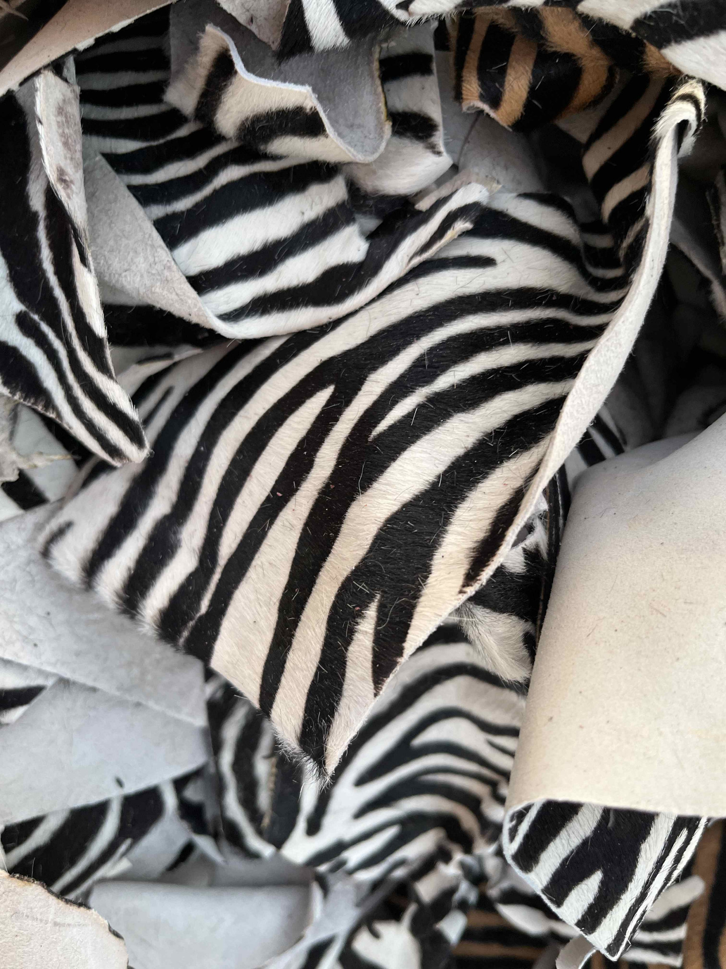 Pellame rifinizione cavallino zebrato in due varianti di colore, 90% bianco e nero, 10% nocciola e testa di moro, ritagli di piccole dimensioni per hobby creativi e piccola pelletteria, portachiavi, braccialetti, articoli per animali e molto altro.