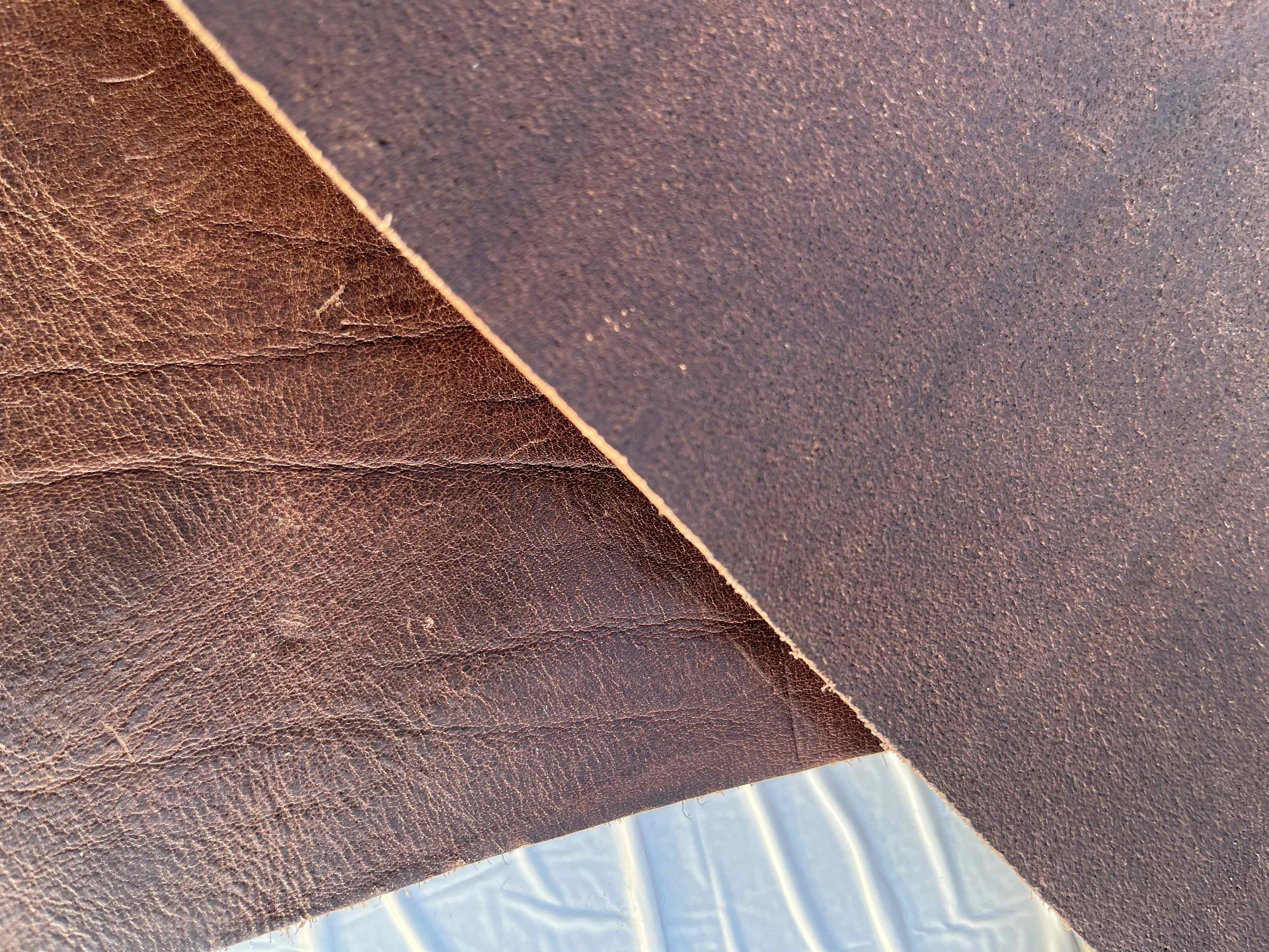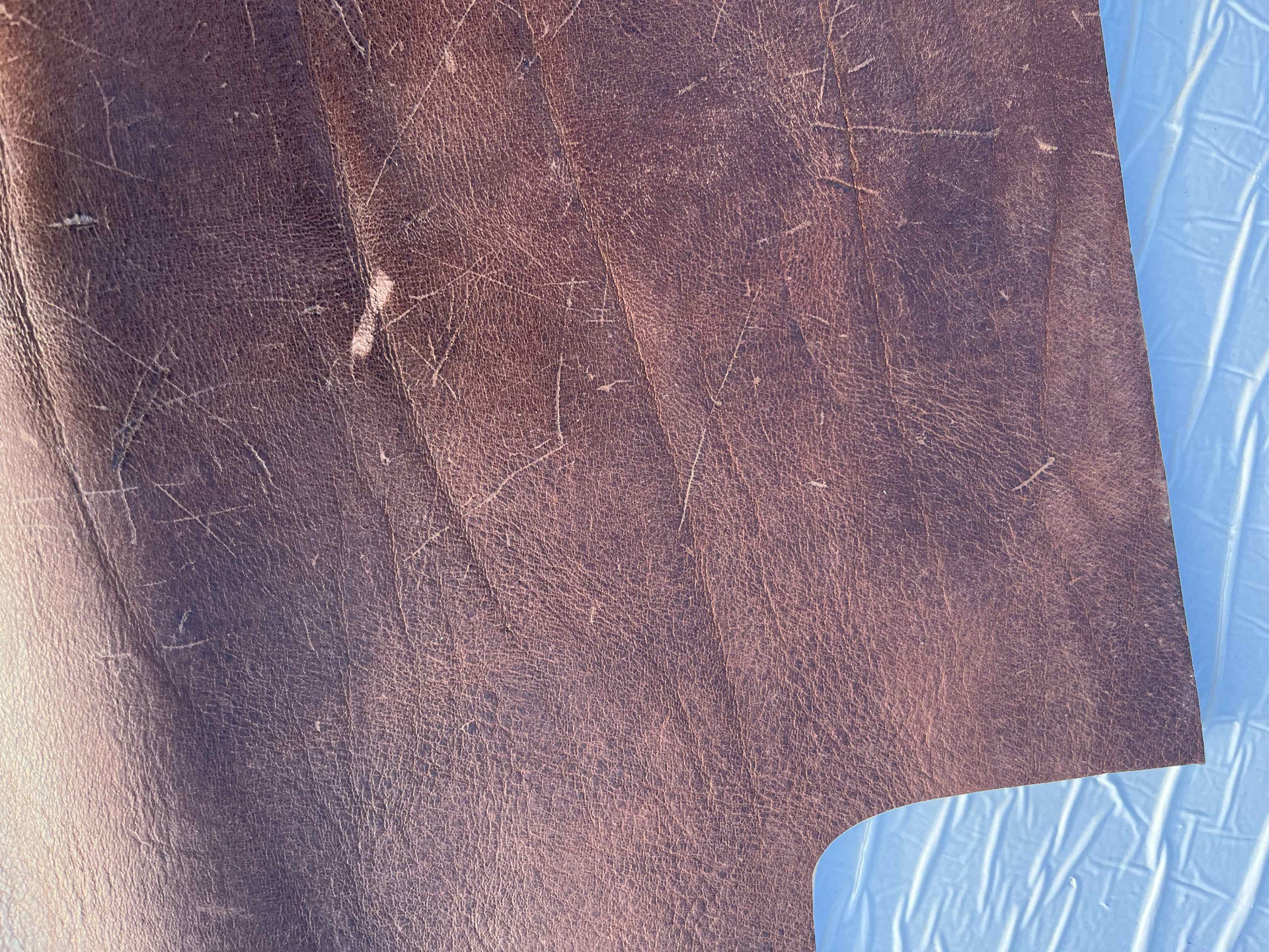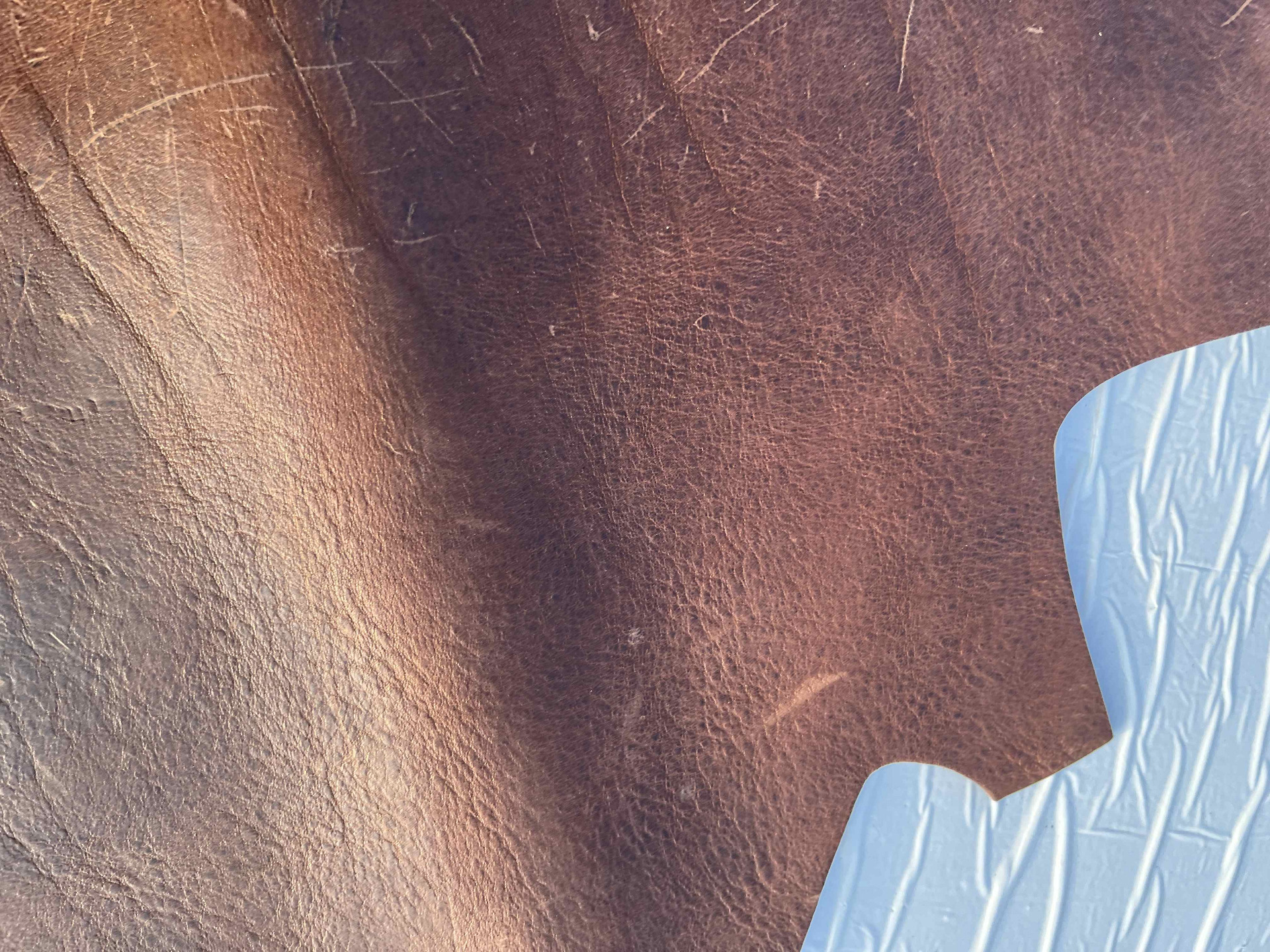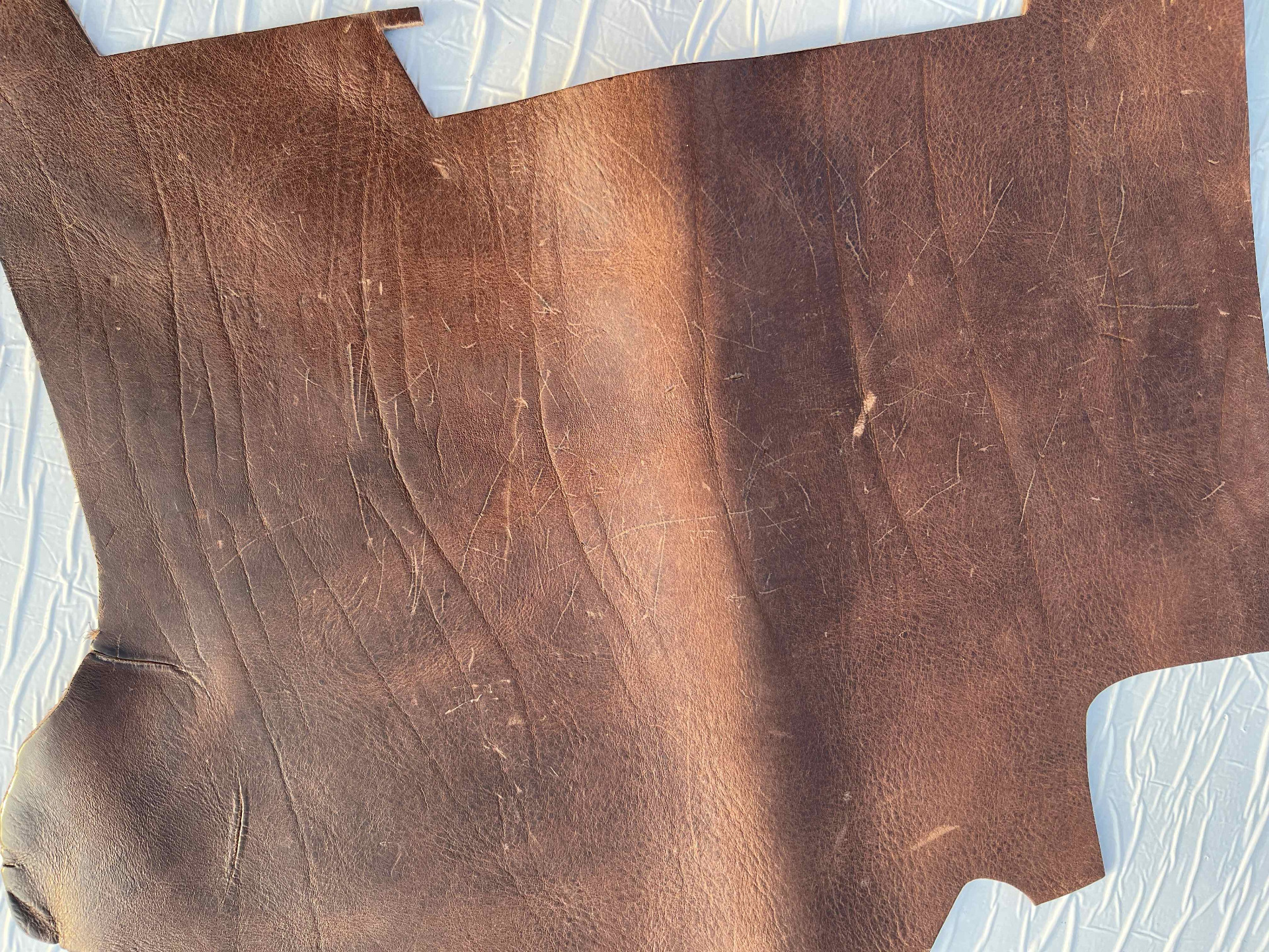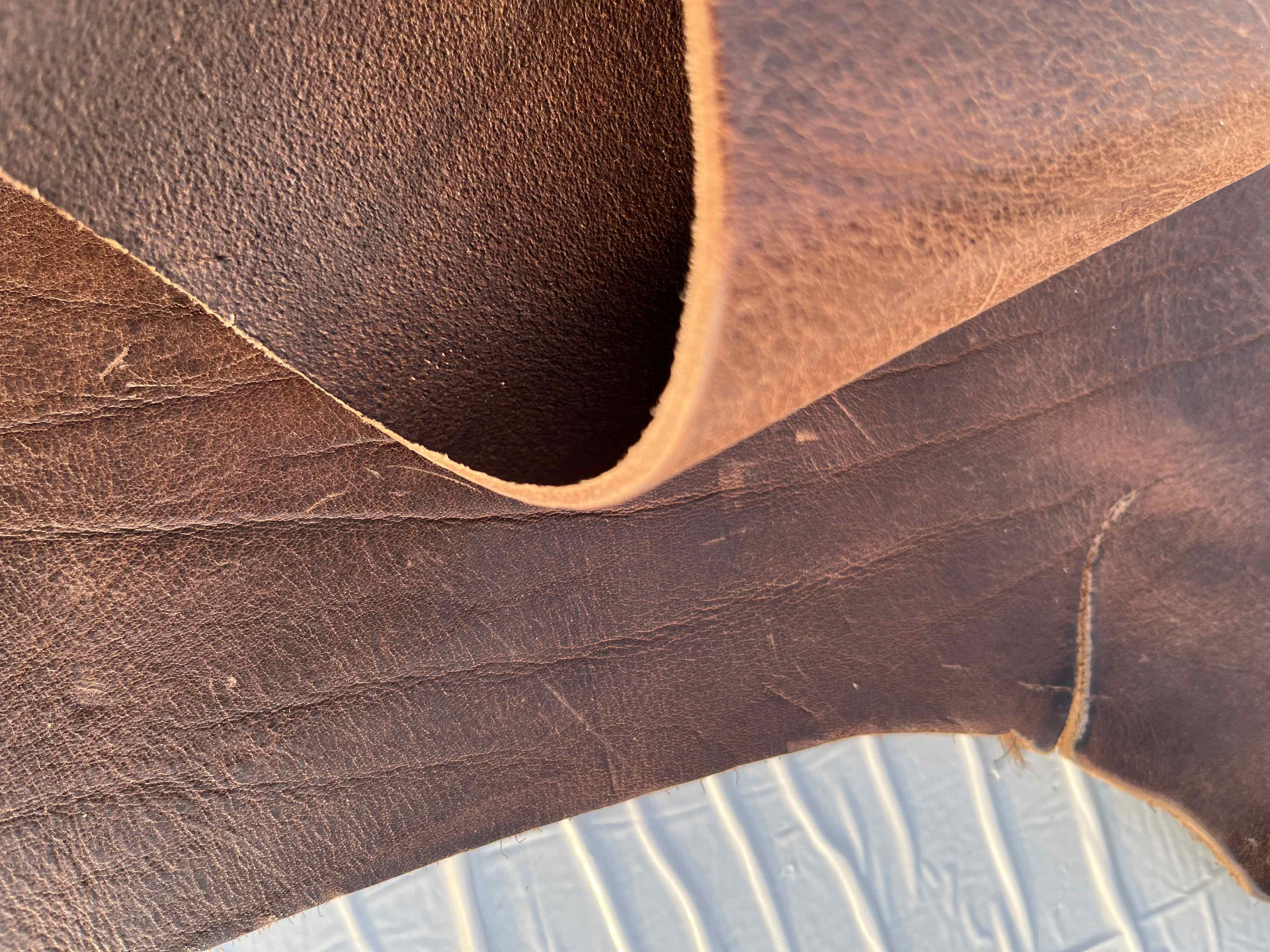 Pellame conciato 100% a vegetale liscio effetto Crazy Horse (Pull up), ingrassato al sego, pieno fiore anilina pura di botte senza nessuna correzione in rifinizione, mano morbida e pastosa ideale per la produzione piccola pelletteria artigianale, portachiavi, svuotatasche, collari, fondine, cinturini, selleria, nautica, articoli per animali, legatoria, incisione e molto altro.