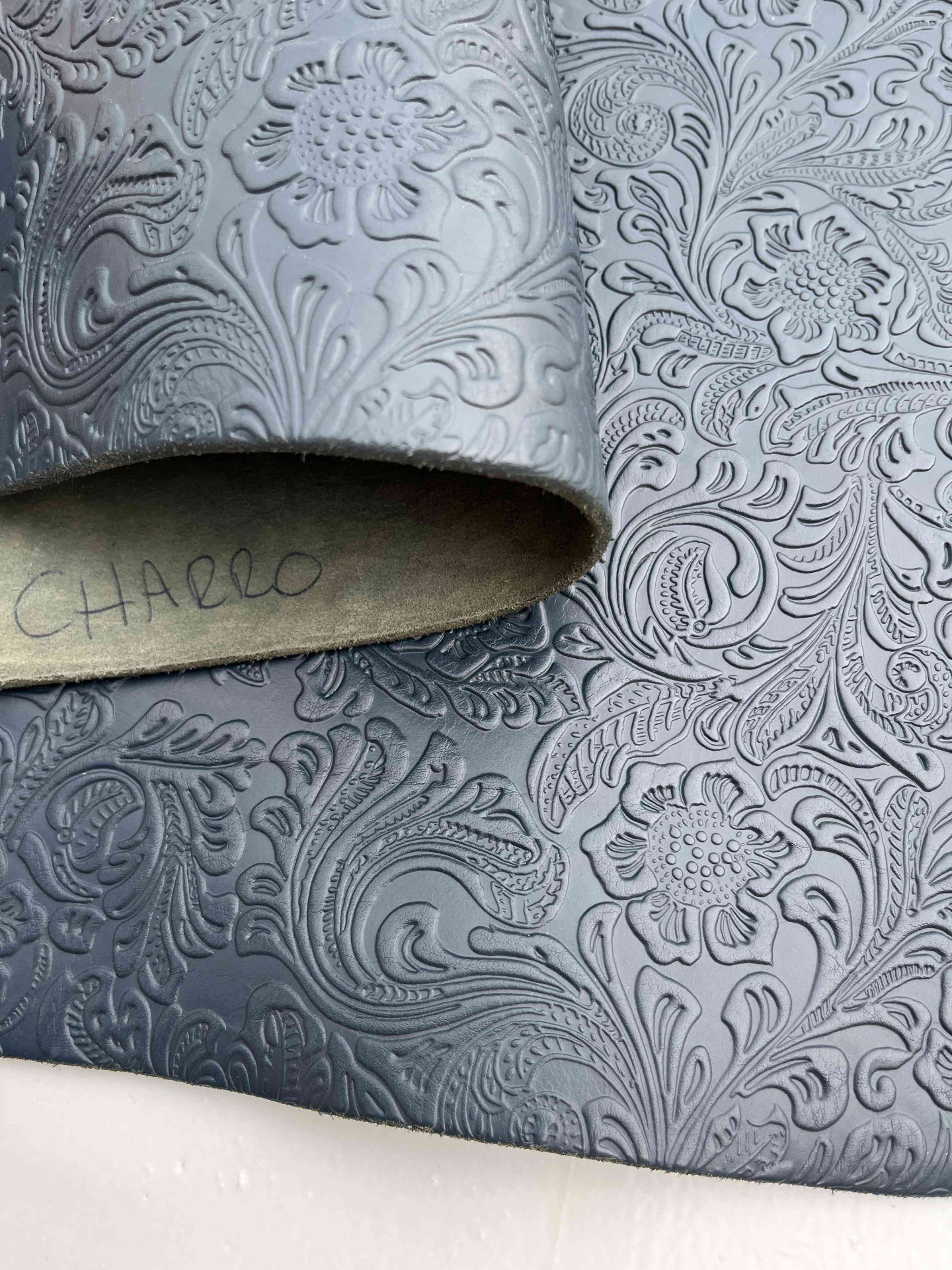 Pelle concia 100% a vegetale colore blu stampata charro da