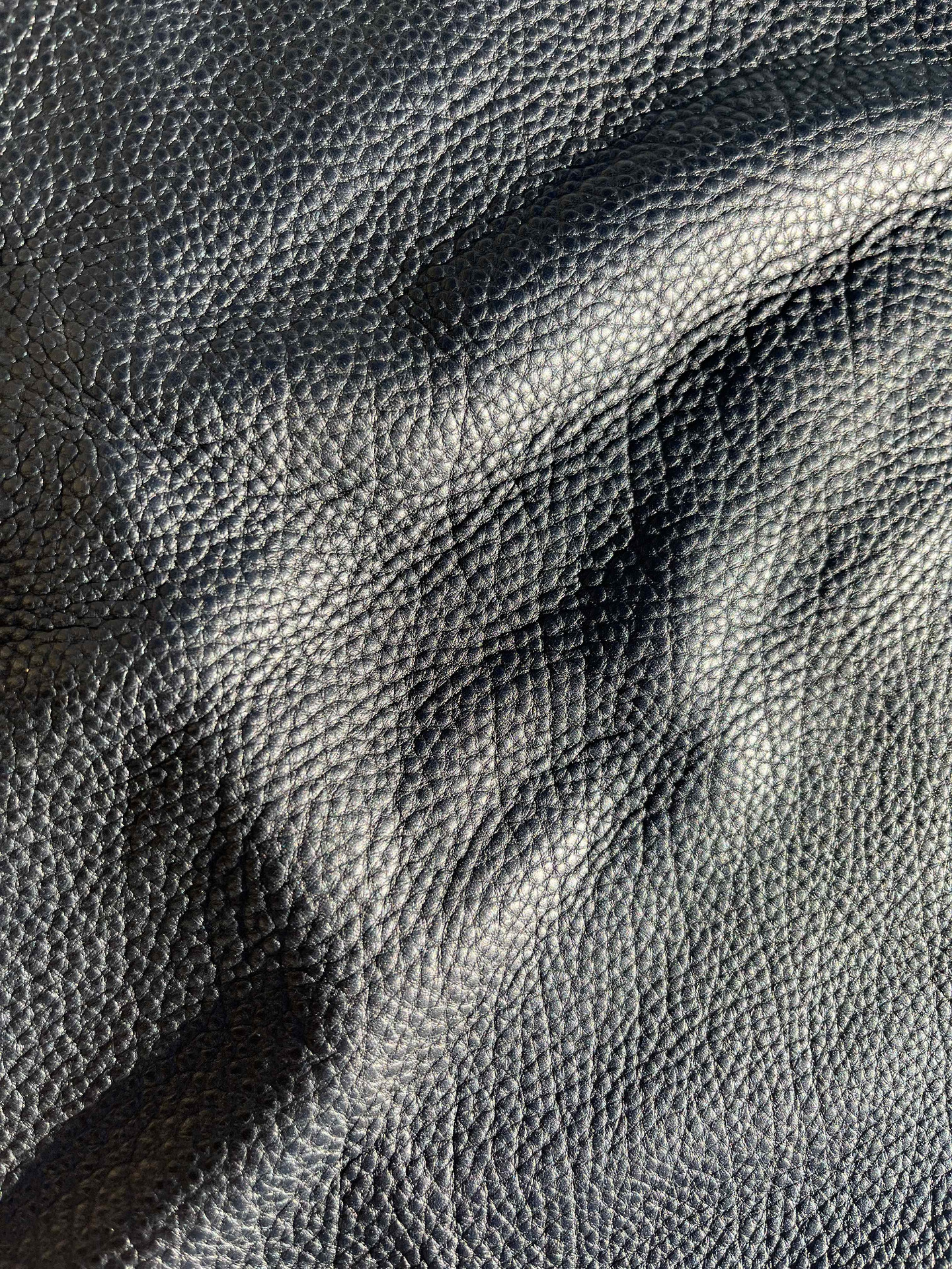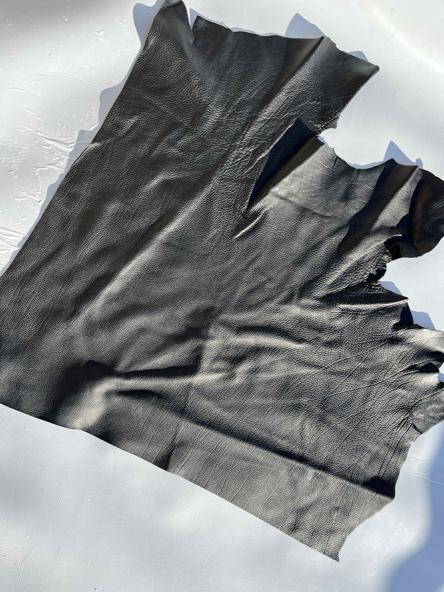 Pellame di vitello bottalato nero con una mano piena e morbida, grana naturale, morbido al tatto con un aspetto semi lucido, finitura anilina pieno fiore segni e imperfezioni non sono da considerarsi difetti, ma caratteristiche naturali, scampolo grande ideale per la produzione di piccola pelletteria, selleria, calzature e molto altro.