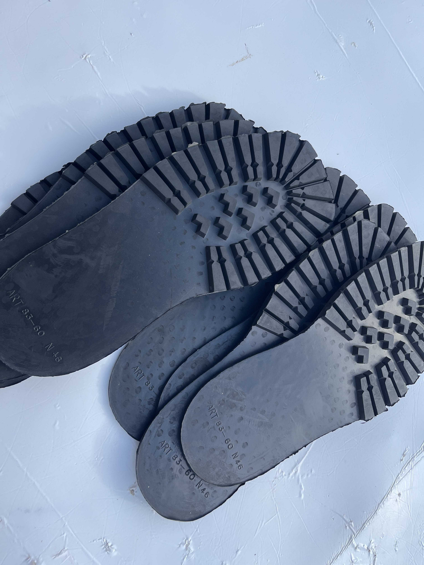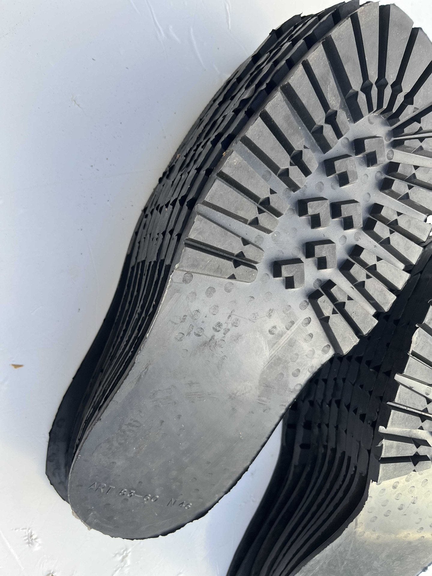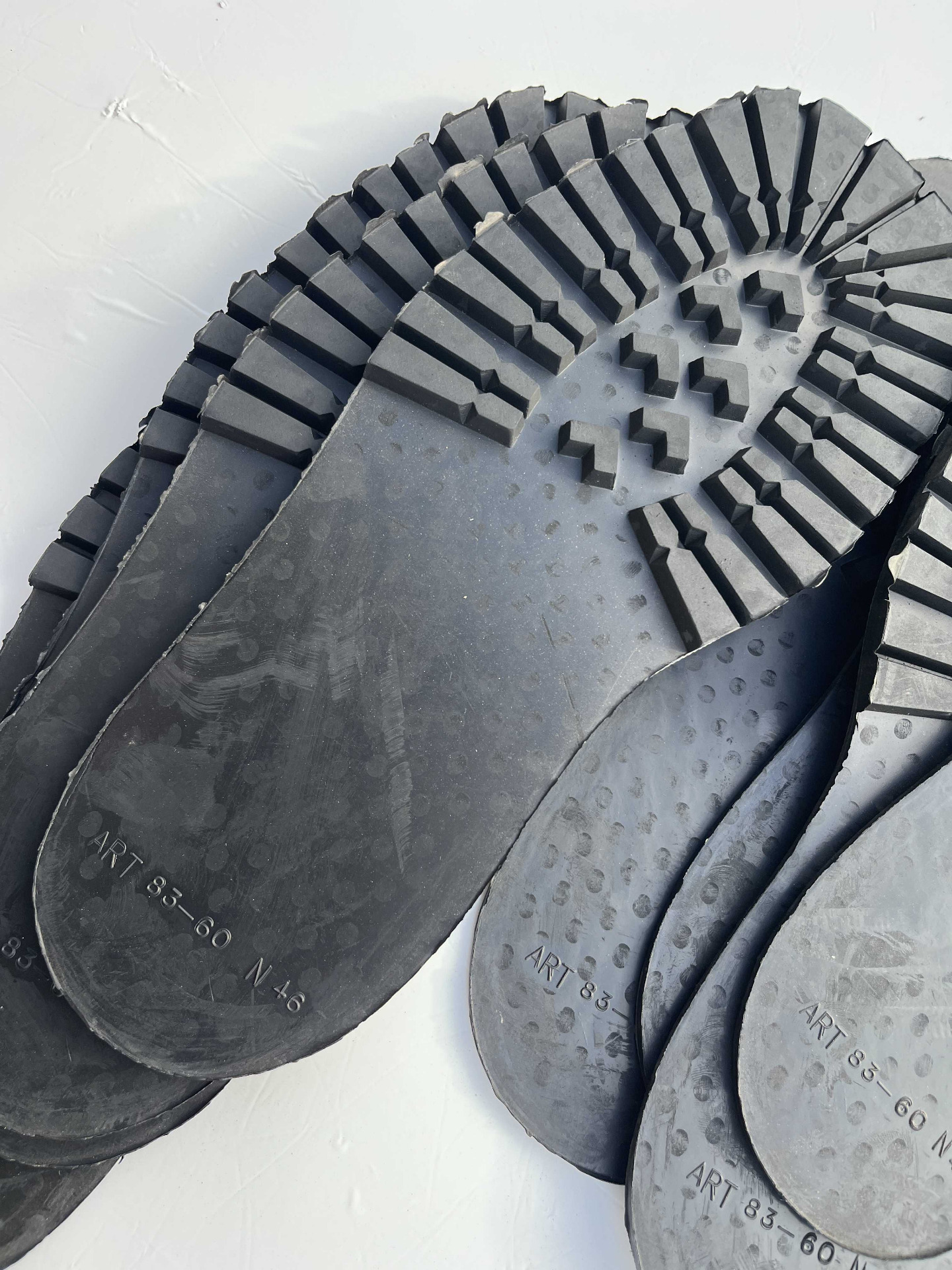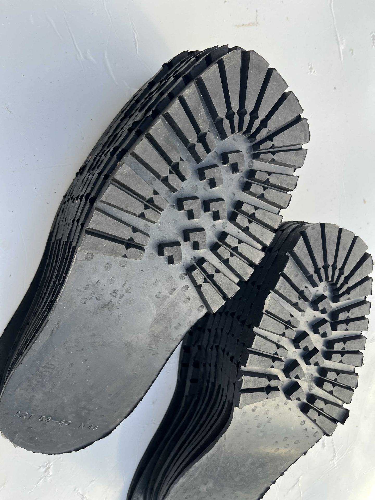 Suole in vera gomma senza tacco, classico disegno carrarmato colore nero, cardate nella parte retro, numerazione unica 46 lotto da 11 paia.