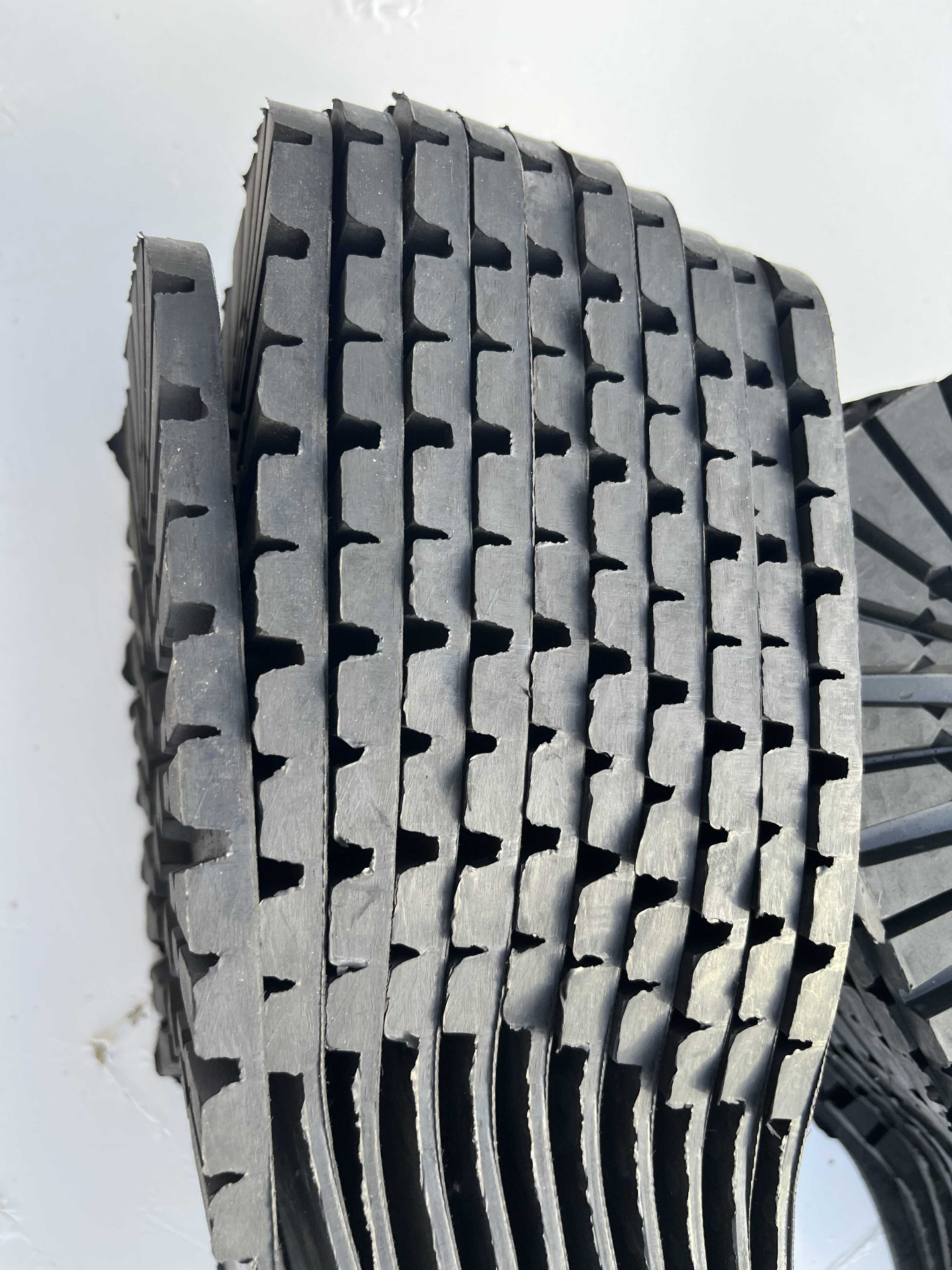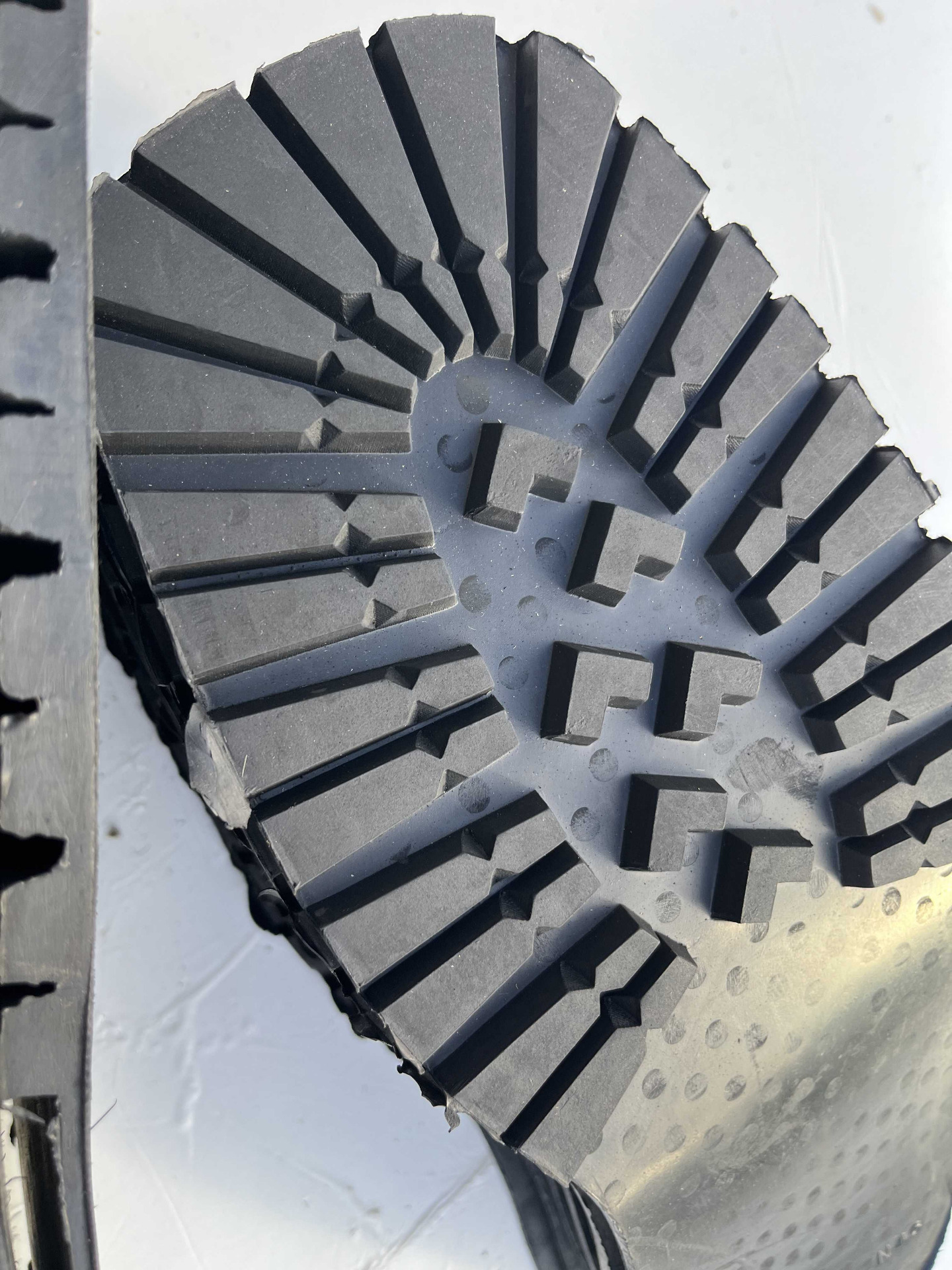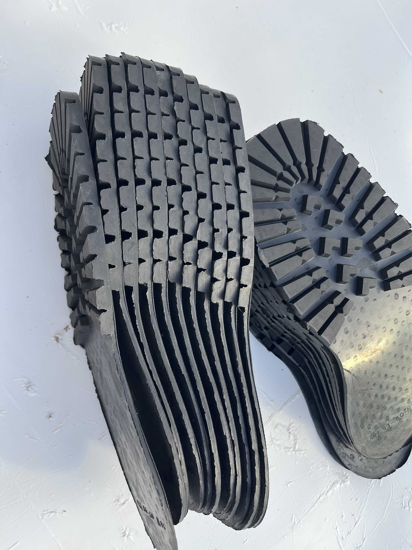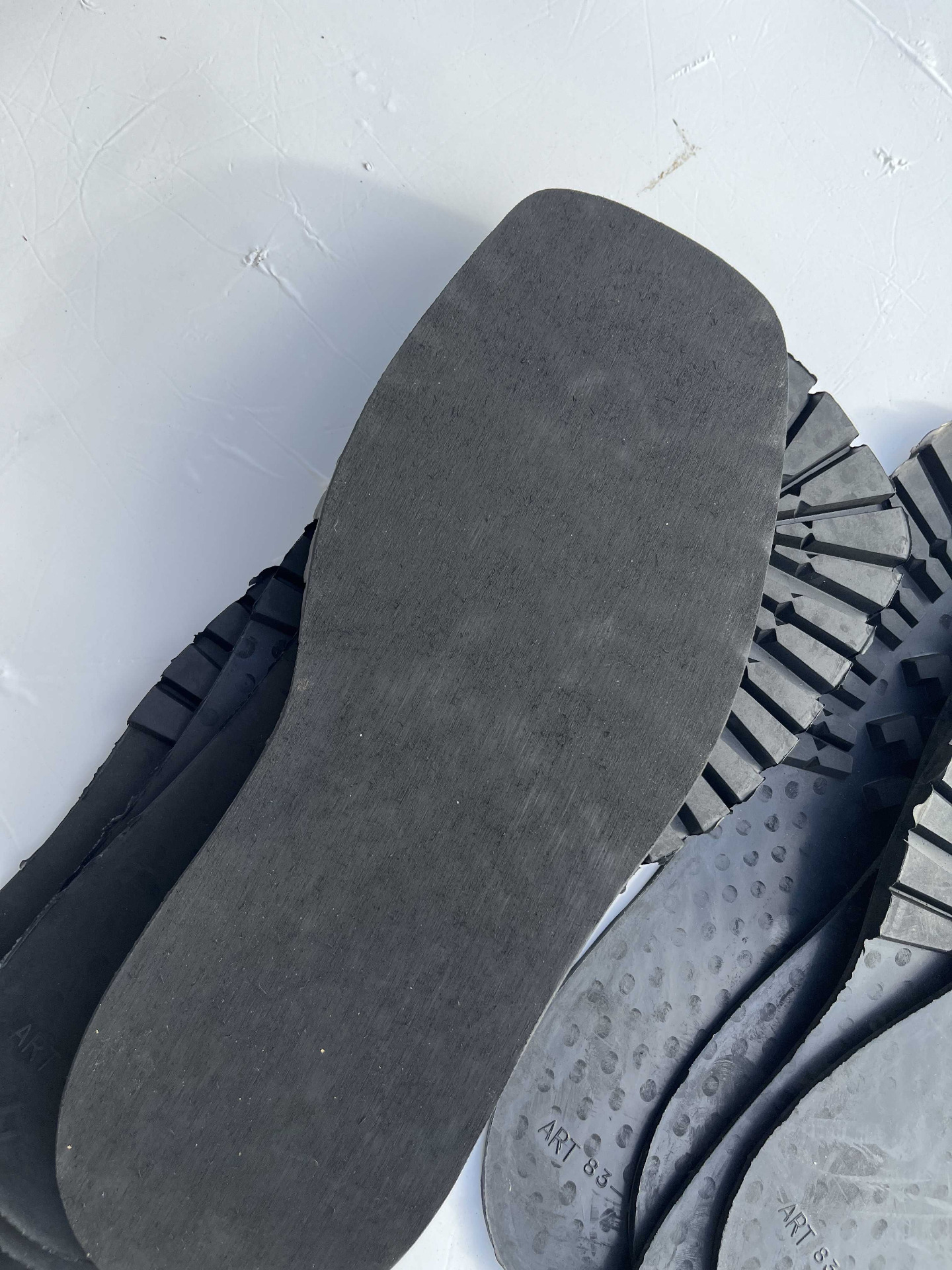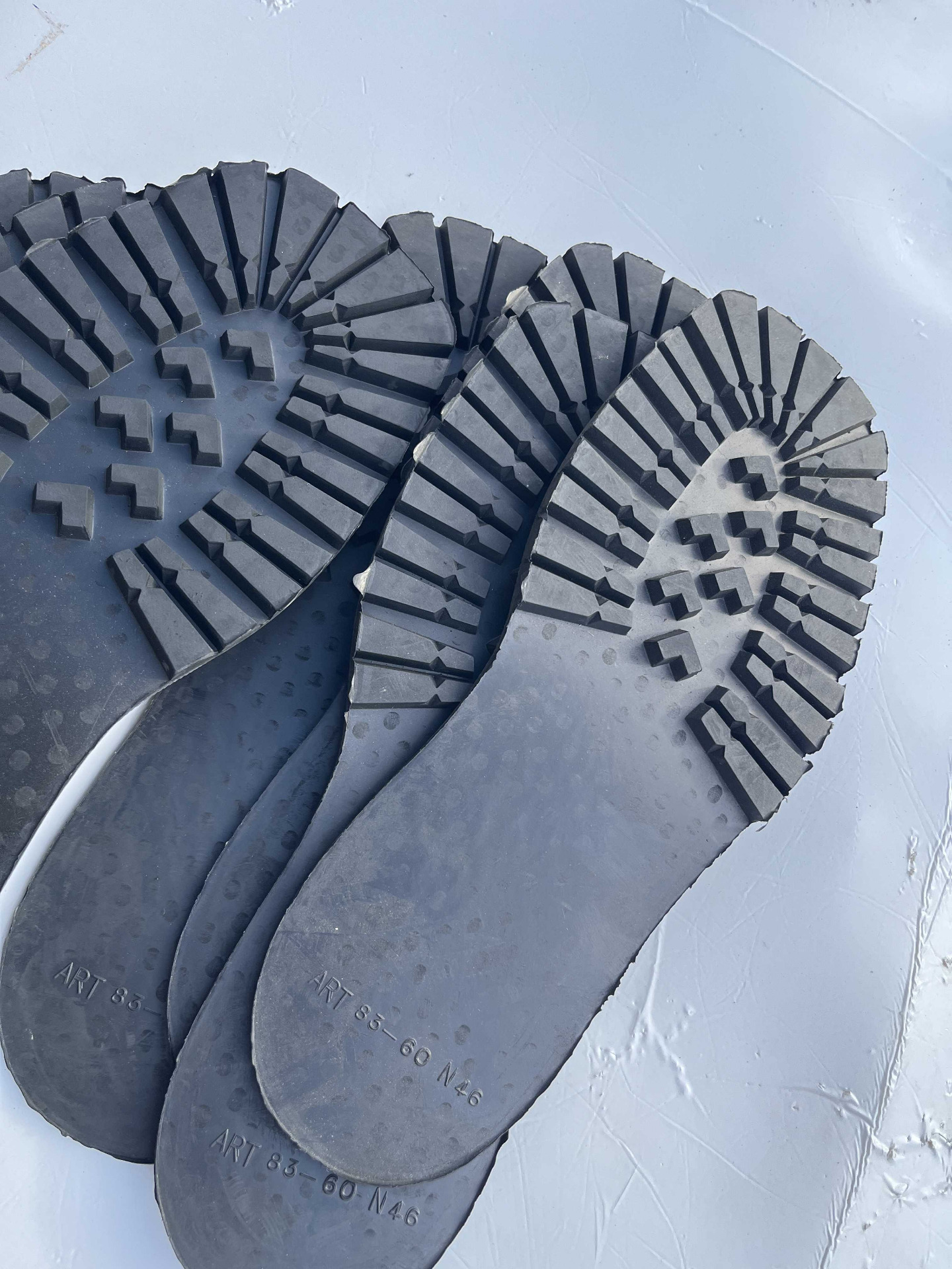 Suole in vera gomma senza tacco, classico disegno carrarmato colore nero, cardate nella parte retro, numerazione unica 46 lotto da 11 paia.