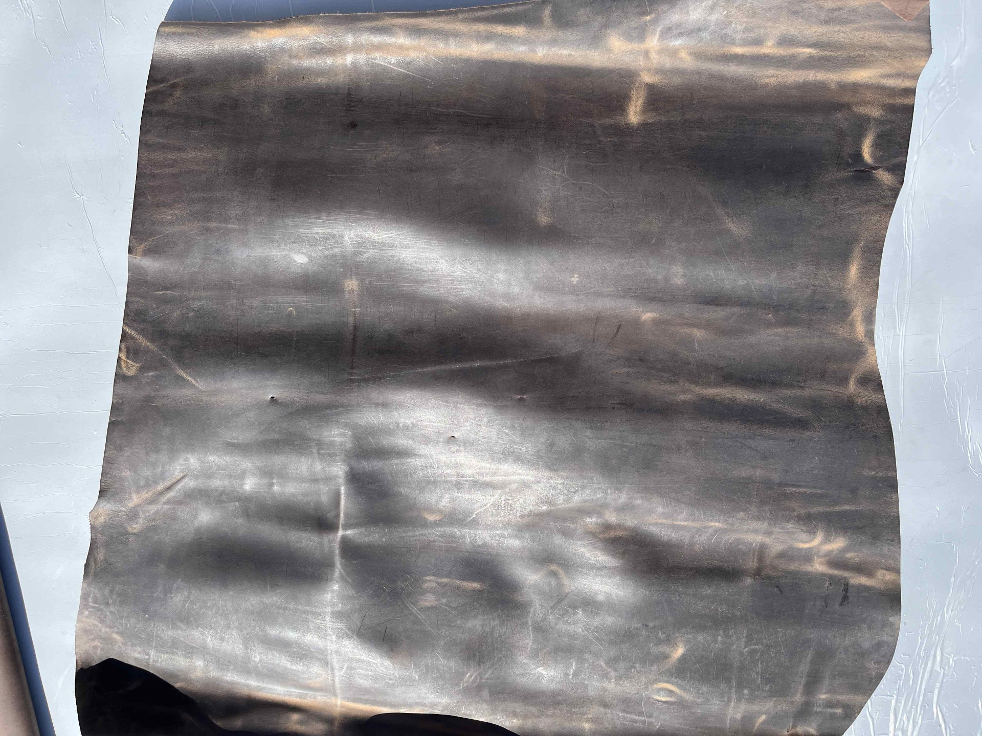 Pellame di vitello trattamento Crazy Horse (pull-up) cerato effetto schiarente, anilina pura di botte senza nessuna correzione in rifinizione, mano morbida e pastosa al tatto, ideale per borse, borselli, cartelle, zaini, portachiavi, legatoria e molto altro.