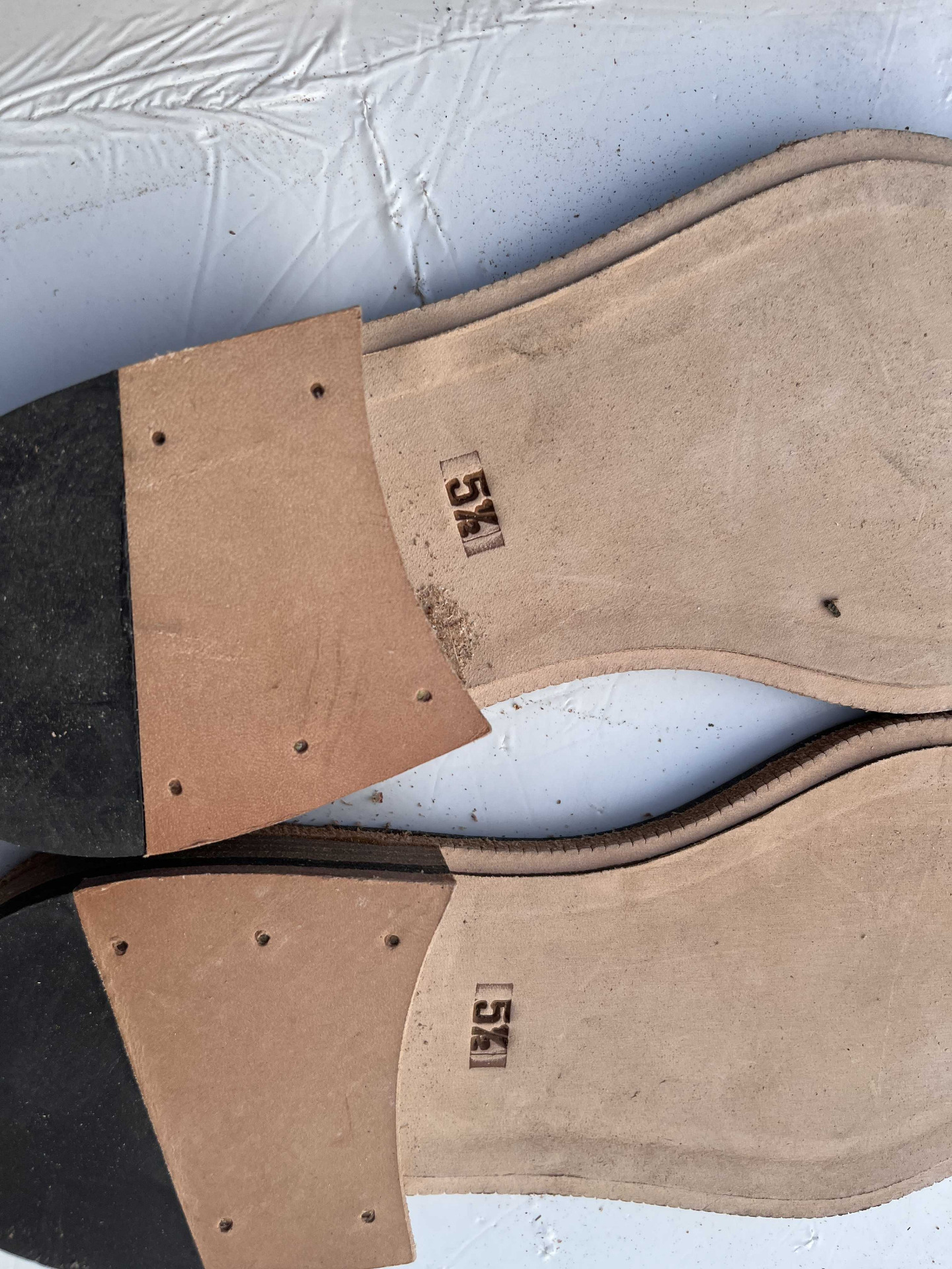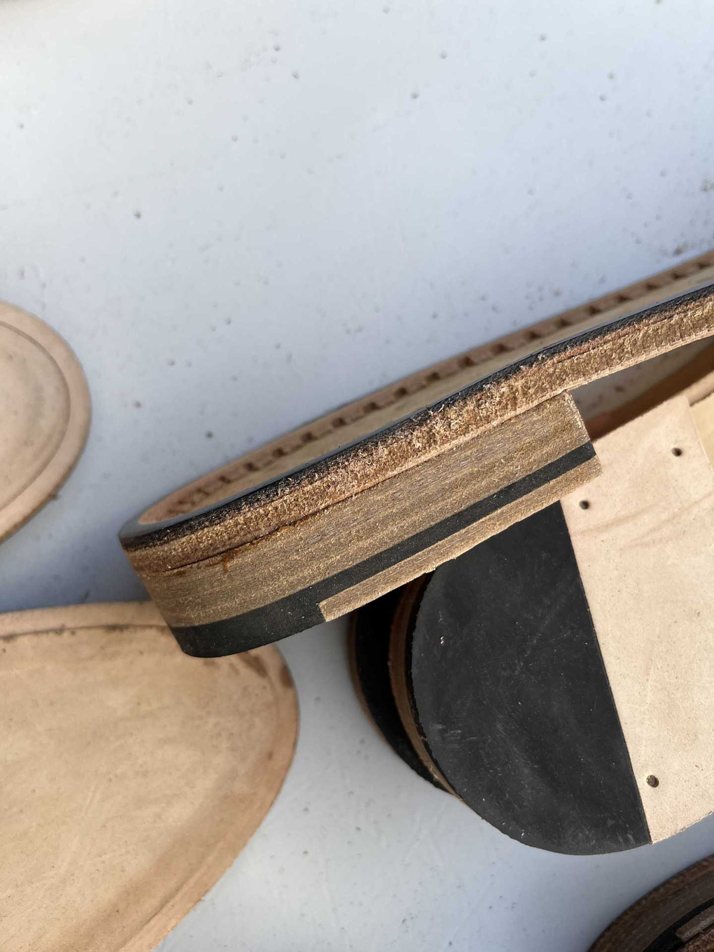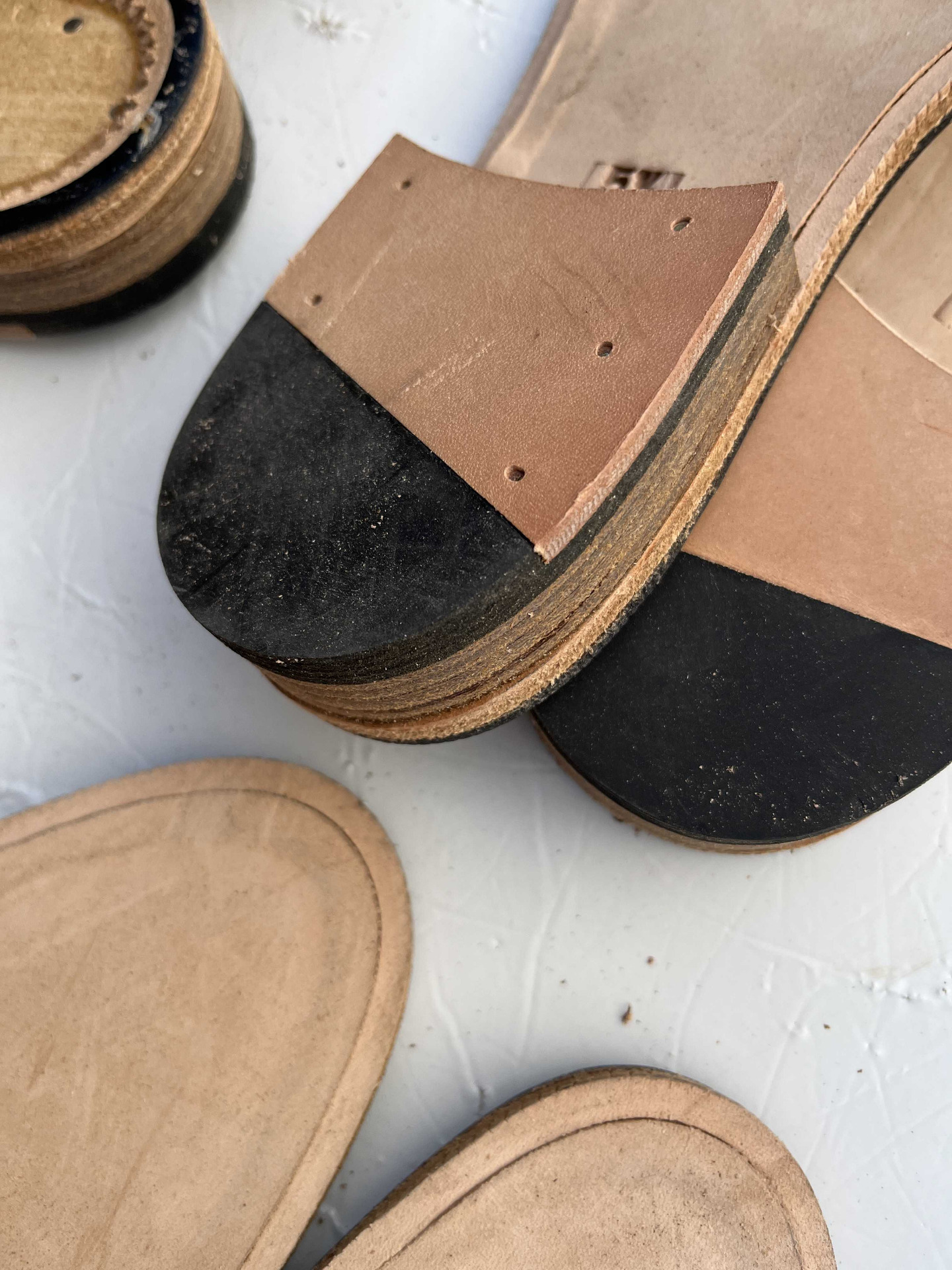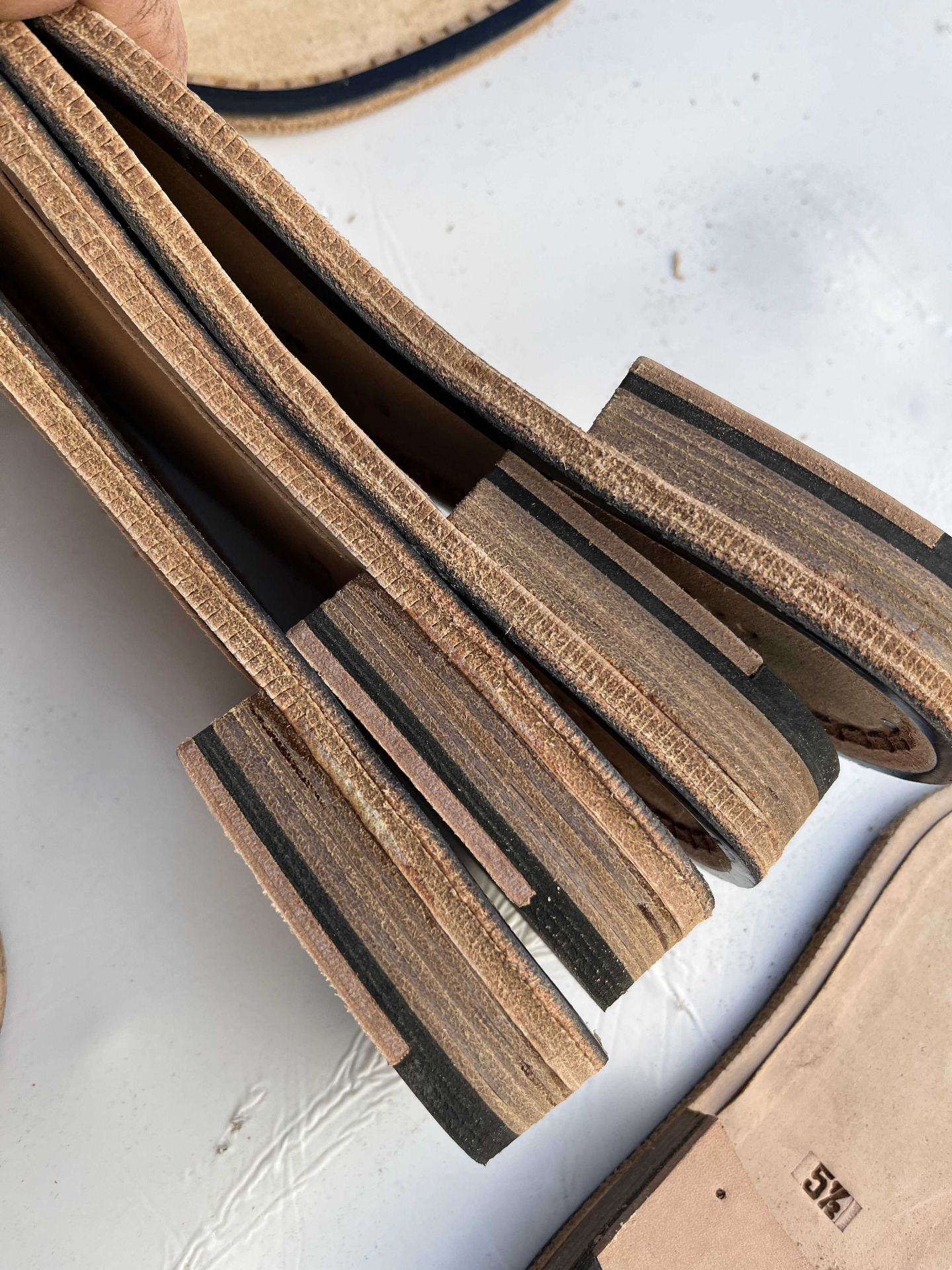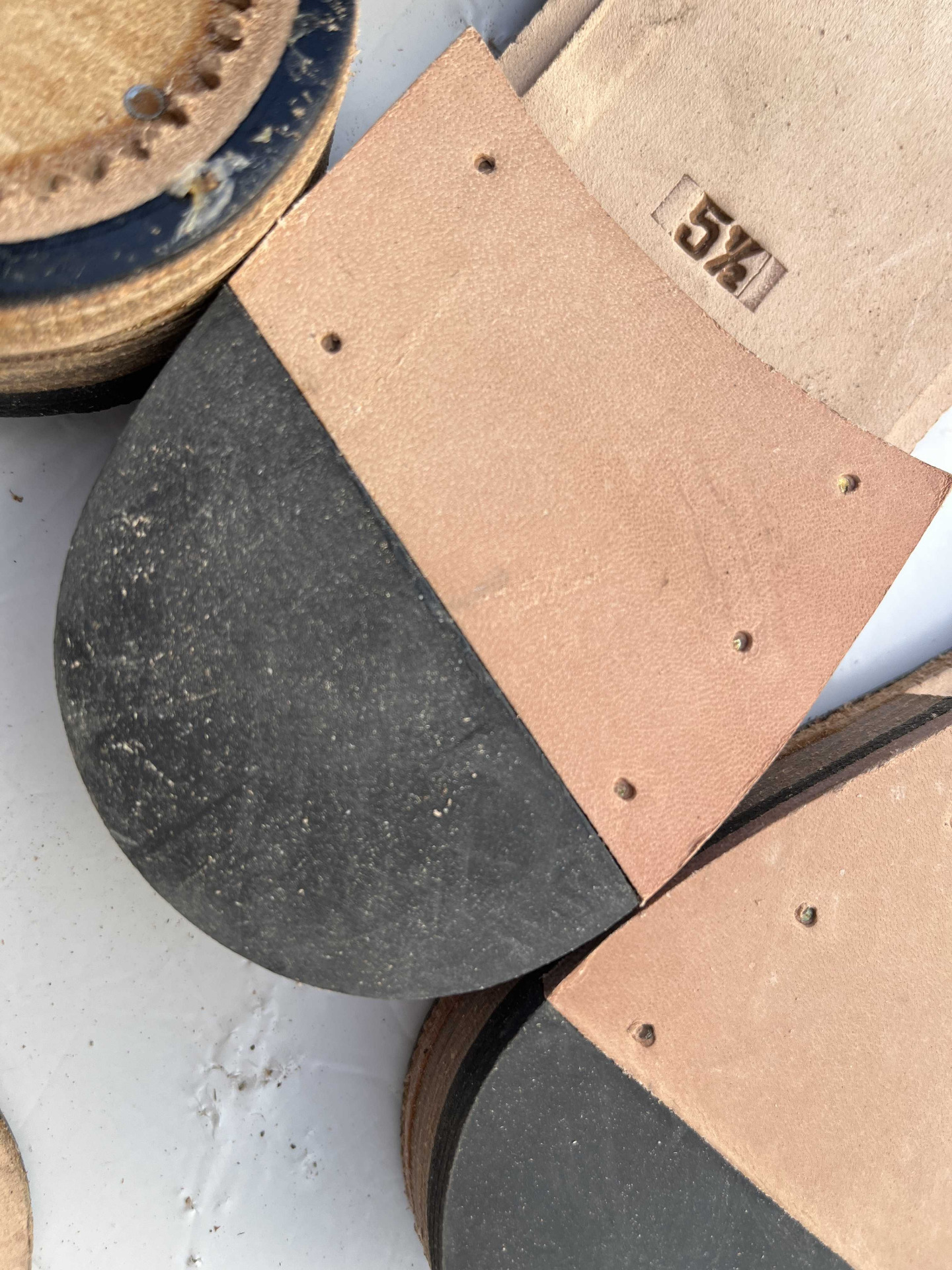 Suola in vero cuoio complete di tacco in cuoio e guardolo, semilavorate, rimanenza di produzione.