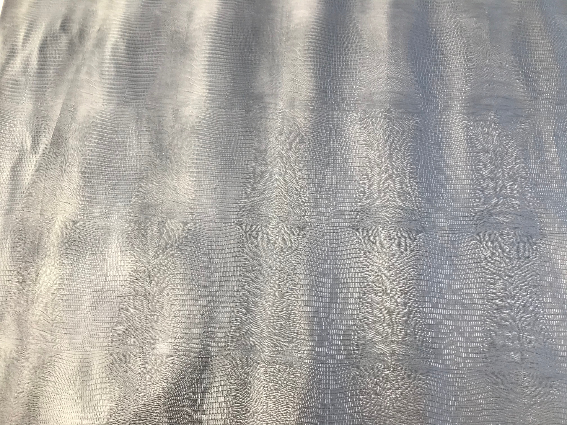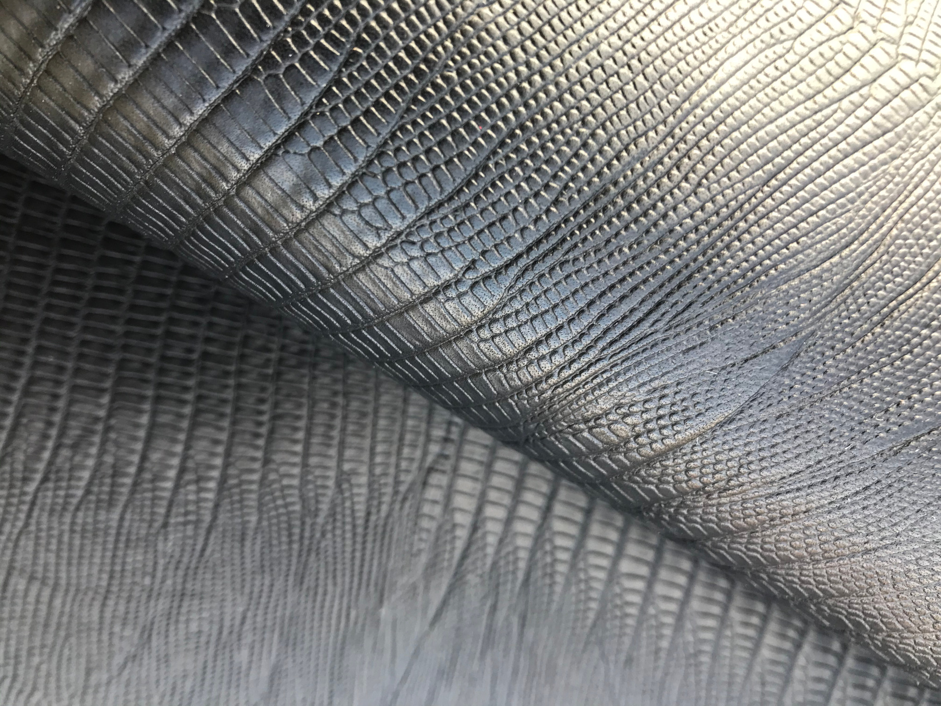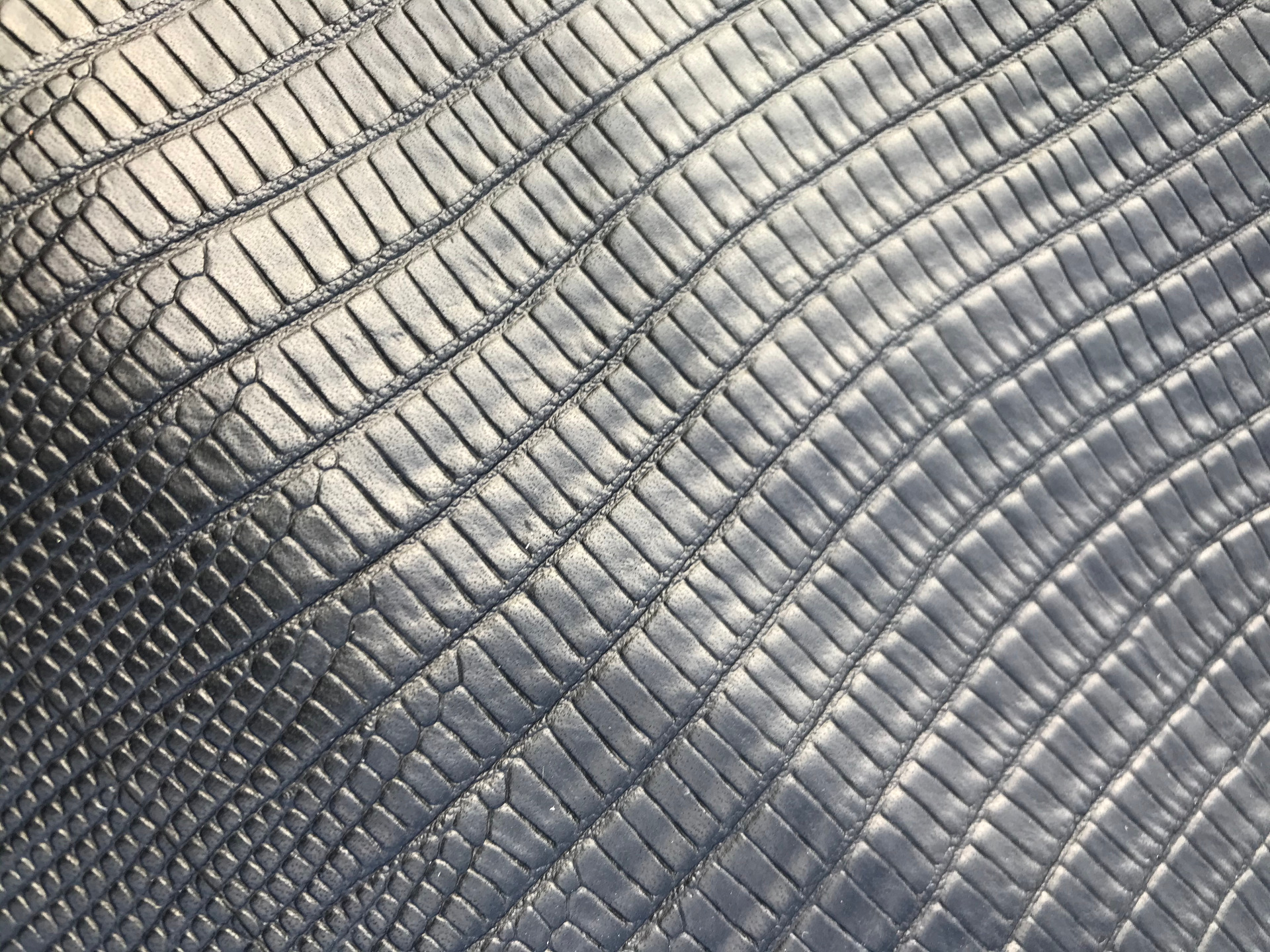 Spalla a vegetale di colore nero stampata con la caratteristica in rilievo effetto lucertola, finitura liscia, mano rigida e aspetto semilucido, pellame ideale per la produzione di alta pelletteria, borse, cinture, cinturini, legatoria e molto altro.