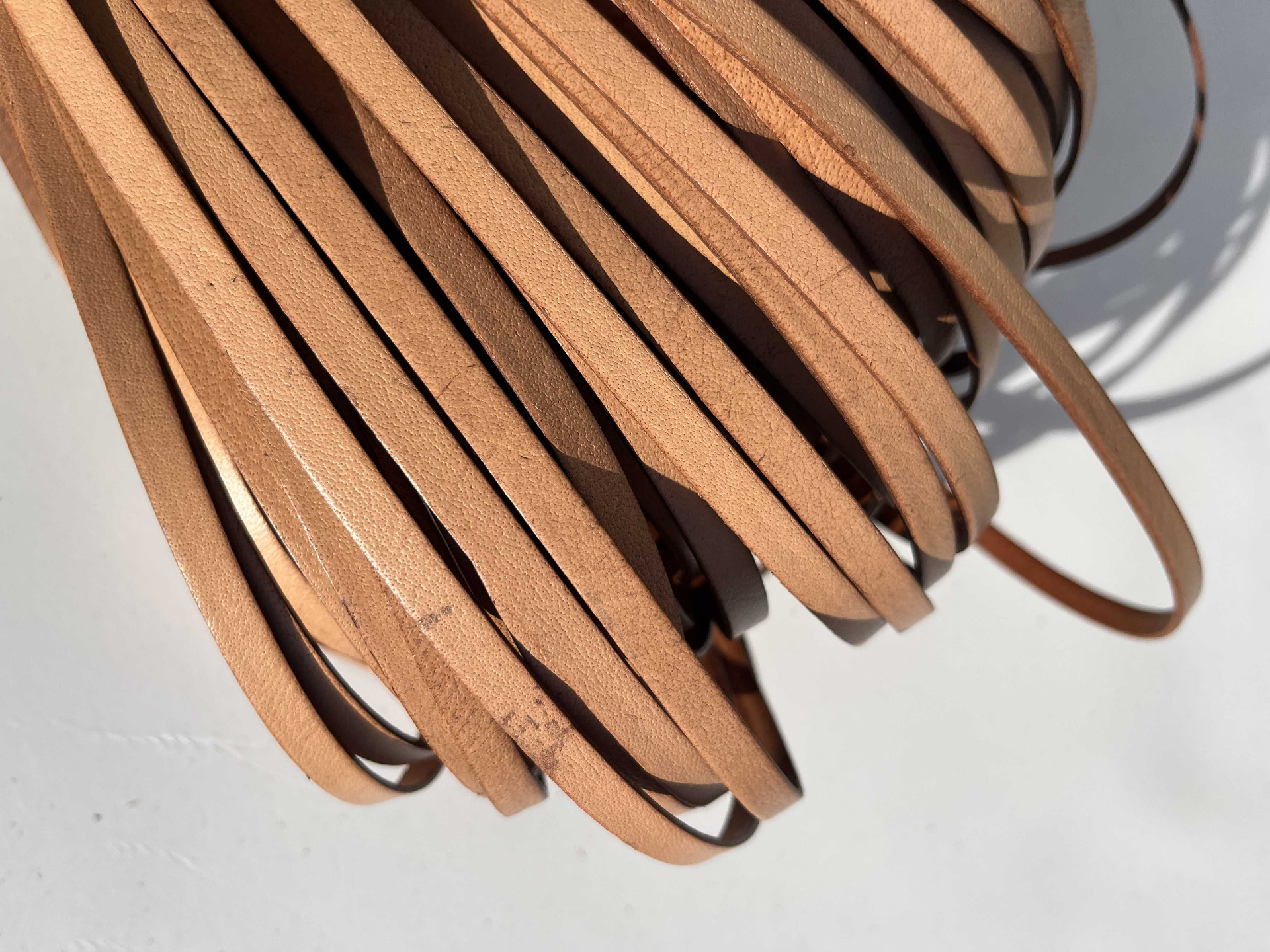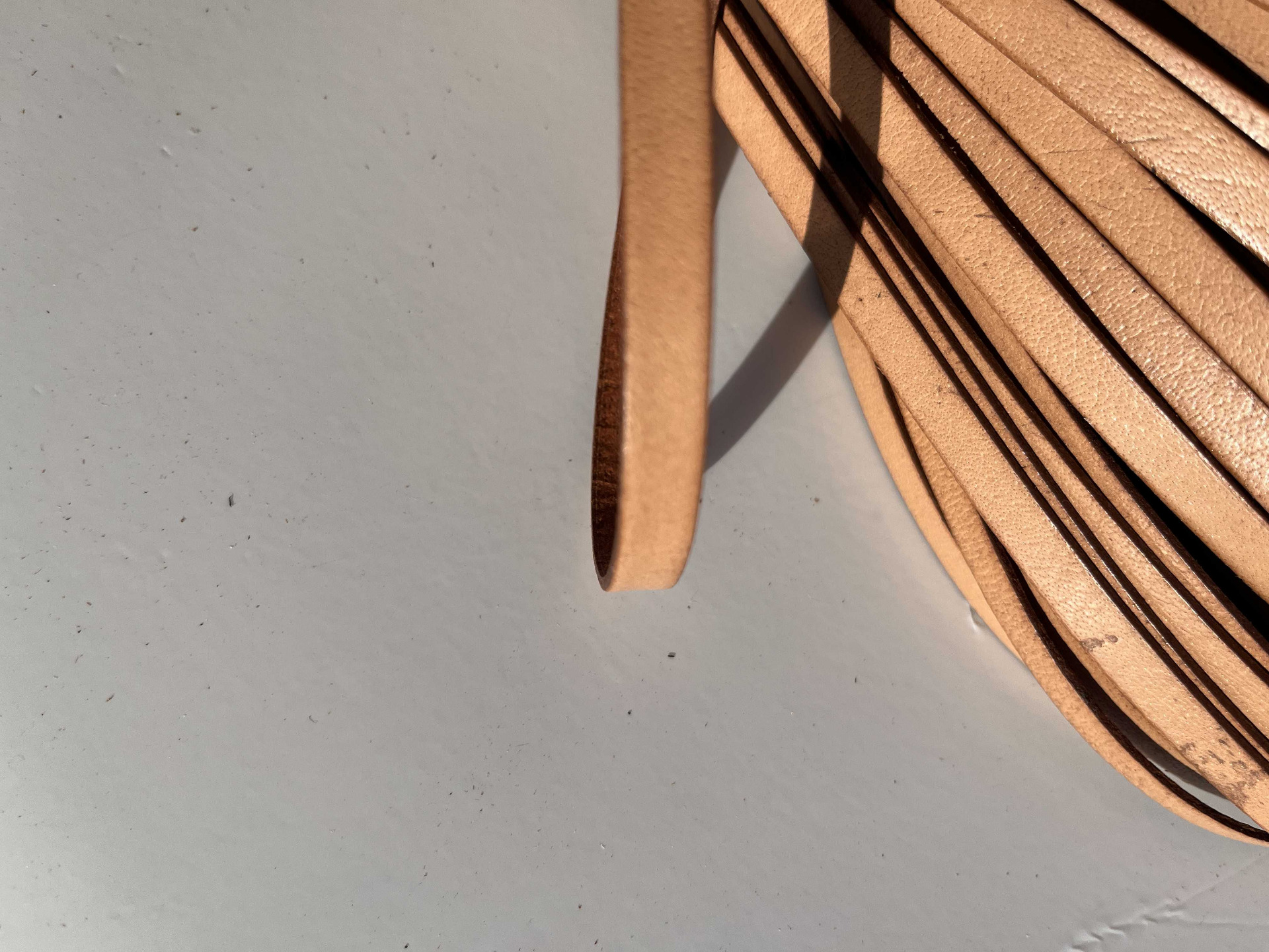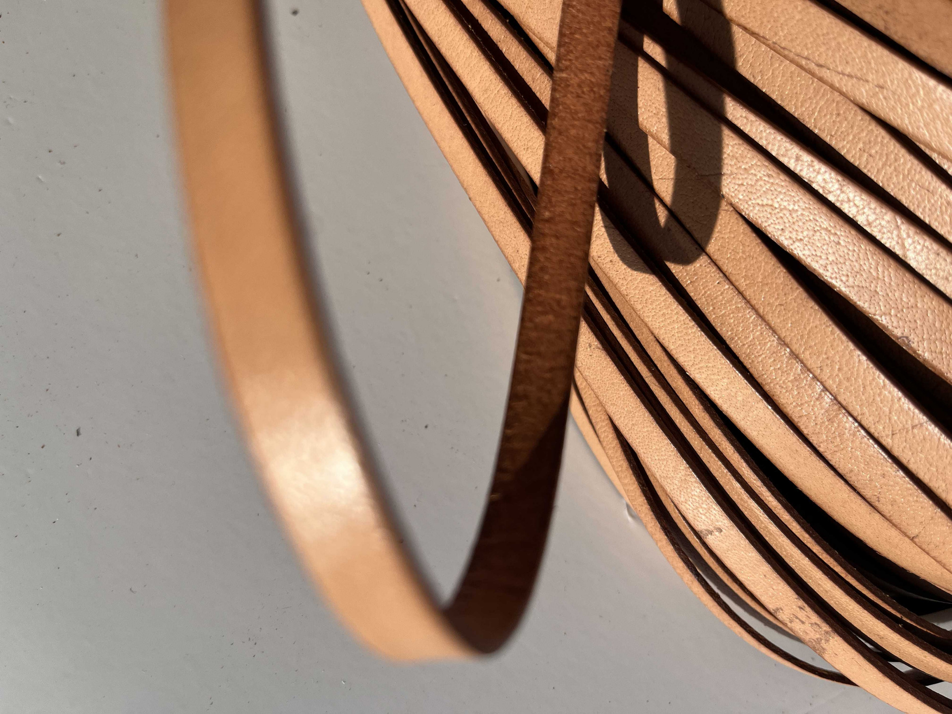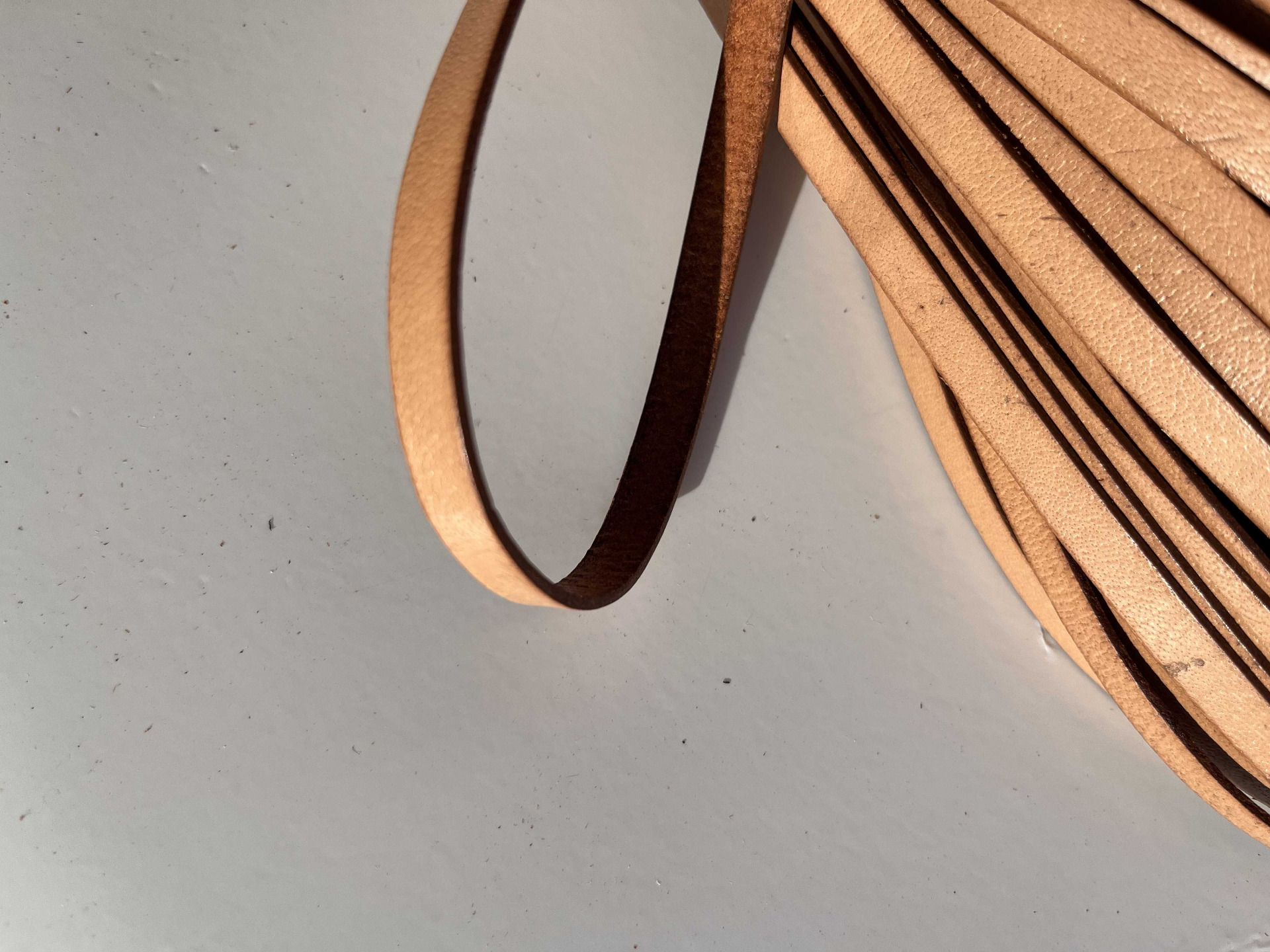 Nastro in pelle a vegetale Naturale H 8 millimetri in vera pelle bovina conciata al vegetale naturale, segni, imperfezioni e alterazioni di colore non sono da considerarsi difetti, ma certificano la genuinità della materia prima esclusivamente naturale. semi rigido, cucitura centrale, ampiamente utilizzato nel settore della pelletteria e calzatura , pronto per essere utilizzato per la creazione di cinturini, collari, tracolle, infradito, sandali, ciabatte e molto altro.