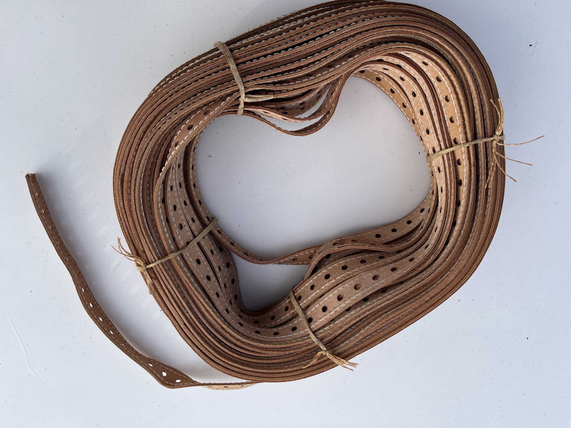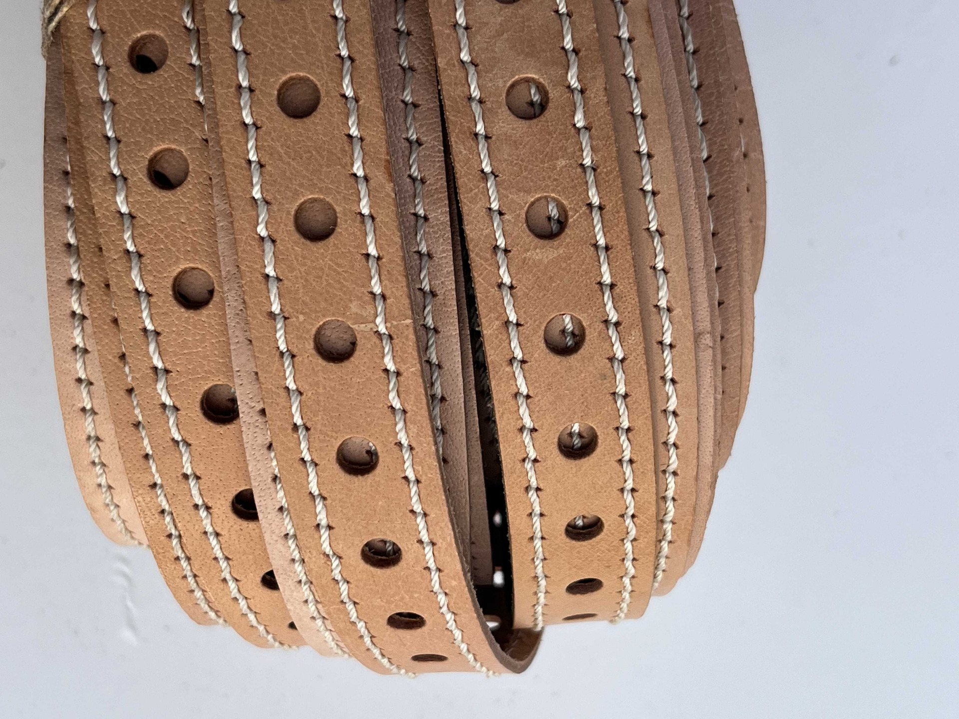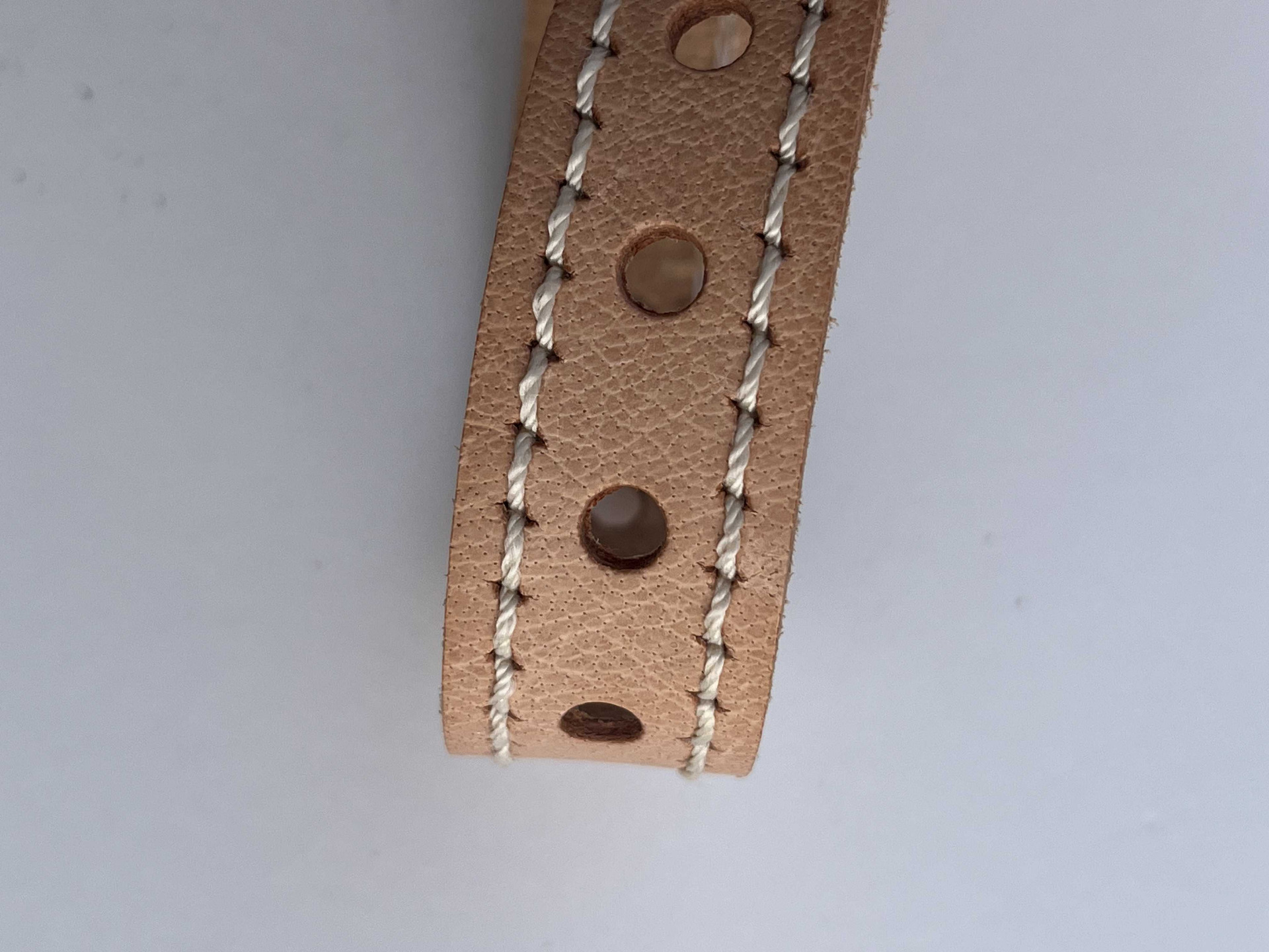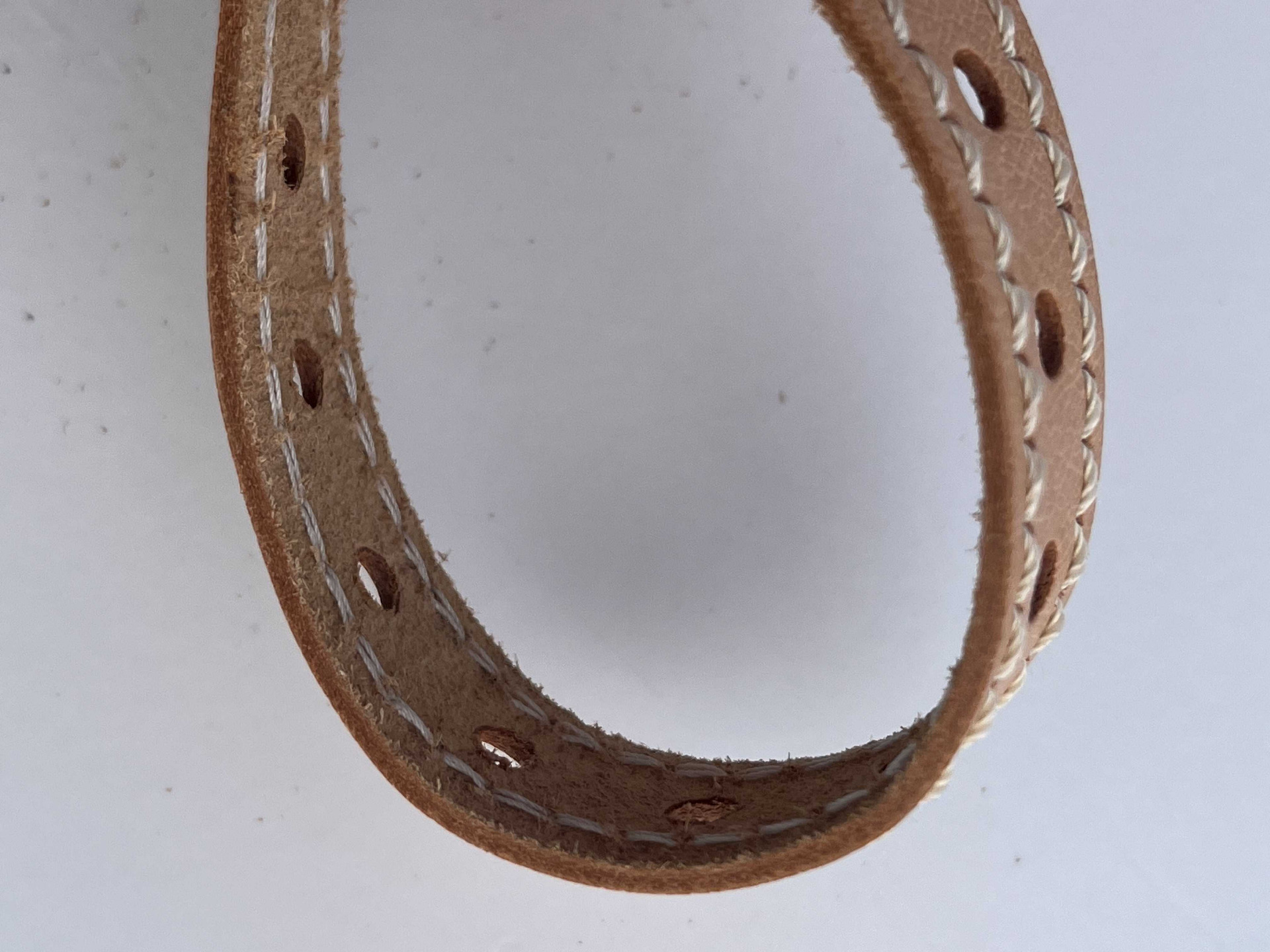 Nastro in pelle a vegetale Naturale H 20 millimetri in vera pelle bovina conciata al vegetale naturale, foratura centrale, segni, imperfezioni e alterazioni di colore non sono da considerarsi difetti, ma certificano la genuinità della materia prima esclusivamente naturale, pellame a poro aperto ad elevata penetrazione (no ingrasso al sego) ideale per lavorazione e tamponatura con aniline e cere, semi rigido, cuciture laterali, ampiamente utilizzato nel settore della pelletteria per la creazione di cinturini, collari e molto altro.