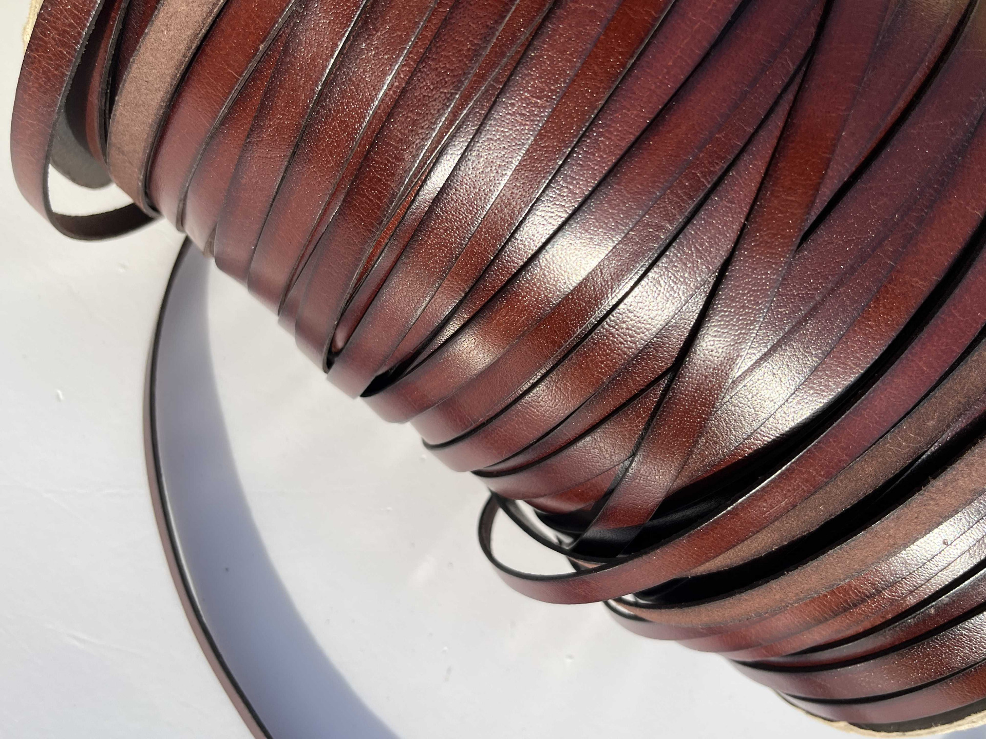 Nastro in vera pelle liscio piatto, larghezza 10 millimetri in vera pelle bovina conciata al vegetale, anilina segni e imperfezioni non sono da considerarsi difetti, ma caratteristiche naturali, semi rigido, ampiamente utilizzato nel settore della pelletteria e calzatura , pronto per essere utilizzato per la creazione di cinturini, collari, tracolle, infradito, sandali, ciabatte e molto altro.