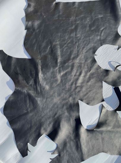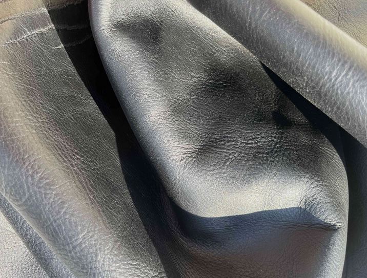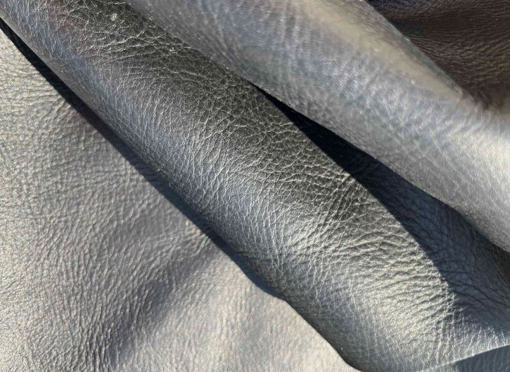 Pellame di vitello bottalato colore nero con una mano piena e morbida, alto spessore, pieno fiore, grana naturale, aspetto semi lucido, anilina pura di botte senza nessuna rifinizione in superficie, segni e imperfezioni non sono da considerarsi difetti, ma caratteristiche naturali, ideale per la produzione di piccola pelletteria, selleria, calzature e molto altro.