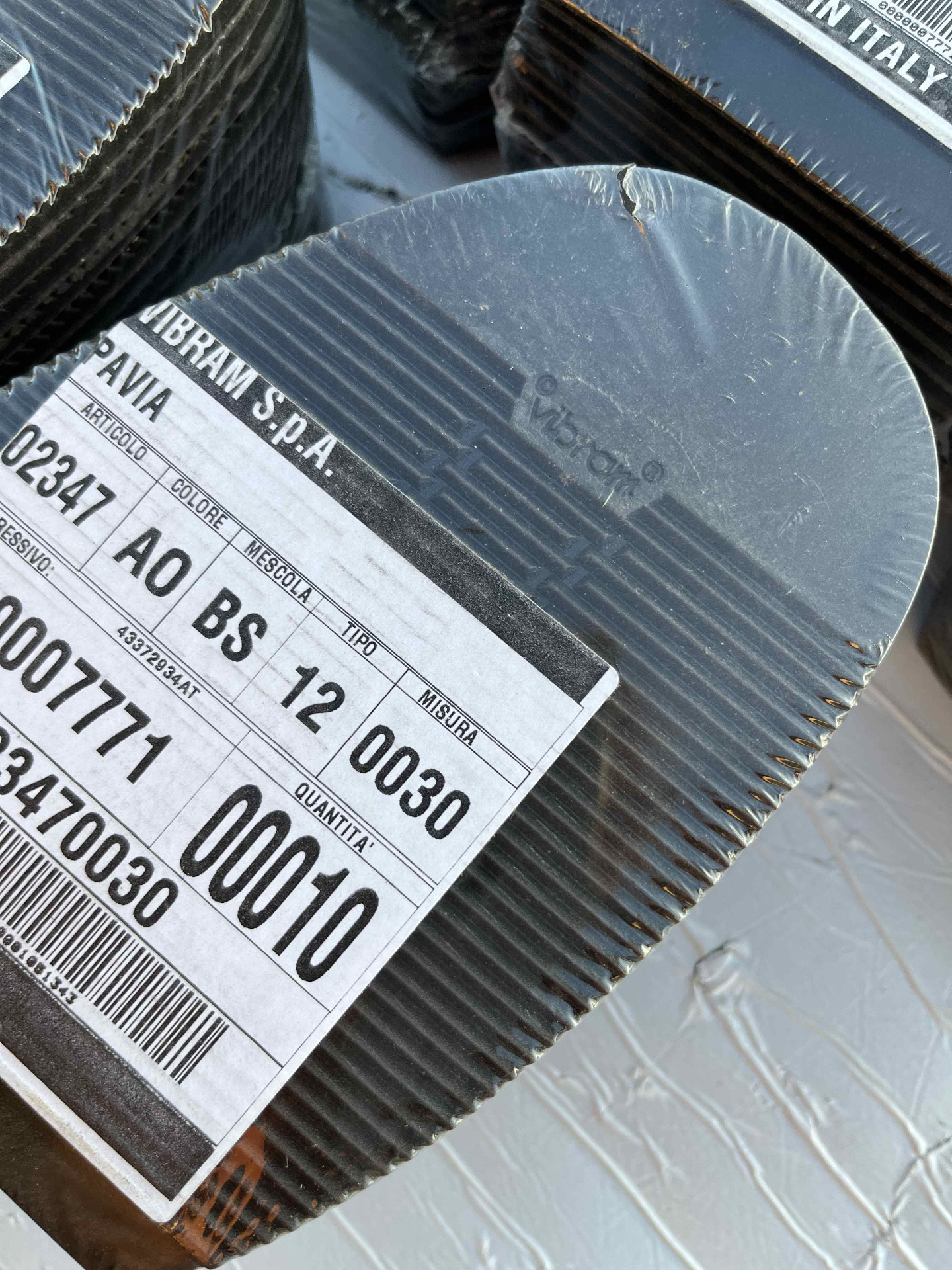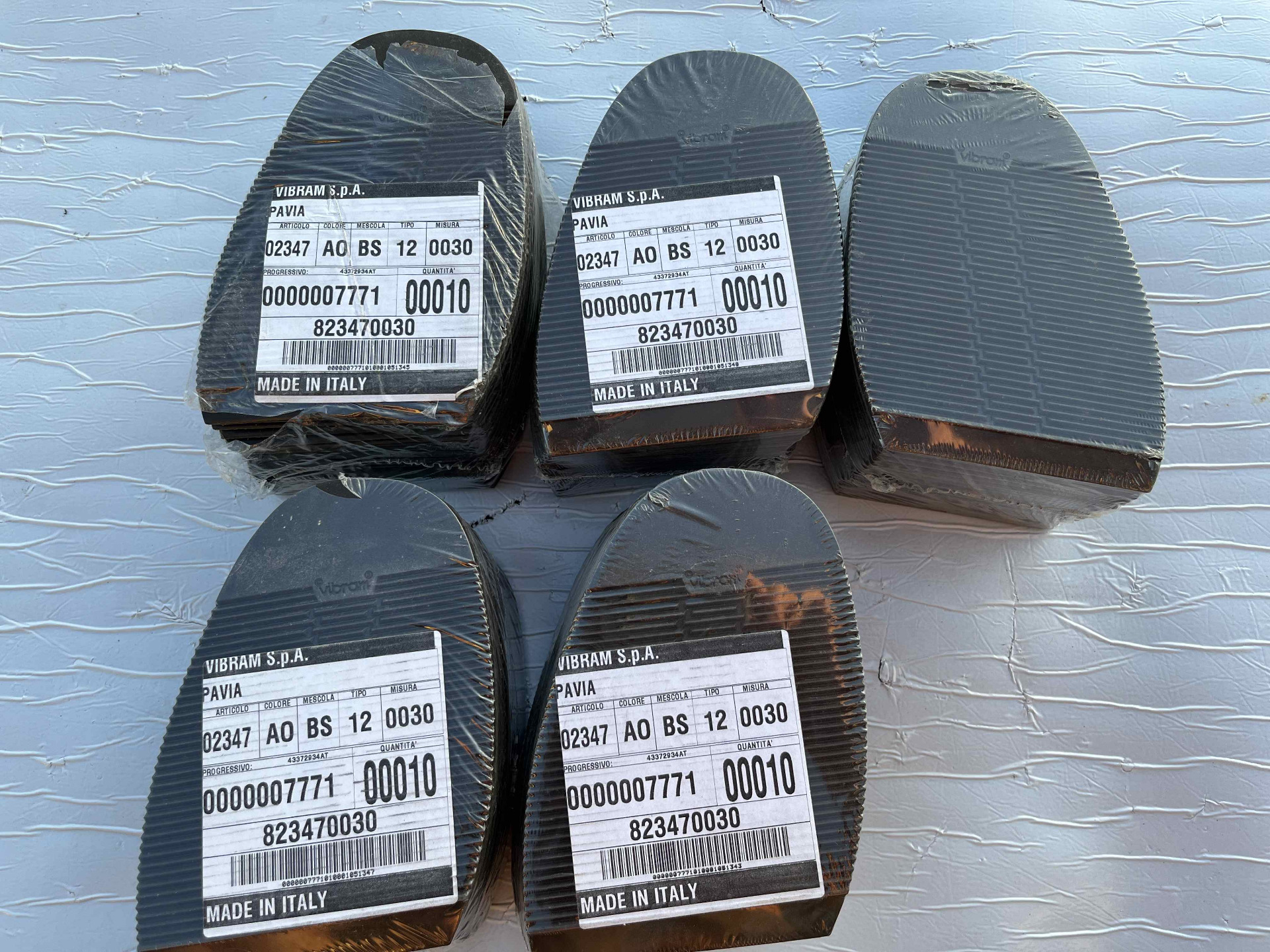 Lotto mezze suola per riparazioni scarpe uomo in gomma compatta della Vibram, colore marrone in confezioni da 10 paia con etichetta di produzione.