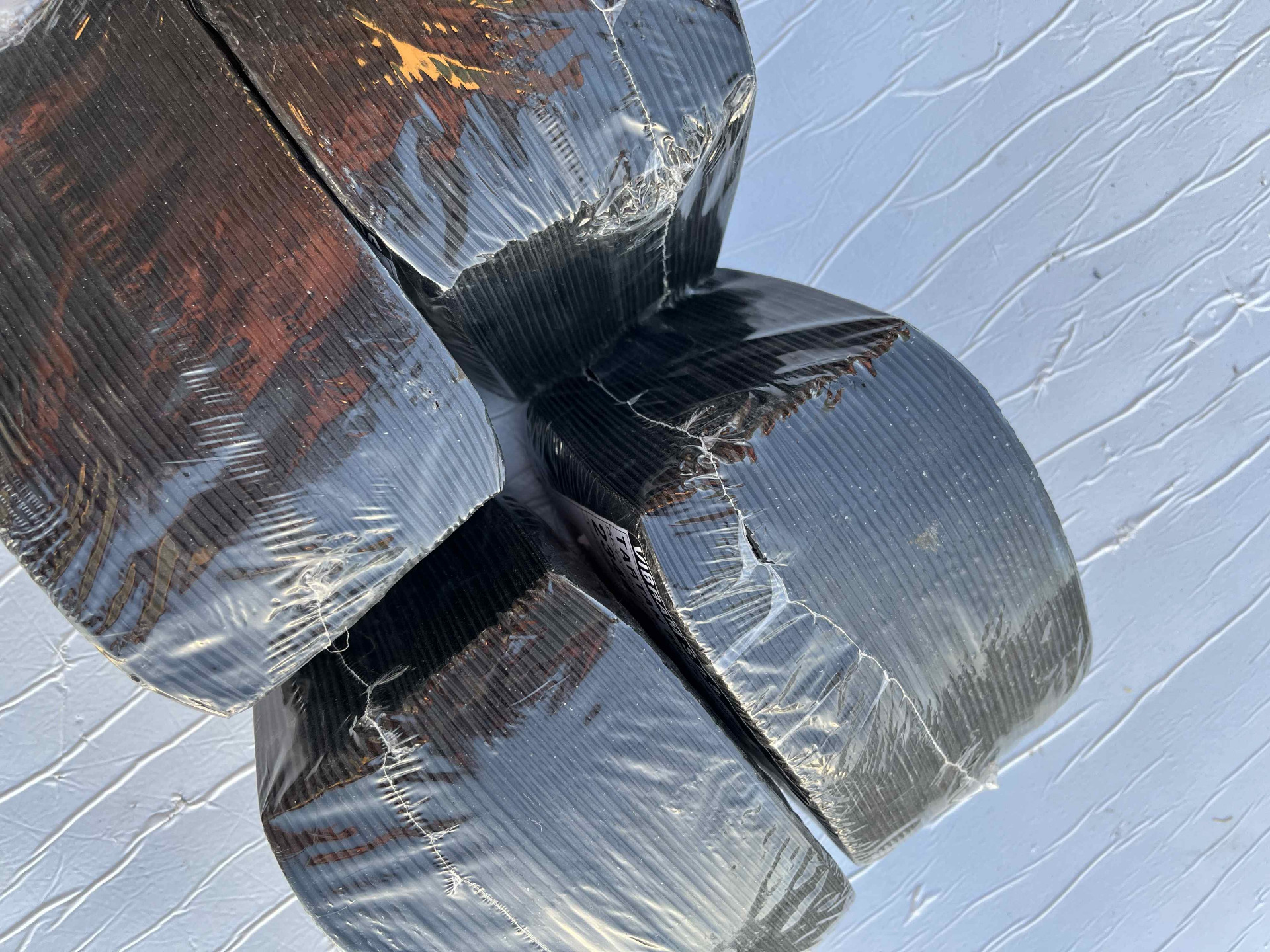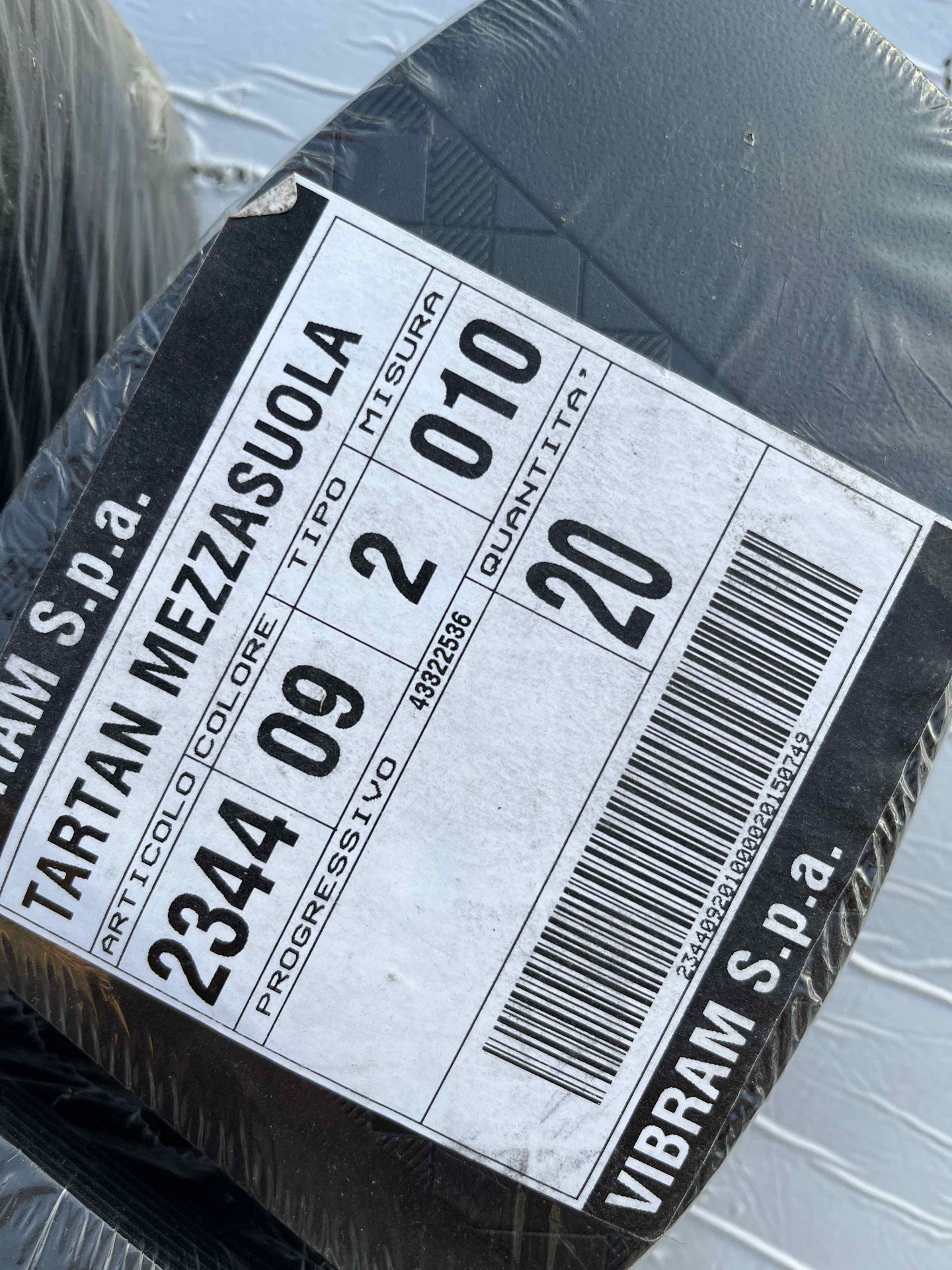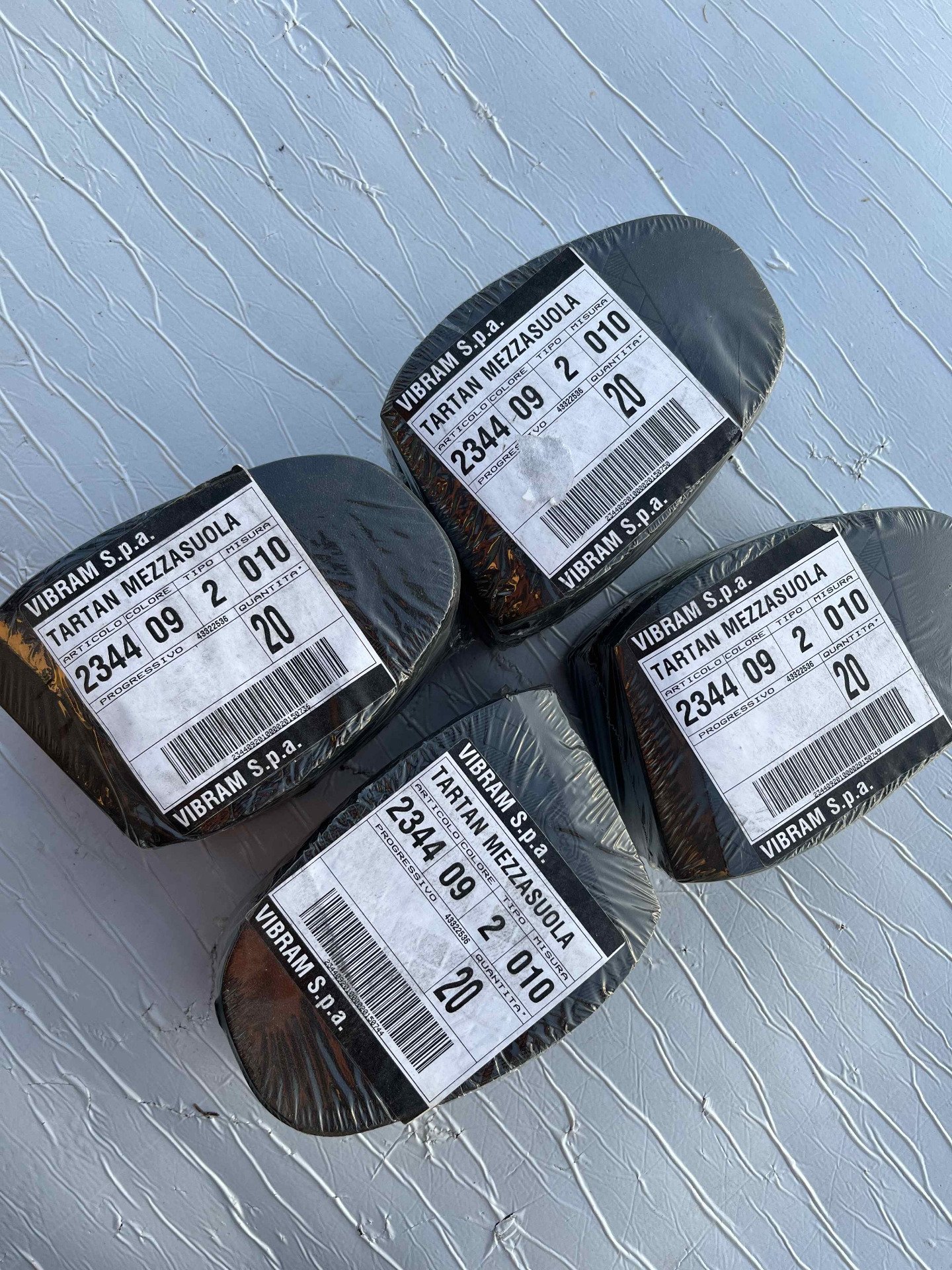 Lotto mezze suola per riparazioni scarpe uomo in gomma compatta della Vibram, colore nero in confezioni da 20 paia con etichetta di produzione.