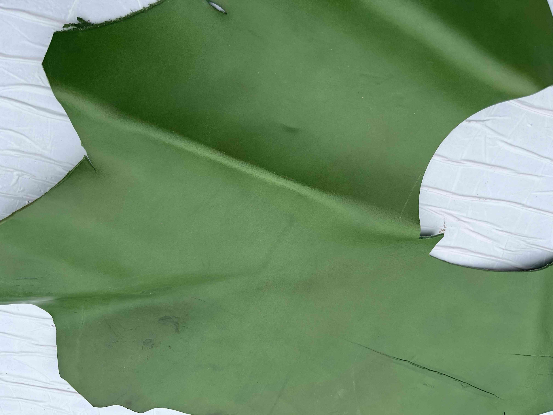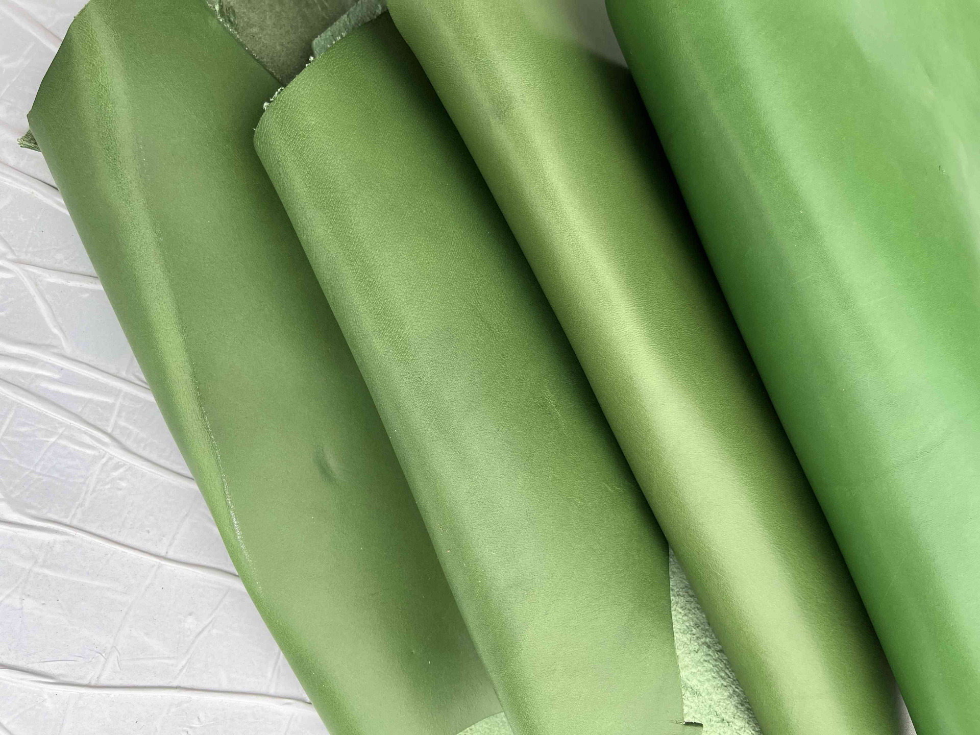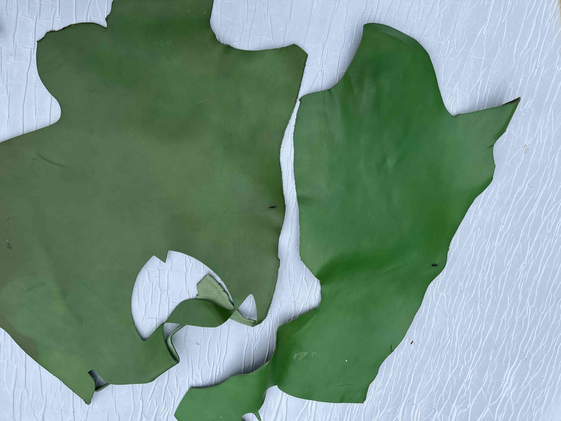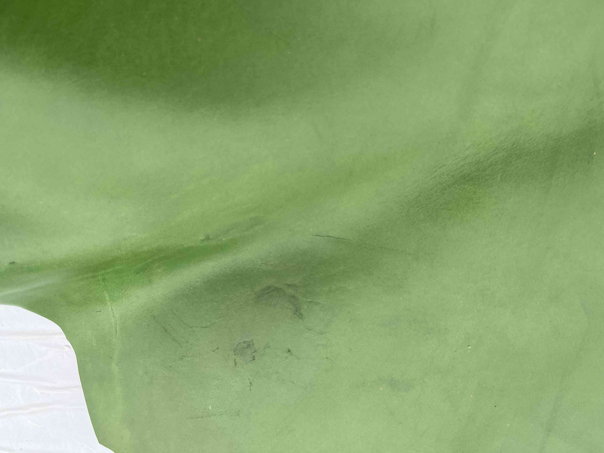 Pellame conciato 100% a vegetale liscio, scampoli di forma irregolare, grana naturale di colore verde pistacchio, ideale per hobby creativi e piccoli articoli di pelletteria.