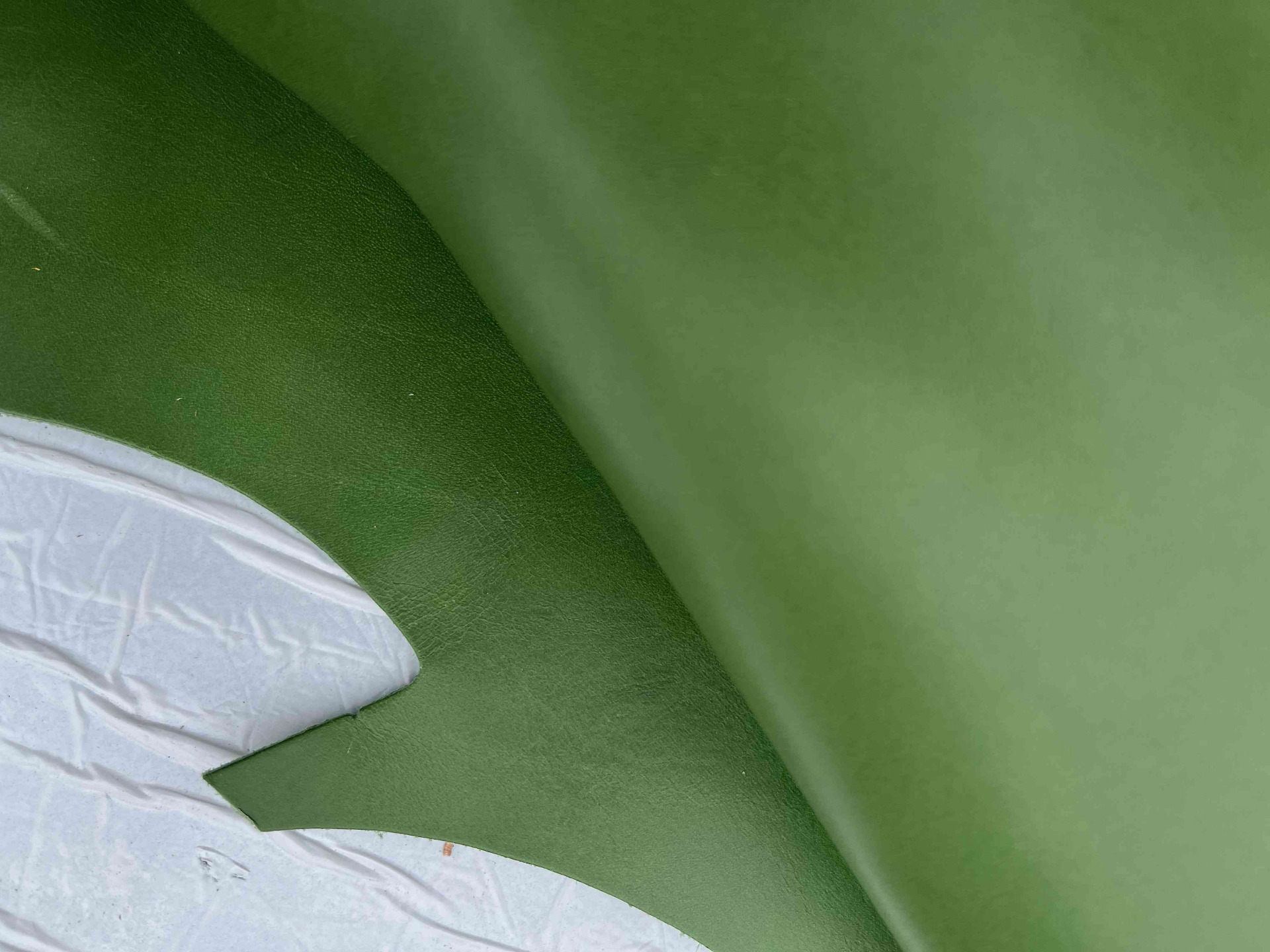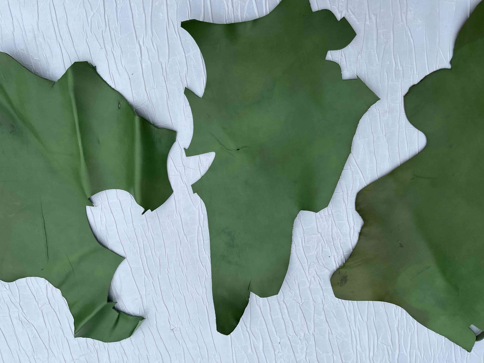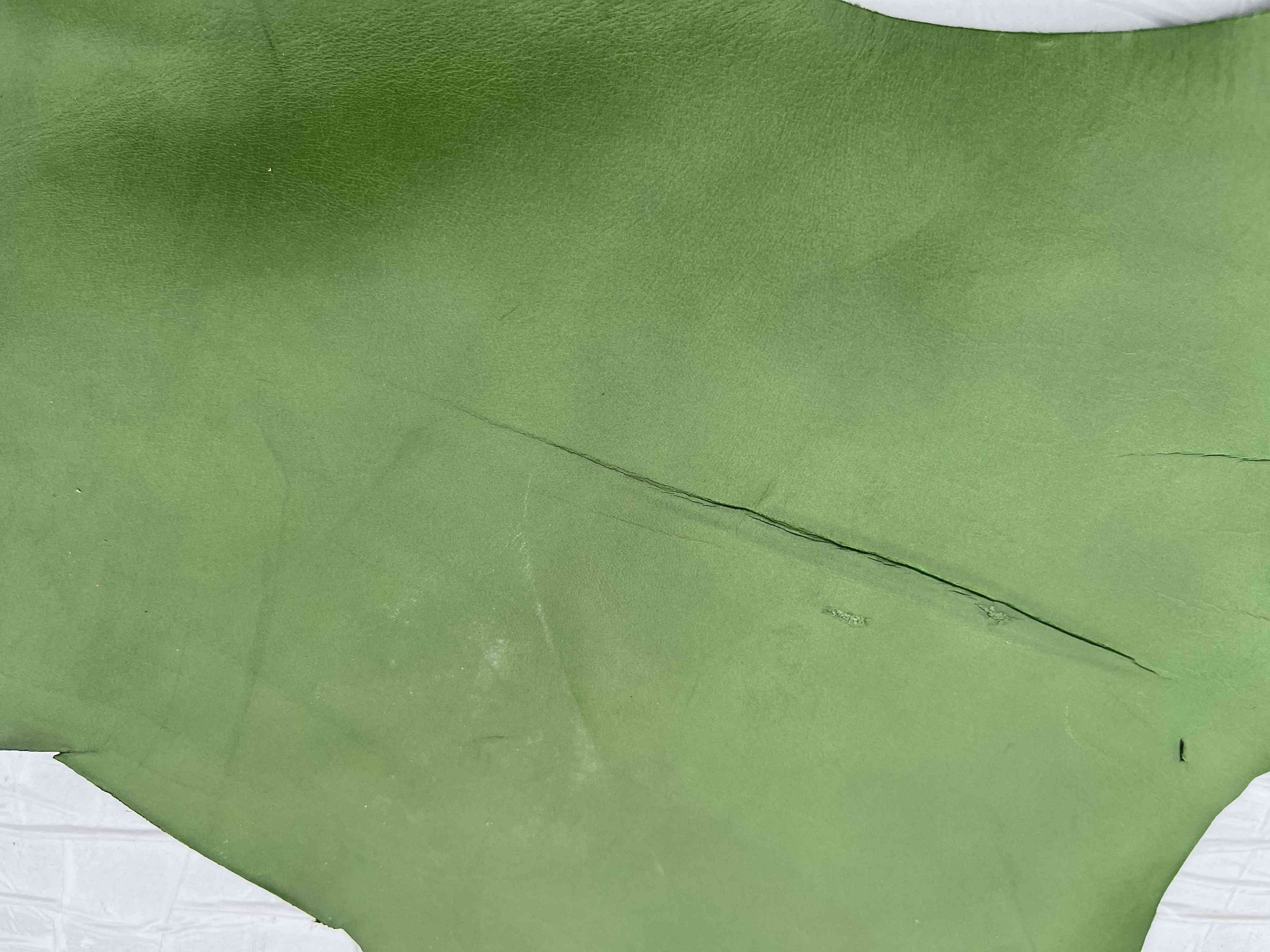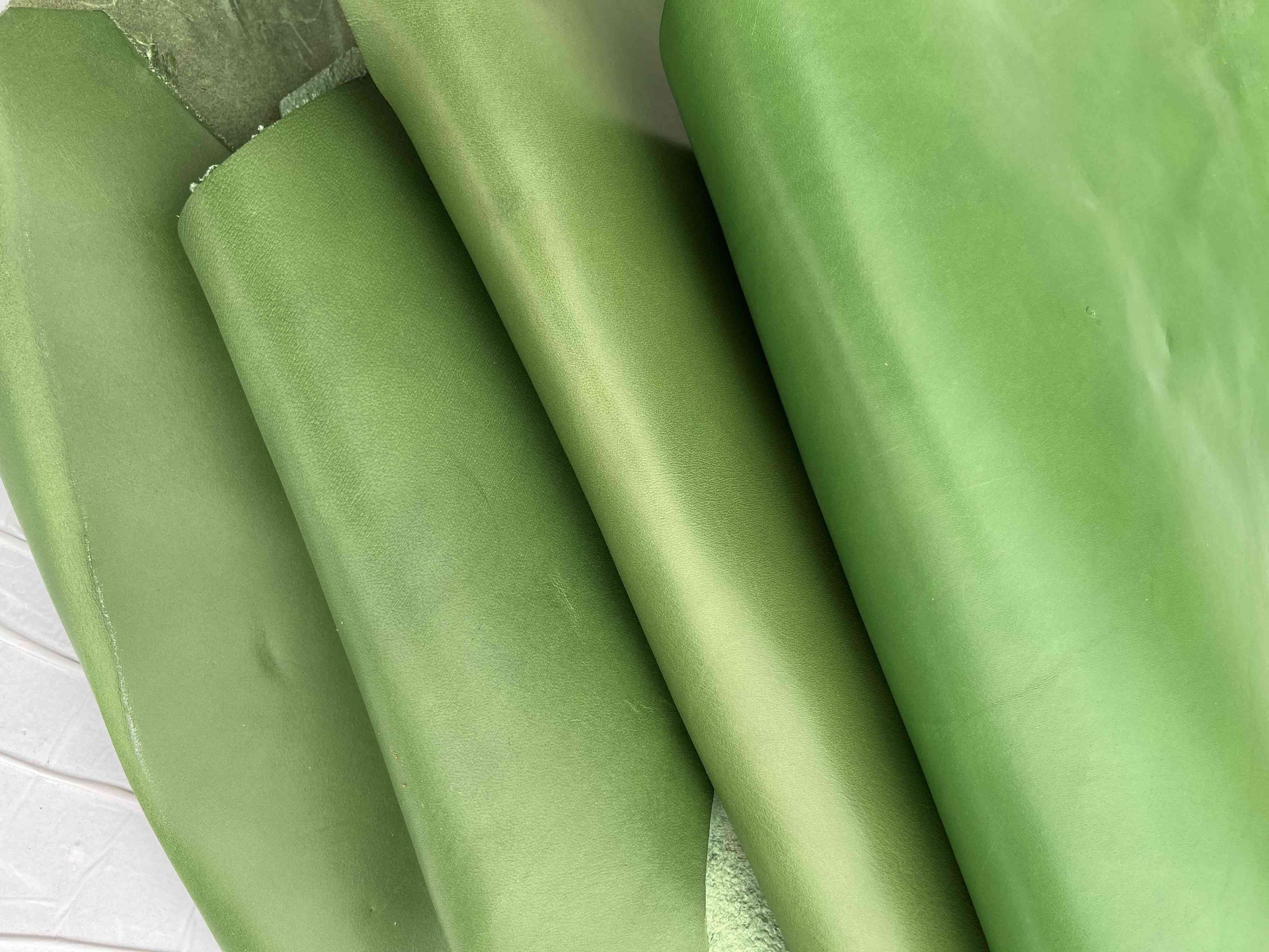 Pellame conciato 100% a vegetale liscio, scampoli di forma irregolare, grana naturale di colore verde pistacchio, ideale per hobby creativi e piccoli articoli di pelletteria.